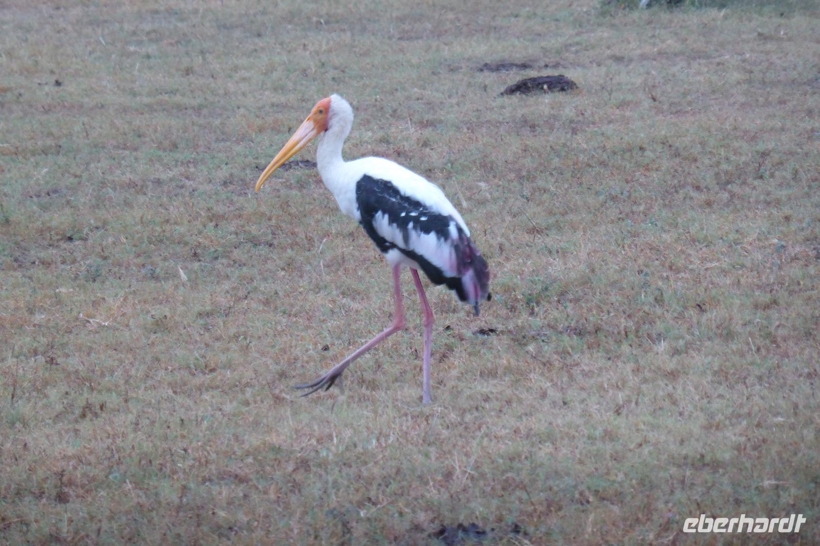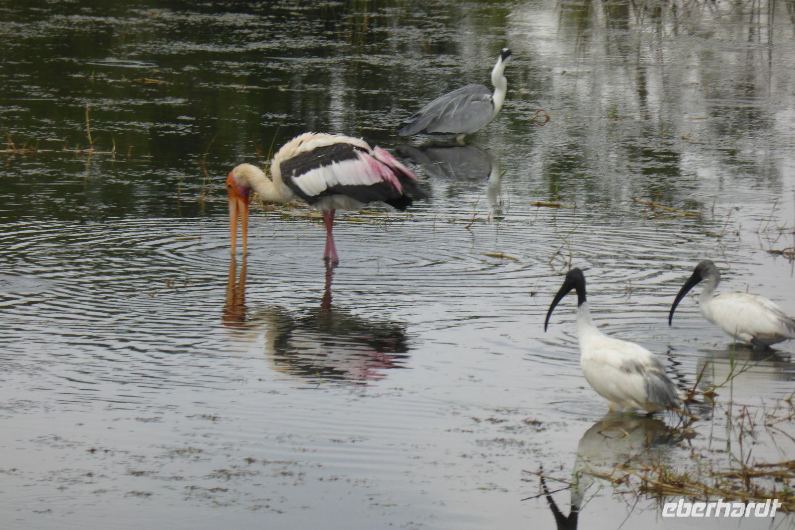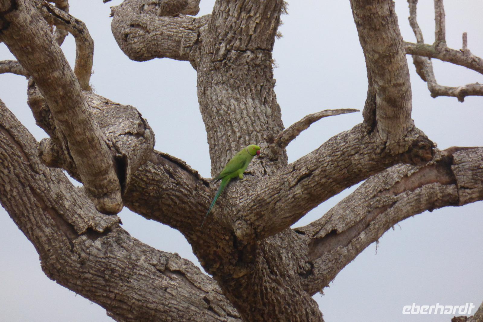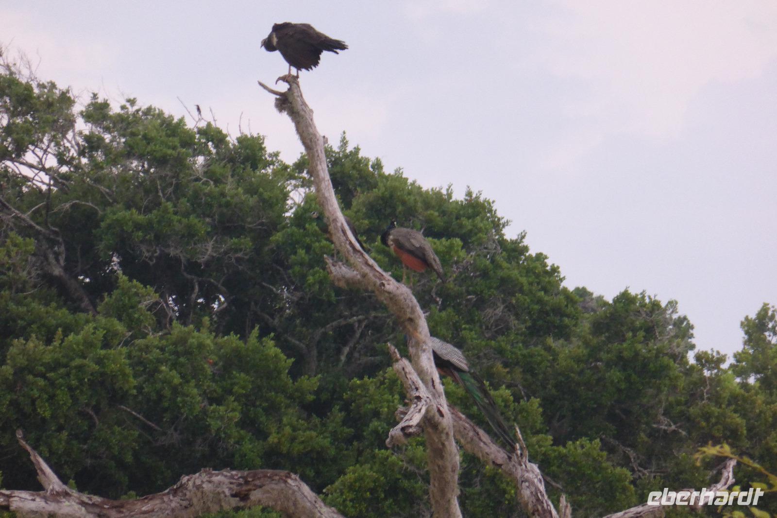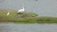 Nach etwas Wartezeit am Eingang des Nationalparks geht es los mit Tierbeobachtungen. Wir sehen viele verschieden Vögel, vom bunten Bienenfresser über Papageien bis zum Adler und verschieden Wasservögeln. Oft sind auch Pfaue zu beobachten. Es gibt auch Wildhühner, Wildschweine, Rehe, Wasserbüffel. Natürlich hoffen wir auch auf Elefant, Krokodil und Leopard. Letzterer wird uns nicht den Gefallen tun. Doch zwei Elefanten sehen wir aus größerer Entfernung im Lotusteich beim Fressen. Krokodile bekommen wir auch zu Gesicht, allerdings im Wasser, fast vollständig abgetaucht auf Beute lauernd.