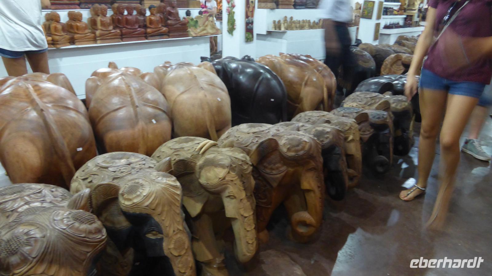 Am Morgen im Bus ist erstmal das Punktesystem einer Frau Thema. Dann halten wir an einer Holzschnitzerei. Interessant ist die Vorstellung der verschieden Holzsorten und die Demonstration wie Naturfarben entstehen. Im riesigen Verkaufsraum ist von der Tischgruppe über den Liegestuhl bis zum Elefanten und Stelzenfischer alles zu haben, nur die Preise gefallen uns überhaupt nicht, da werden wir doch besser beim Straßenhändler zuschlagen.