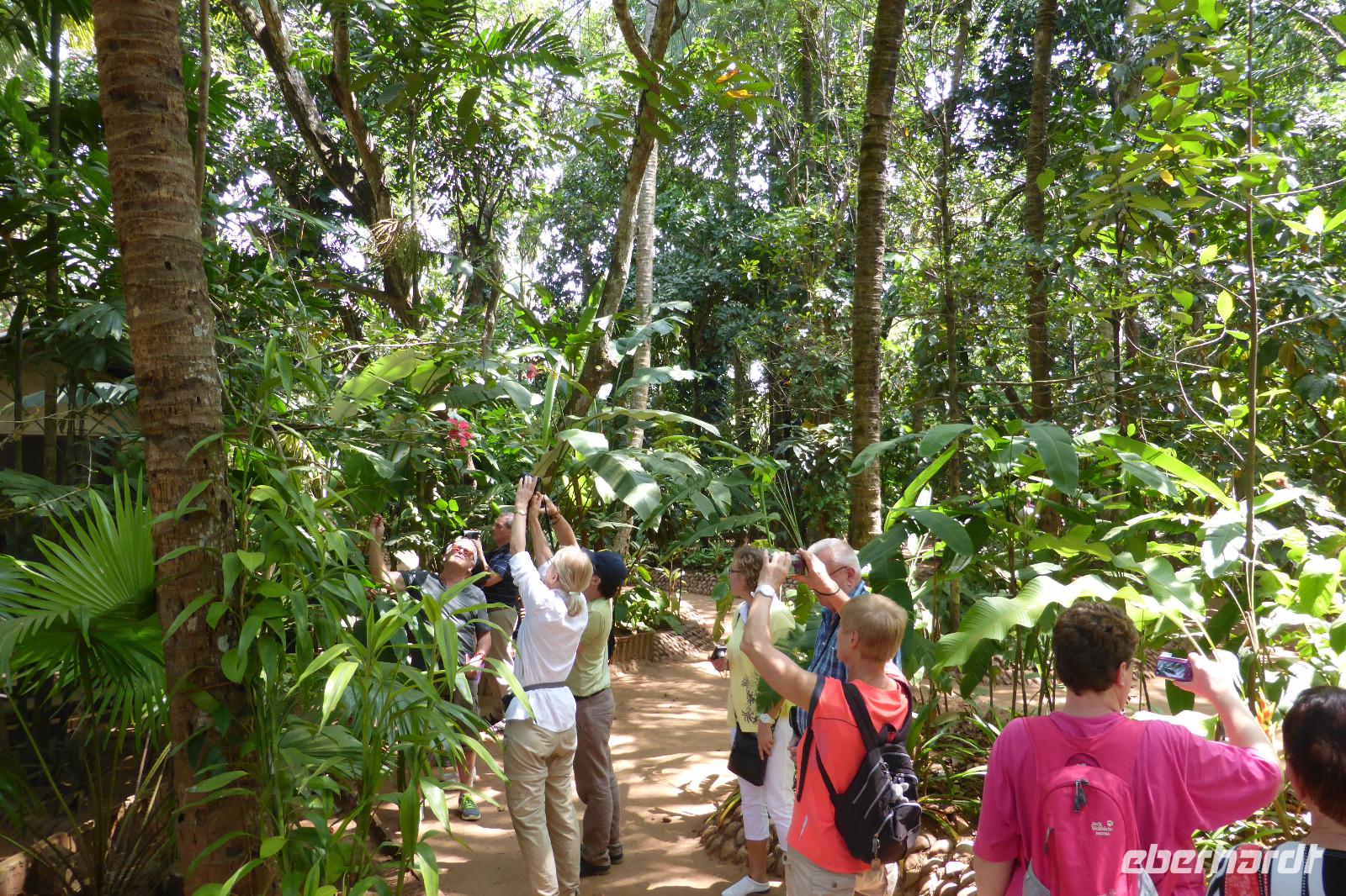 Auf der Weiterfahrt erklärt uns Daya Obstsorten und Landwirtschaft in gewohnt ausführlicher Form. Bei Matale besuchen wir einen der Gewürzgärten dieser Region. Der hiesige Guide spricht sehr gut Deutsch und zeigt uns wie exotische Gewürze wachsen, bevor sie bei uns auf den Tisch kommen. Wir sehen Vanille, Pfeffer, Kakao, Kurkuma, Kaffee, Kardamom, Nelken u. a. m. Zur Demonstration eines Enthaarungsmittels auf pflanzlicher Basis opfern sich Frank und Frank. (Jetzt, eine Woche später auf den Malediven ist die Stelle immer noch glatt wie Babypopo.) Das angenehme an diesem Kräutergarten ist ihr Rundumprogramm. Nachdem wir den Garten besichtigt haben, sitzen wir in einer Hütte beim Kräutertee (mit Nelken, Ingwer, Vanille, Kardamom, Koriander) und lassen uns verschiedene pflanzliche Mittel und ihre Wirkung erläutern. Höhepunkt ist eine kleine Nacken- und Schultermassage.