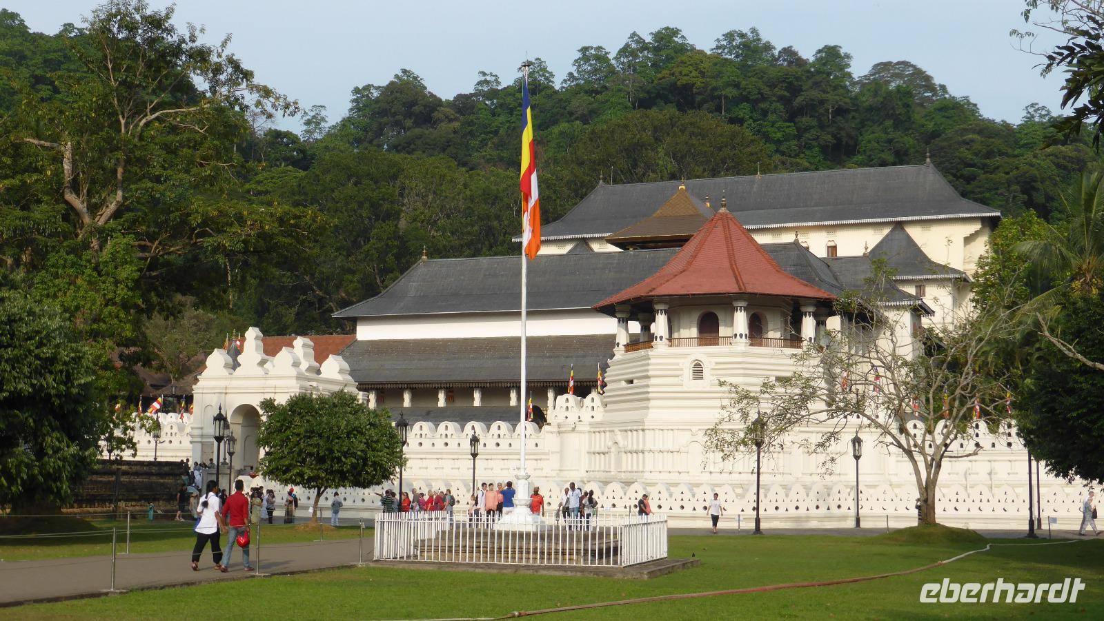 Am Nachmittag erreichen wir Kandy. Die Stadt liegt an einem künstlichen See, ist umgeben von satt grünen Bergen und der Straßenverkehr ist genau so schrecklich wie in Colombo. Kandy ist als wichtige buddhistische Pilgerstätte weit bekannt. Im sogenannten Zahntempel wird ein Eckzahn Buddhas aufbewahrt. Wir holen also mal wieder unsere Tempelsocken raus, geben die Schuhe ab und schauen uns die Tempelanlage näher an. Der Eckzahn selbst wird sicher verwahrt und ist natürlich nicht zu sehen. Vor dem Verwahrungsort werden viele Lotusblumen gespendet und einige beten hier auch. Vor dem Tempel entsteht unser Gruppenfoto, die Kulisse des Tempels am Fuße eines grünen Hügels bietet den richtigen Rahmen.