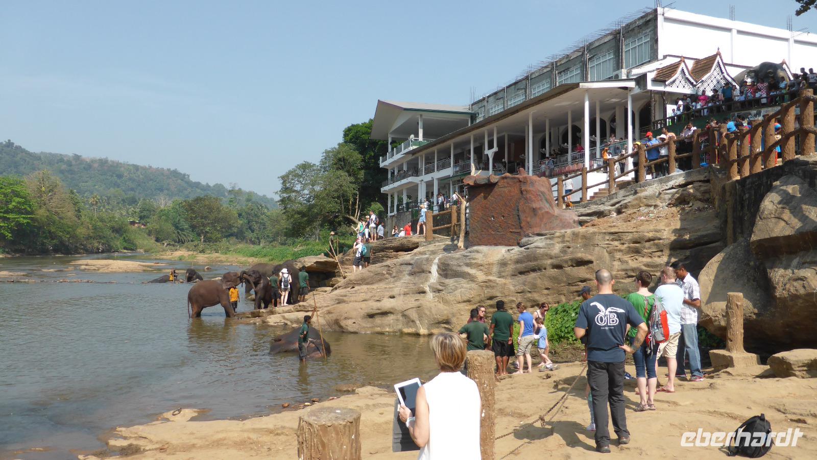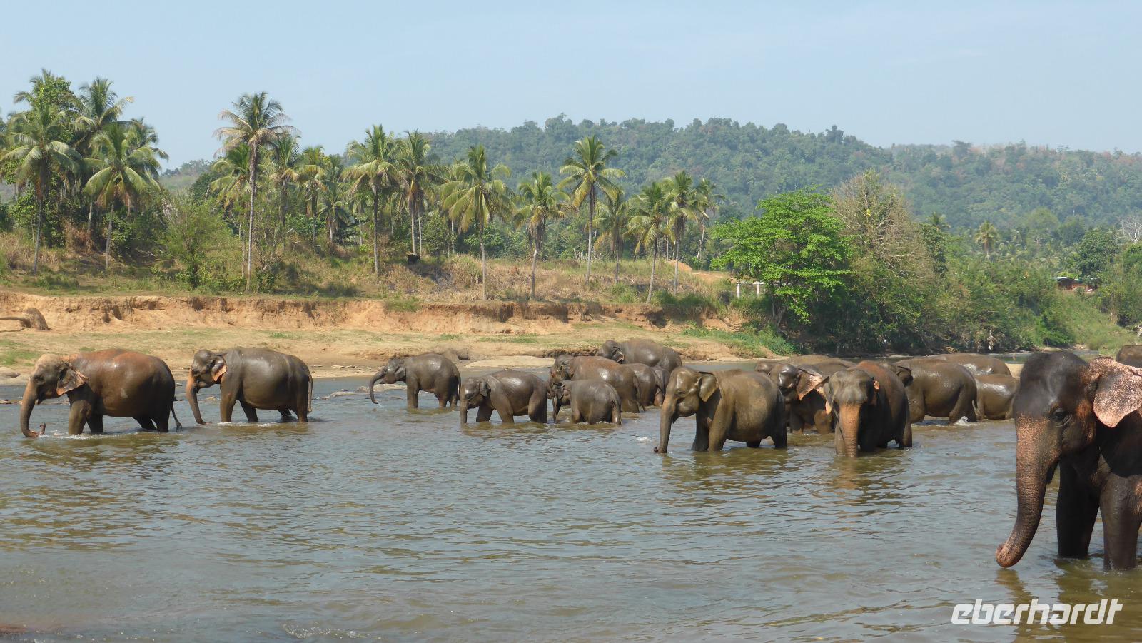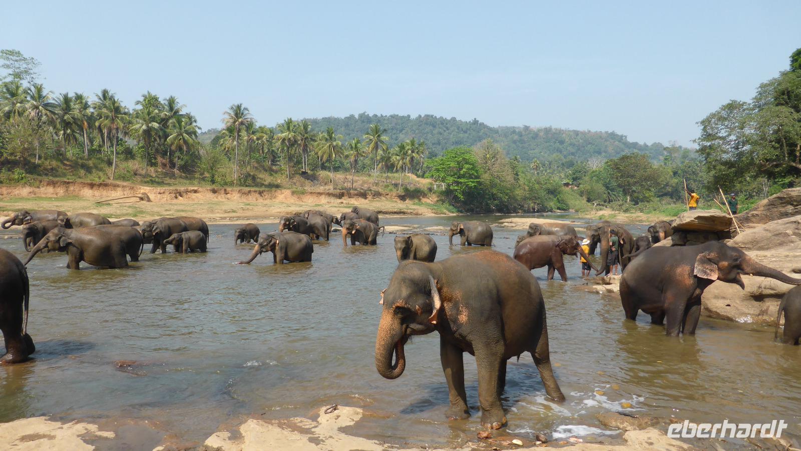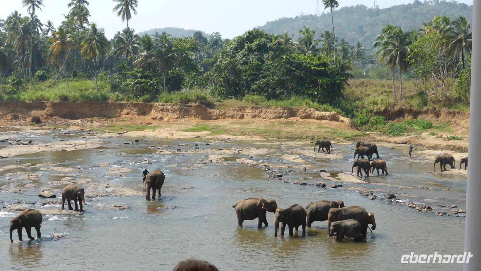 Heute klingelt schon 5.30 Uhr der Wecker, damit wir pünktlich zur Elefantenfütterung nach Pinnawela kommen. Vor der Fütterung der Babyelefanten haben wir noch Gelegenheit, Fotos von und mit Elefanten zu machen - ohne Gitter zwischen Mensch und Tier! Die eigentliche Fütterung der Babyelefantenfindet in einem Rundell statt. Die Zwei bekommen Kuhmilch aus der Flasche zum Frühstück. Für mich sehr beeindruckend ist das Baden der Elefanten im Maoya-Fluß. Daya hat für uns auf der Restaurantterrasse schattige Plätze zur Beobachtung reserviert. Wir zählen mehr als 40 Elefanten, die zum Fluß kommen. Mit dem üppig grünen Hügelland und dem mit Felsen durchzogenen Flußbett ist die Kulisse rund um die Elefanten perfekt. So ergeben sich tolle Motive und unsere Fotoapparate sind im Dauereinsatz. Wenn zwischen den Elefanten nicht hin und wieder ein Pfleger wäre, könnte man glatt vergessen, dass es keine Wildelefanten sind. Nach einer Stunde am Fluß haben wir uns satt gesehen und kehren schließlich nach Kandy zurück. Unterwegs halten wir noch einmal am Maoya Fluß, um Flughunde in Bäumen hängend, zu fotografieren.