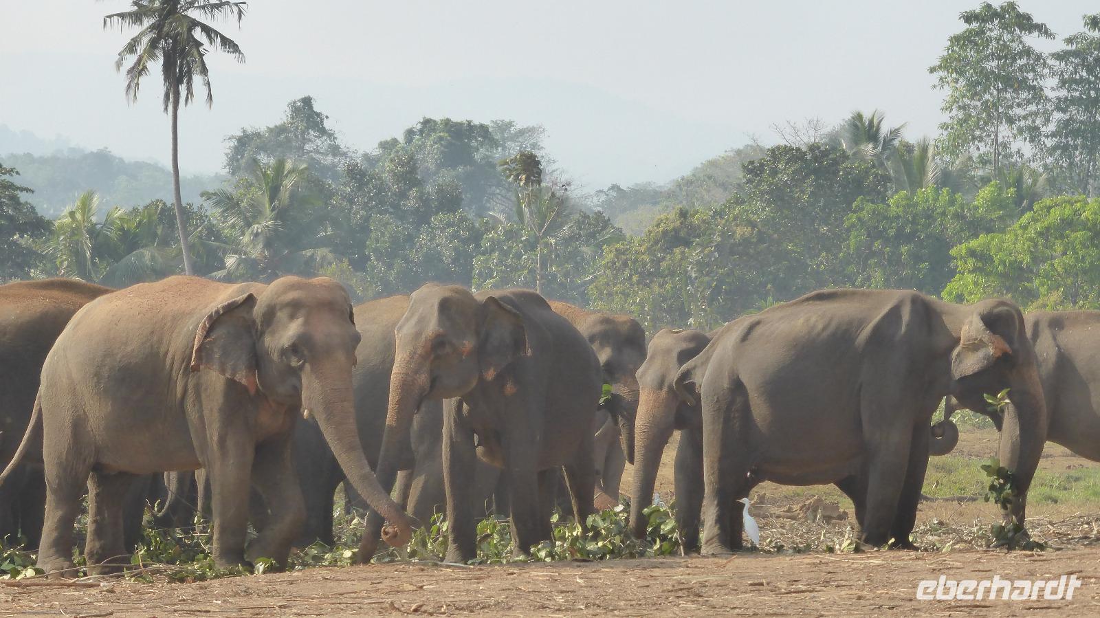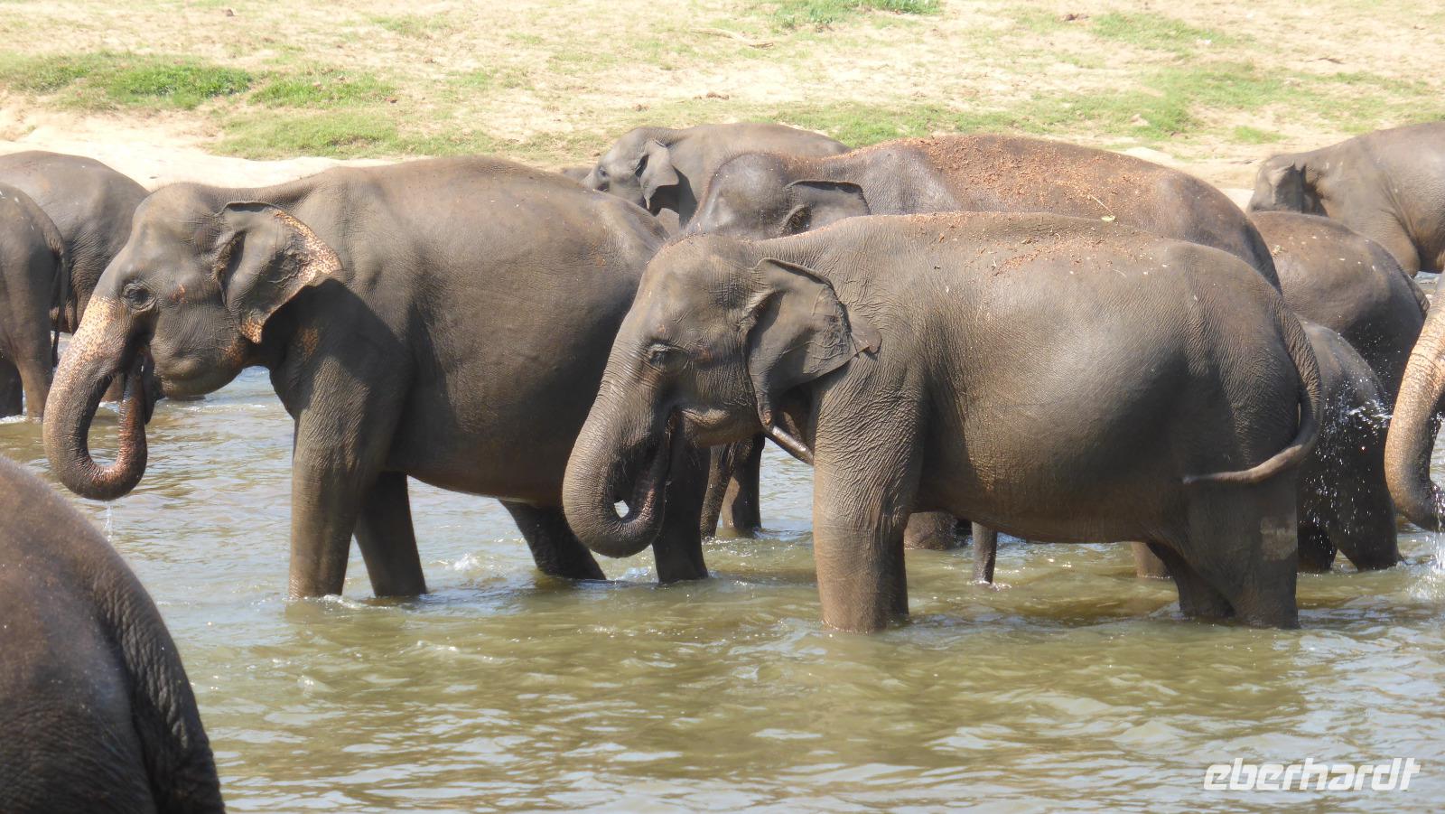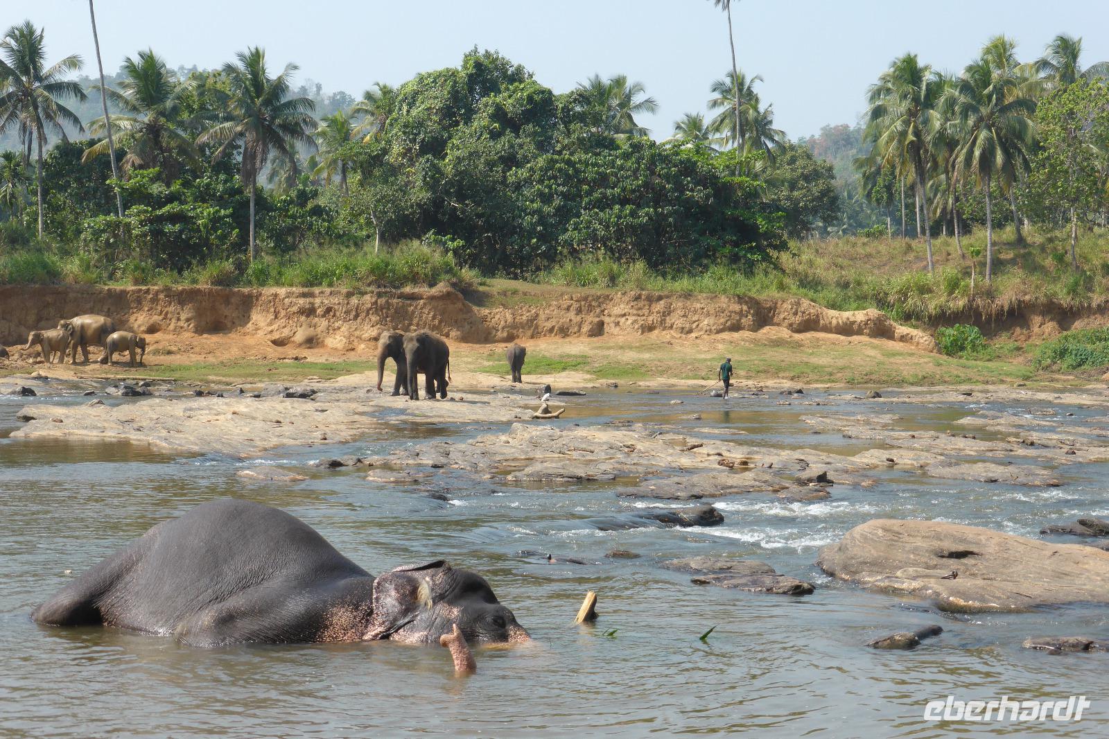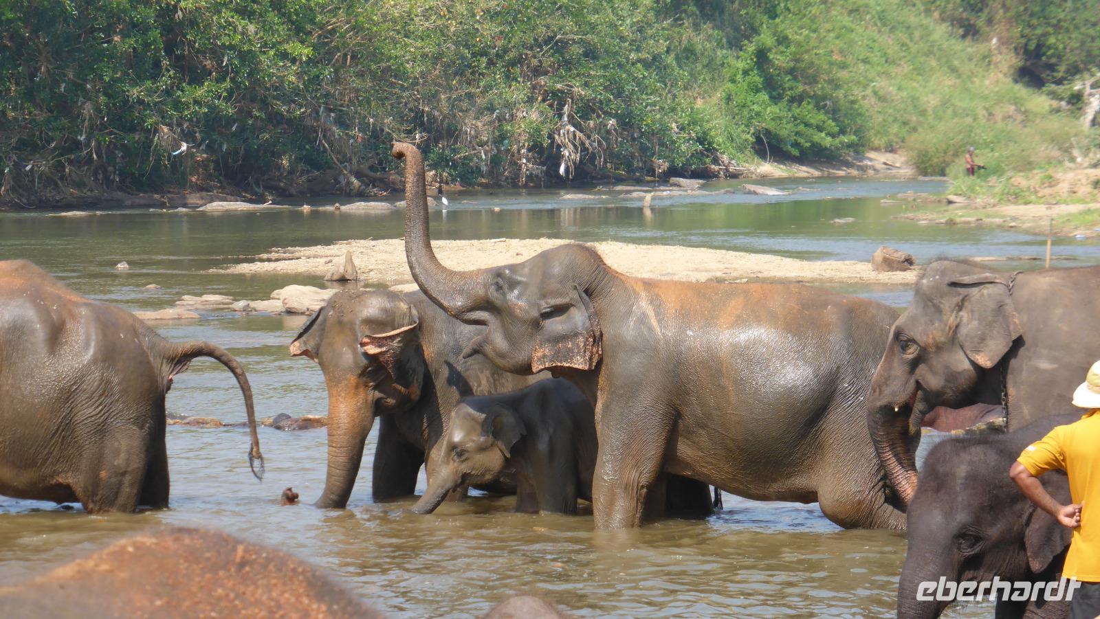Heute klingelt schon 5.30 Uhr der Wecker, damit wir pünktlich zur Elefantenfütterung nach Pinnawela kommen. Vor der Fütterung der Babyelefanten haben wir noch Gelegenheit, Fotos von und mit Elefanten zu machen - ohne Gitter zwischen Mensch und Tier! Die eigentliche Fütterung der Babyelefantenfindet in einem Rundell statt. Die Zwei bekommen Kuhmilch aus der Flasche zum Frühstück. Für mich sehr beeindruckend ist das Baden der Elefanten im Maoya-Fluß. Daya hat für uns auf der Restaurantterrasse schattige Plätze zur Beobachtung reserviert. Wir zählen mehr als 40 Elefanten, die zum Fluß kommen. Mit dem üppig grünen Hügelland und dem mit Felsen durchzogenen Flußbett ist die Kulisse rund um die Elefanten perfekt. So ergeben sich tolle Motive und unsere Fotoapparate sind im Dauereinsatz. Wenn zwischen den Elefanten nicht hin und wieder ein Pfleger wäre, könnte man glatt vergessen, dass es keine Wildelefanten sind. Nach einer Stunde am Fluß haben wir uns satt gesehen und kehren schließlich nach Kandy zurück. Unterwegs halten wir noch einmal am Maoya Fluß, um Flughunde in Bäumen hängend, zu fotografieren.