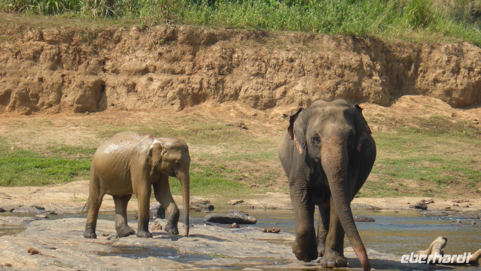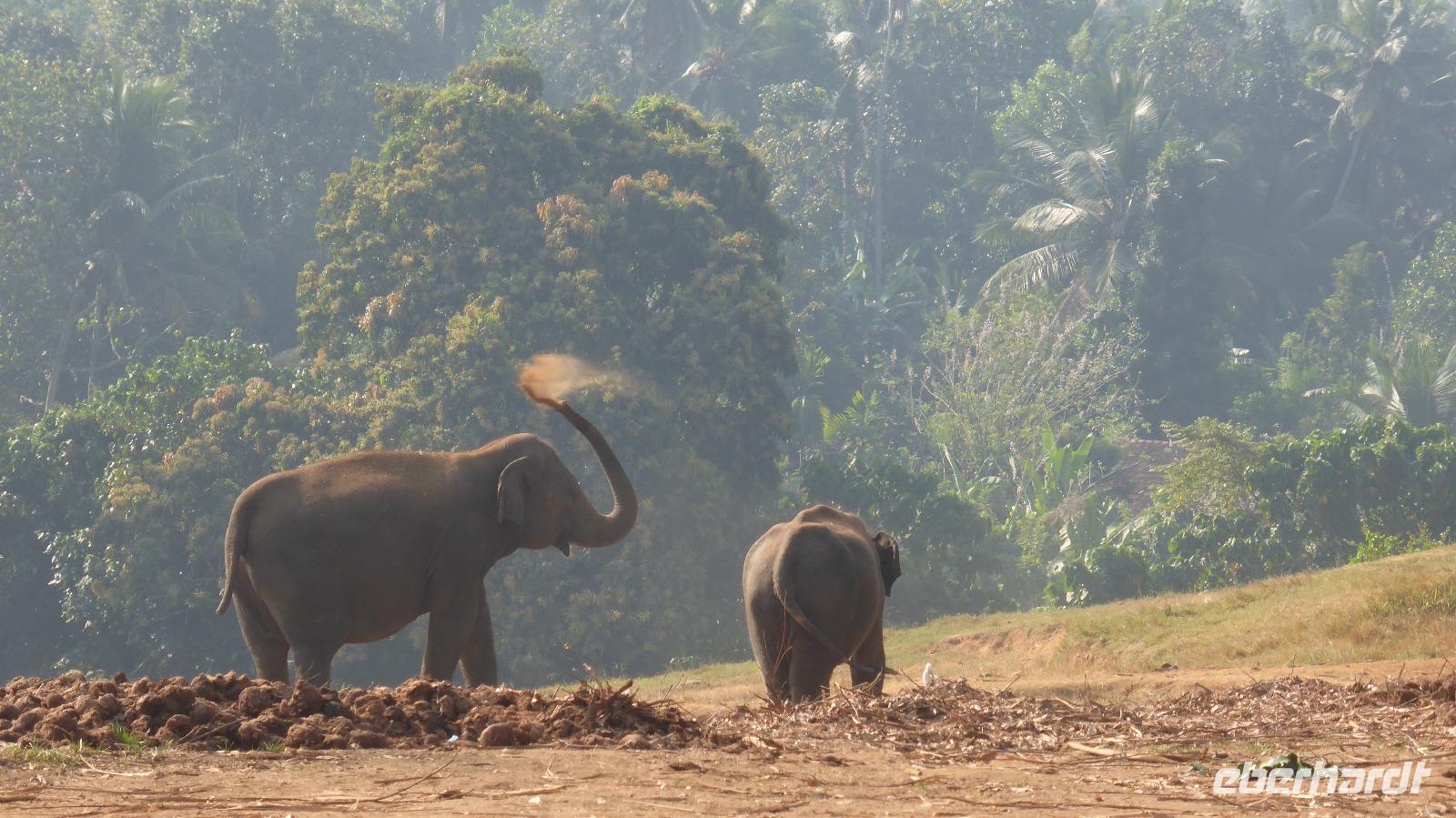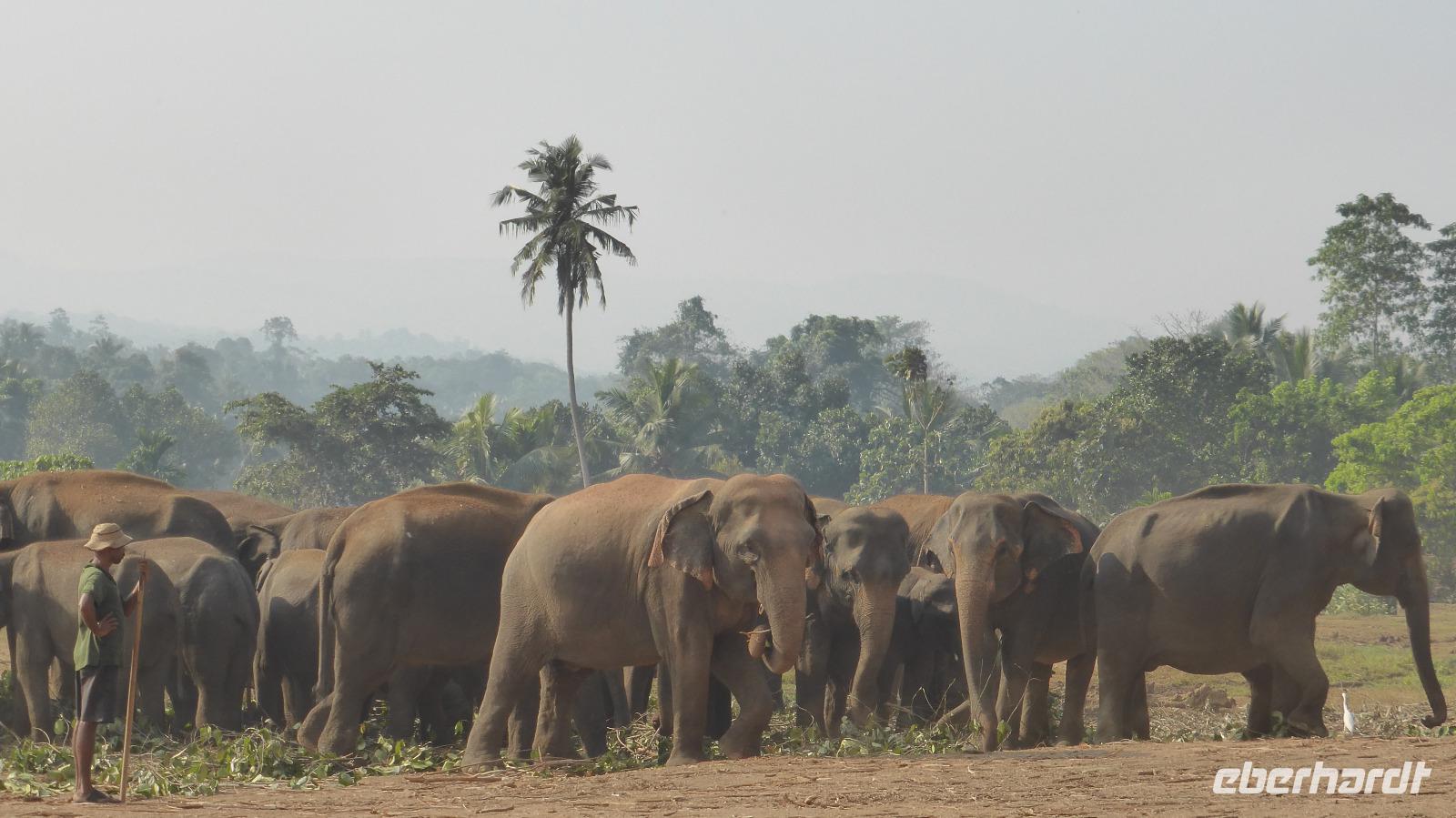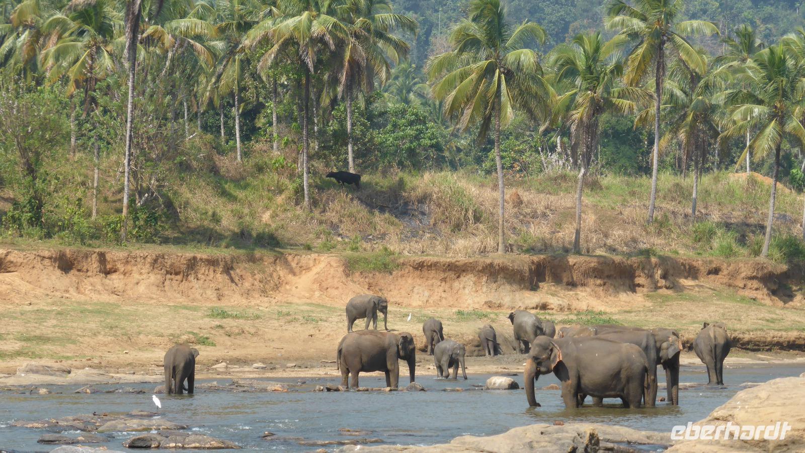 Heute klingelt schon 5.30 Uhr der Wecker, damit wir pünktlich zur Elefantenfütterung nach Pinnawela kommen. Vor der Fütterung der Babyelefanten haben wir noch Gelegenheit, Fotos von und mit Elefanten zu machen - ohne Gitter zwischen Mensch und Tier! Die eigentliche Fütterung der Babyelefantenfindet in einem Rundell statt. Die Zwei bekommen Kuhmilch aus der Flasche zum Frühstück. Für mich sehr beeindruckend ist das Baden der Elefanten im Maoya-Fluß. Daya hat für uns auf der Restaurantterrasse schattige Plätze zur Beobachtung reserviert. Wir zählen mehr als 40 Elefanten, die zum Fluß kommen. Mit dem üppig grünen Hügelland und dem mit Felsen durchzogenen Flußbett ist die Kulisse rund um die Elefanten perfekt. So ergeben sich tolle Motive und unsere Fotoapparate sind im Dauereinsatz. Wenn zwischen den Elefanten nicht hin und wieder ein Pfleger wäre, könnte man glatt vergessen, dass es keine Wildelefanten sind. Nach einer Stunde am Fluß haben wir uns satt gesehen und kehren schließlich nach Kandy zurück. Unterwegs halten wir noch einmal am Maoya Fluß, um Flughunde in Bäumen hängend, zu fotografieren.