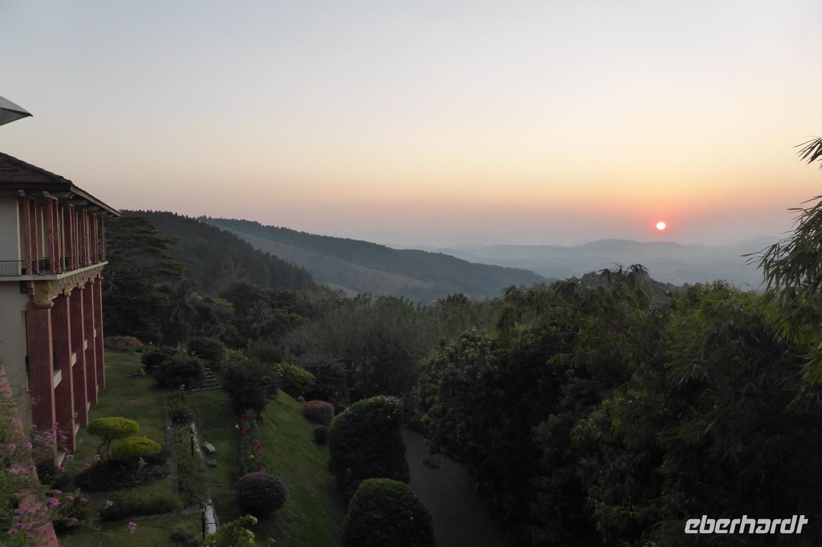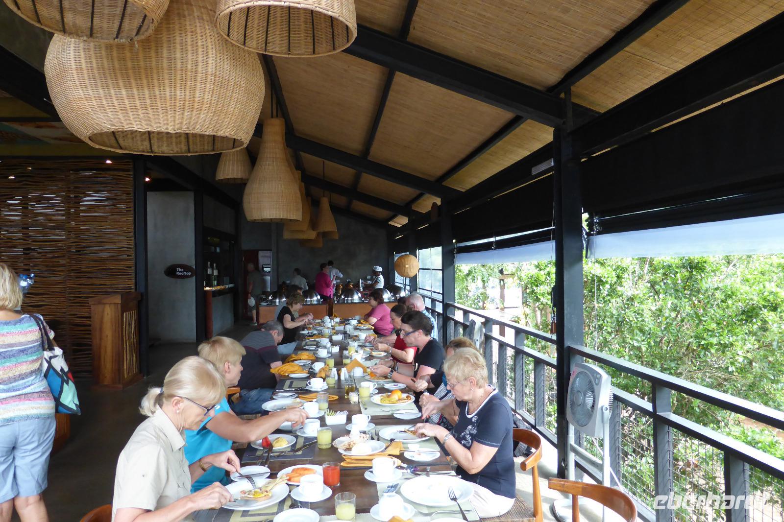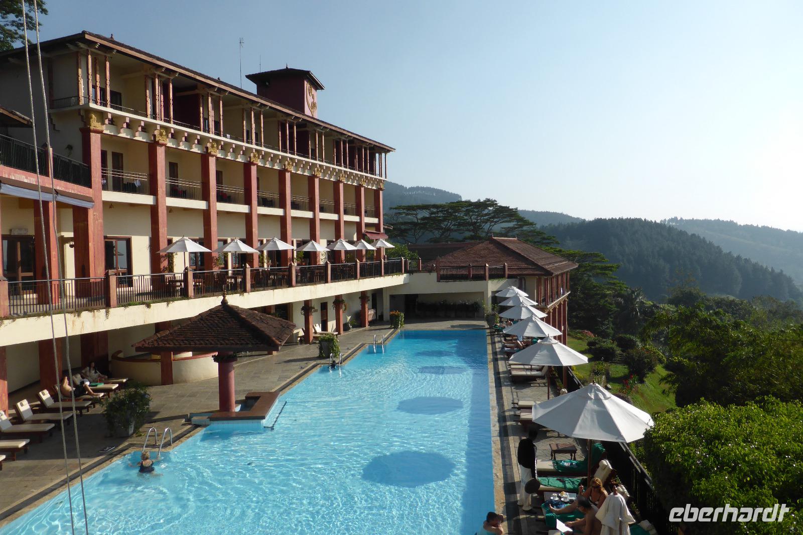 In Schrittgeschwindigkeit bringt uns der Bus durch den zähen verkehr zum Mittagessen. Dort beschließen wir, den Rest des Nachmittags im Hotel zu verbringen. Das Amaya Hills Hotel liegt hoch über Kandy in den grünen Bergen. Nur mit dem Hotelshuttle gelangen wir dort hoch. Ist auch besser so, denn auf den engen kurvigen Straßen geht es bei Gegenverkehr immer ganz schön knapp zu. Bis zum Sonnenuntergang nutzen viele von uns den Pool und Abend gönnen sich im Spa noch Einige eine Massage.