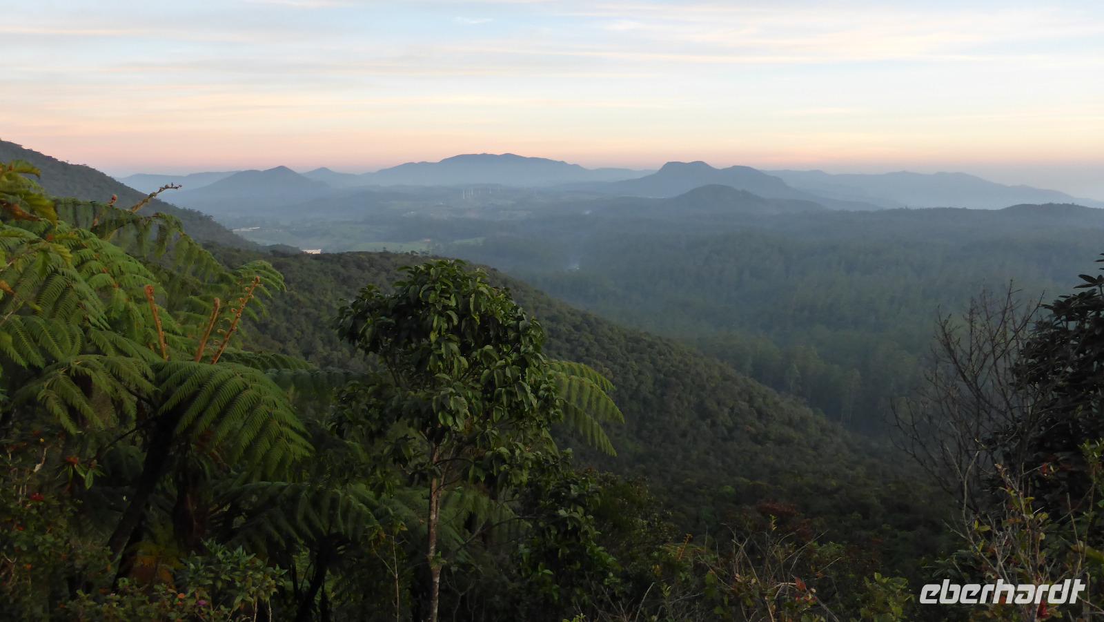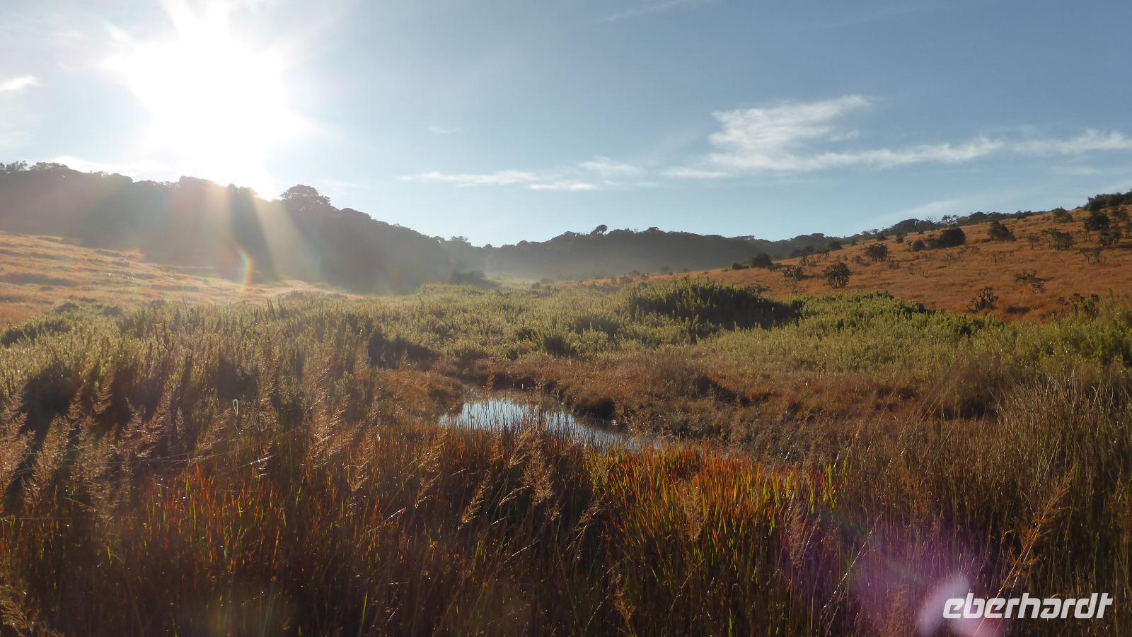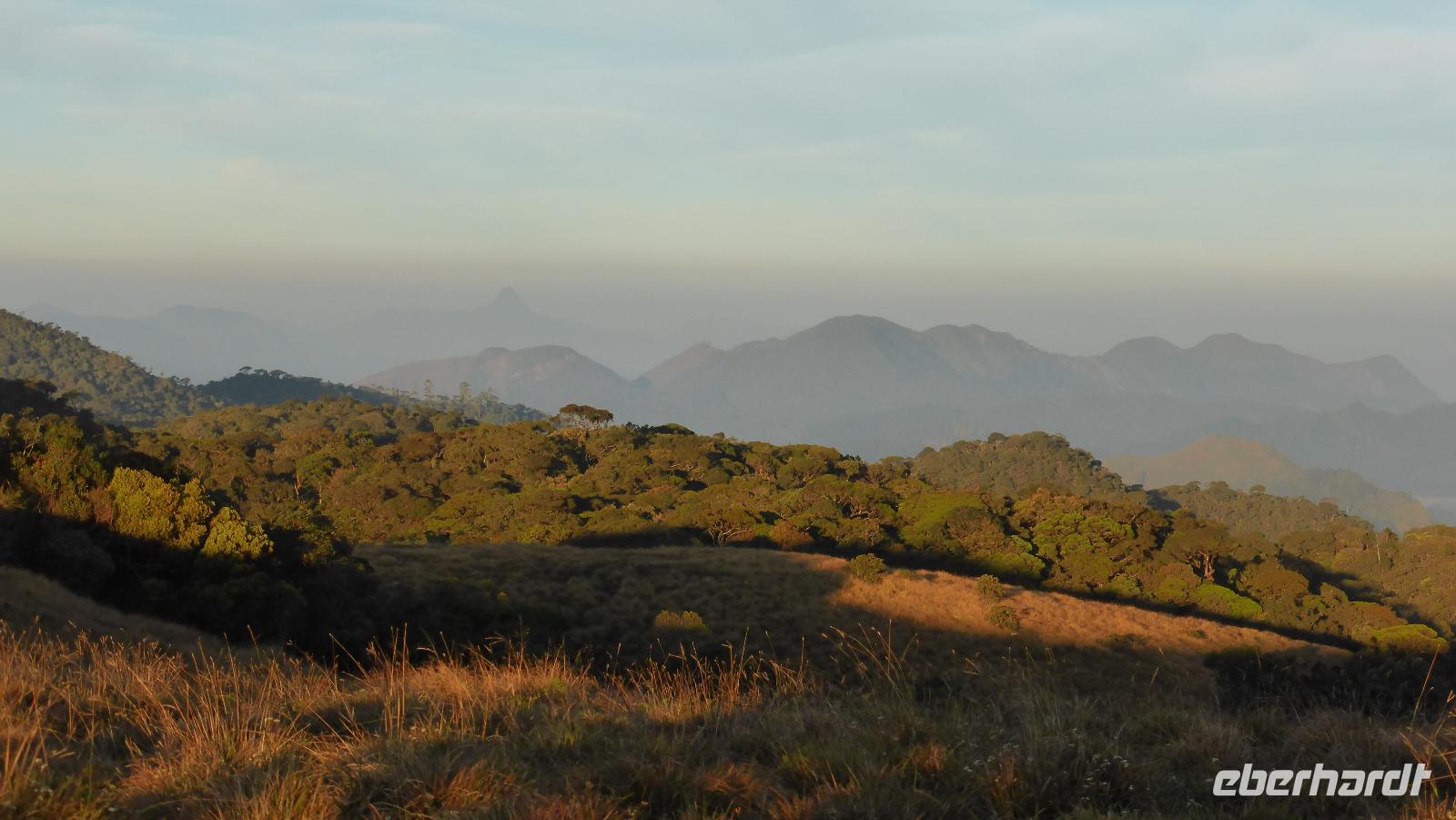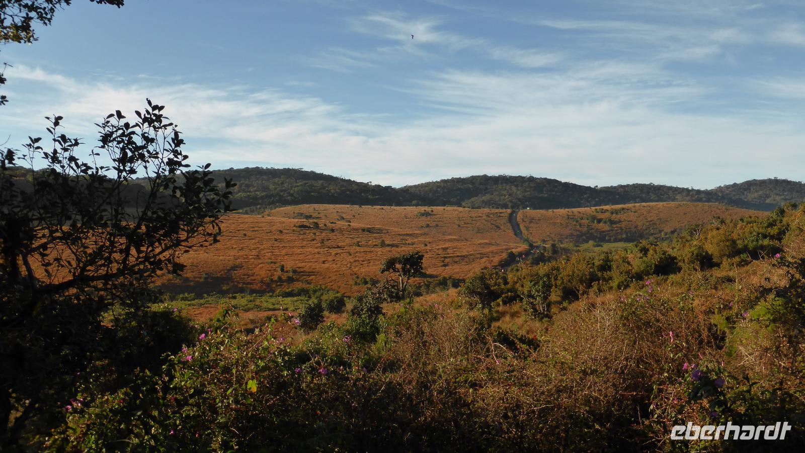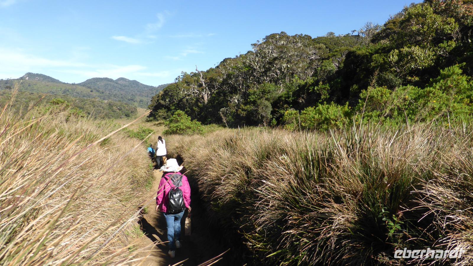 Für uns 11 (einschließlich Daya) heißt es dagegen um 5.00 Uhr aufstehen, Frühstückspaket einpacken und dann mit zwei Minibussen zur Hochebene Horton Plains fahren. Die Hochebene liegt auf 2.100 bis 2.300 m Höhe. Aufgrund ihrer Artenvielfalt und zahlreicher endemischer Tiere und Pflanzen sowie der einzigartigen Gras- und Waldlandschaft gehört das Gebiet zum UNESCO-Weltnaturerbe. Bei relativ guten Sichtverhältnissen wie heute Morgen kann man den etwa 40 km entfernten Adams Peak (2.243m) erkennen. Gleich zu Beginn sehen wir Sambarhirsche, einer steht direkt an der Straße. Wir wandern in drei Stunden geschätzte 12 Kilometer durch die wechselnde Landschaft mit Wiesen und Wäldern. Unterwegs halten wir am sogenannten Little World´s End und Big World´s End, Stellen an denen das Hochplateau fast senkrecht über mehrere hundert Meter abfällt. Der Bakers Wasserfall ist ein weiteres Ziel unserer Wanderung.