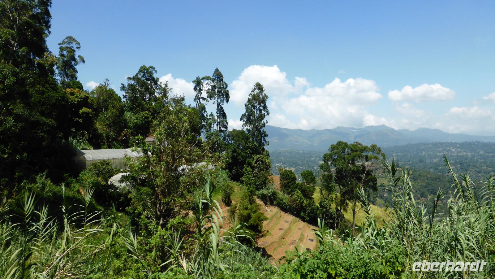 Mittags kehren wir ins Grand Hotel zurück, wo wir schon von den anderen erwartet werden. Gemeinsam reisen wir weiter Richtung Süden von ca. 1.800 m Höhe runter in die Küstenebene. Die ersten Stunden fahren wir noch durch eine der schönsten Landschaften Sri Lankas mit hohen grünen Bergen, Teeplantagen an den Berghängen und tiefen Schluchten. Damit auf den steilen Straßen nach unten auch nichts passiert, stimmt Raju mit einer Geldspende am Hindutempel die Götter gnädig. Zwischendurch essen wir im Kolonialhotel von Bandarawela und halten am Rawana Wasserfall.