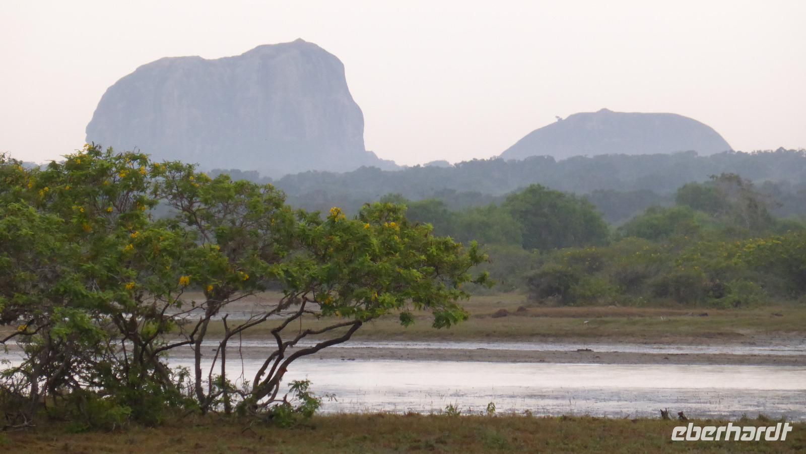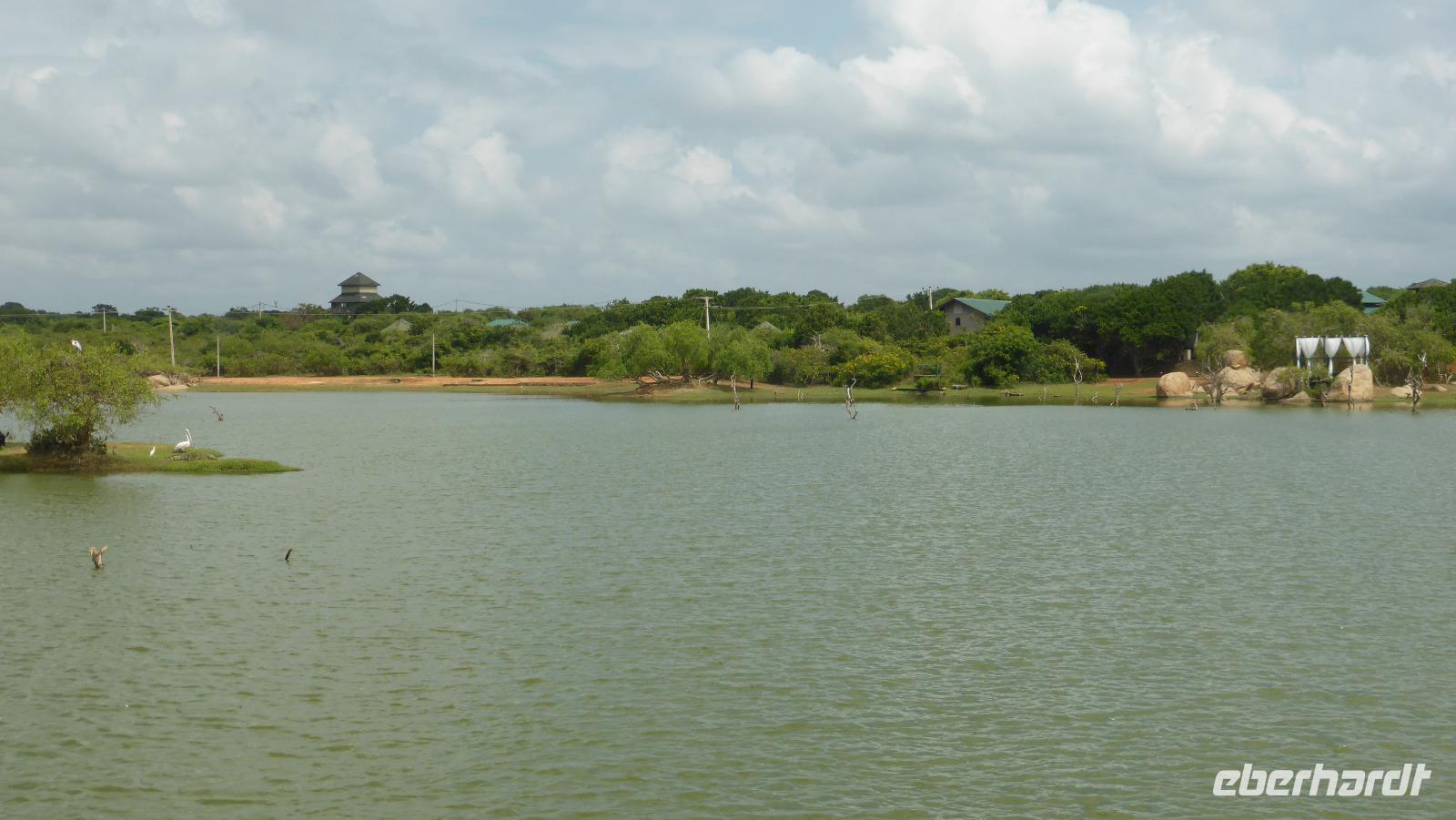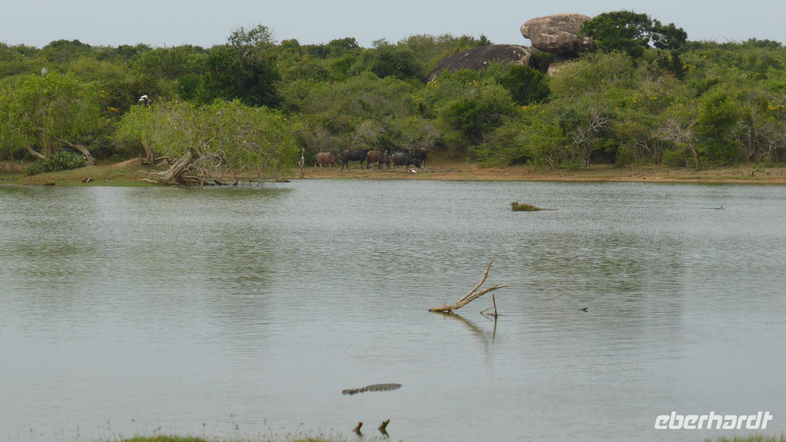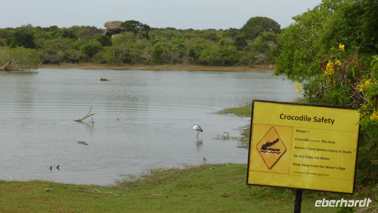 Neben all den Tieren lohnt sich auch ein Blick in die Landschaft. Das ist der sogenannte Elefantenfelsen, viele Wasserflächen und manchmal bietet sich ein Blick auf´s Meer. Innerhalb von zwei Stunden haben wir mehr Tiere gesehen als ich erhofft hatte. Jetzt kehren wir zum Cinnamon Wild Hotel zurück, wo wir erstmal frühstücken. Jetzt sehen wir die Hotelanlage auch mal bei Tageslicht. Am Seeufer warnt ein Schild vor Krokodilen - also besser vom Ufer fern bleiben. Und tatsächlich bekommen wir bei der Abreise ein Krokodil zu Gesicht als es aus dem Wasser auf eine kleine Insel steigt. Kurze Zeit später wird auch noch ein Leguan (oder Waran?) die Straße kreuzen.