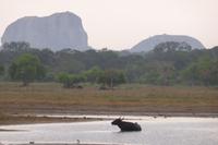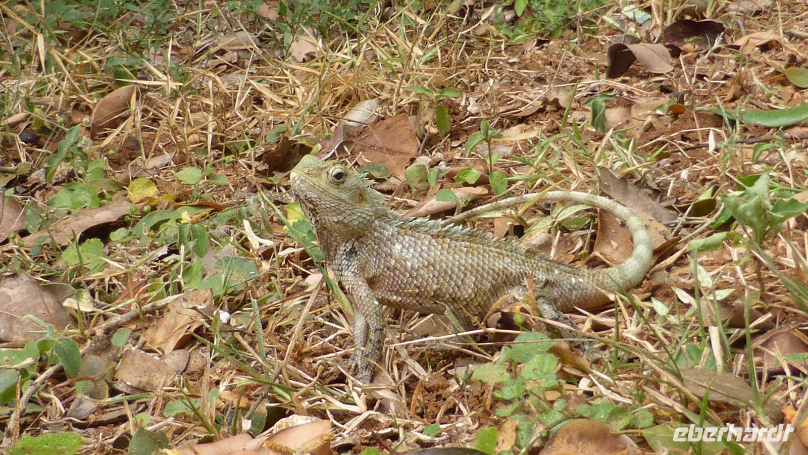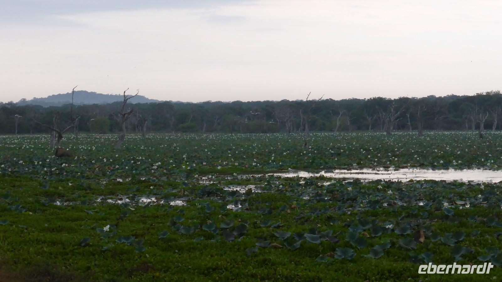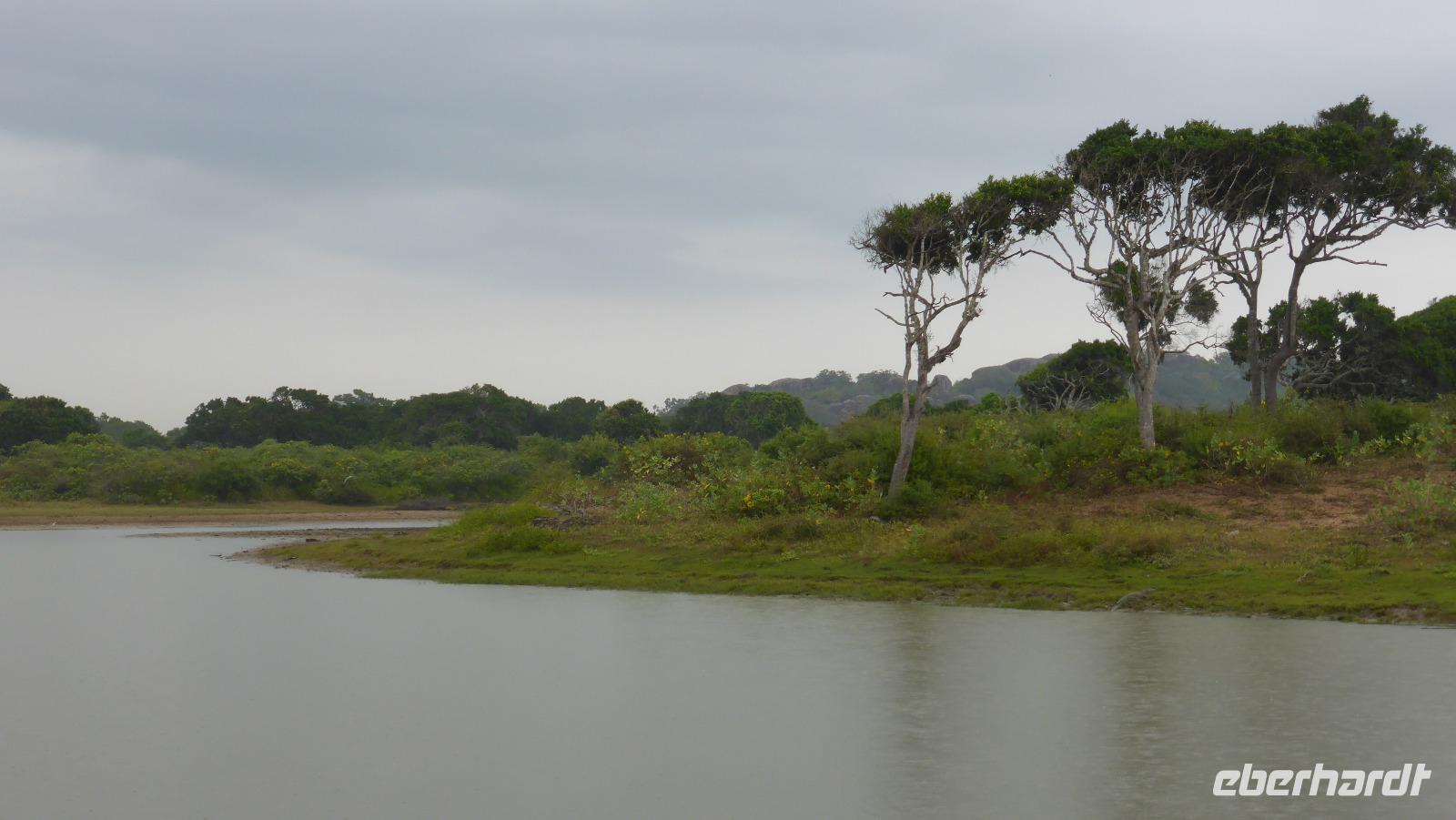Neben all den Tieren lohnt sich auch ein Blick in die Landschaft. Das ist der sogenannte Elefantenfelsen, viele Wasserflächen und manchmal bietet sich ein Blick auf´s Meer. Innerhalb von zwei Stunden haben wir mehr Tiere gesehen als ich erhofft hatte. Jetzt kehren wir zum Cinnamon Wild Hotel zurück, wo wir erstmal frühstücken. Jetzt sehen wir die Hotelanlage auch mal bei Tageslicht. Am Seeufer warnt ein Schild vor Krokodilen - also besser vom Ufer fern bleiben. Und tatsächlich bekommen wir bei der Abreise ein Krokodil zu Gesicht als es aus dem Wasser auf eine kleine Insel steigt. Kurze Zeit später wird auch noch ein Leguan (oder Waran?) die Straße kreuzen.