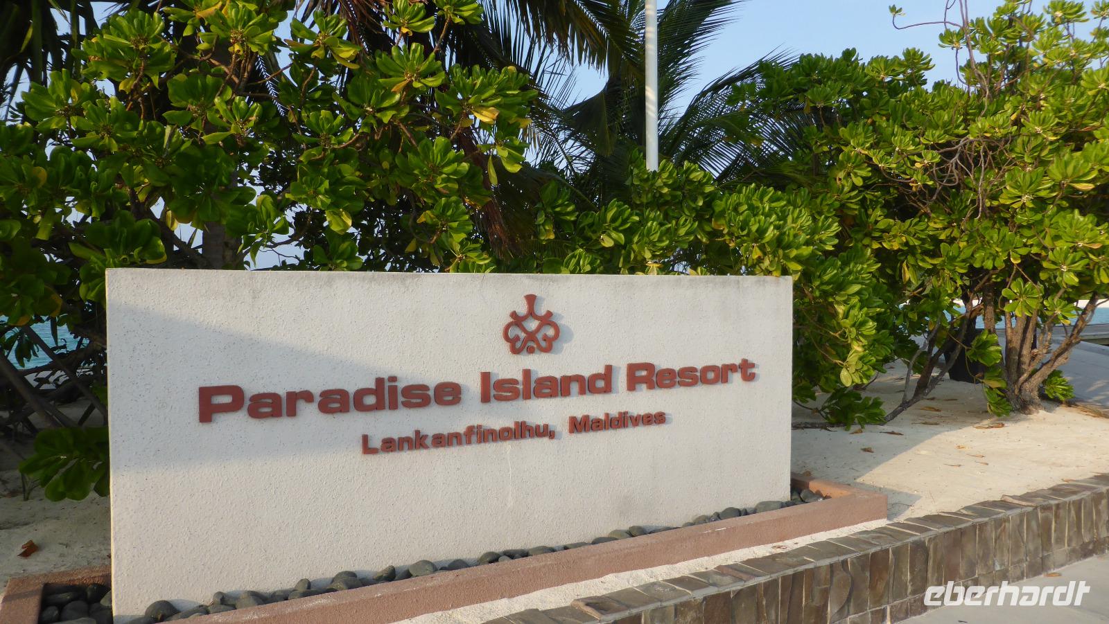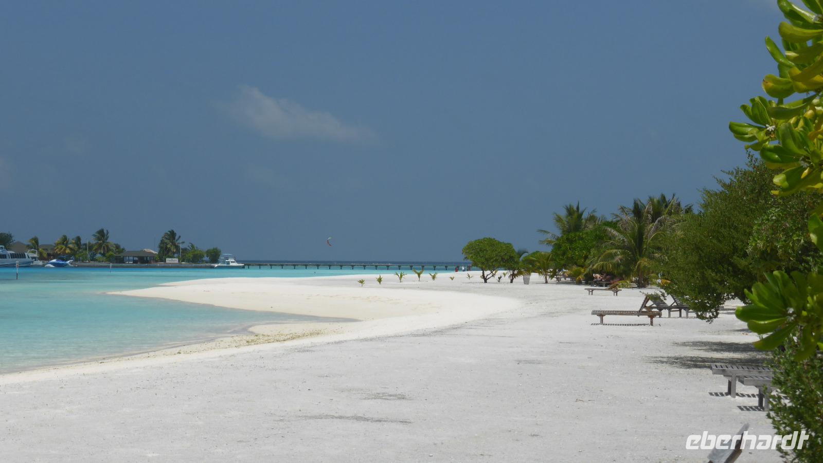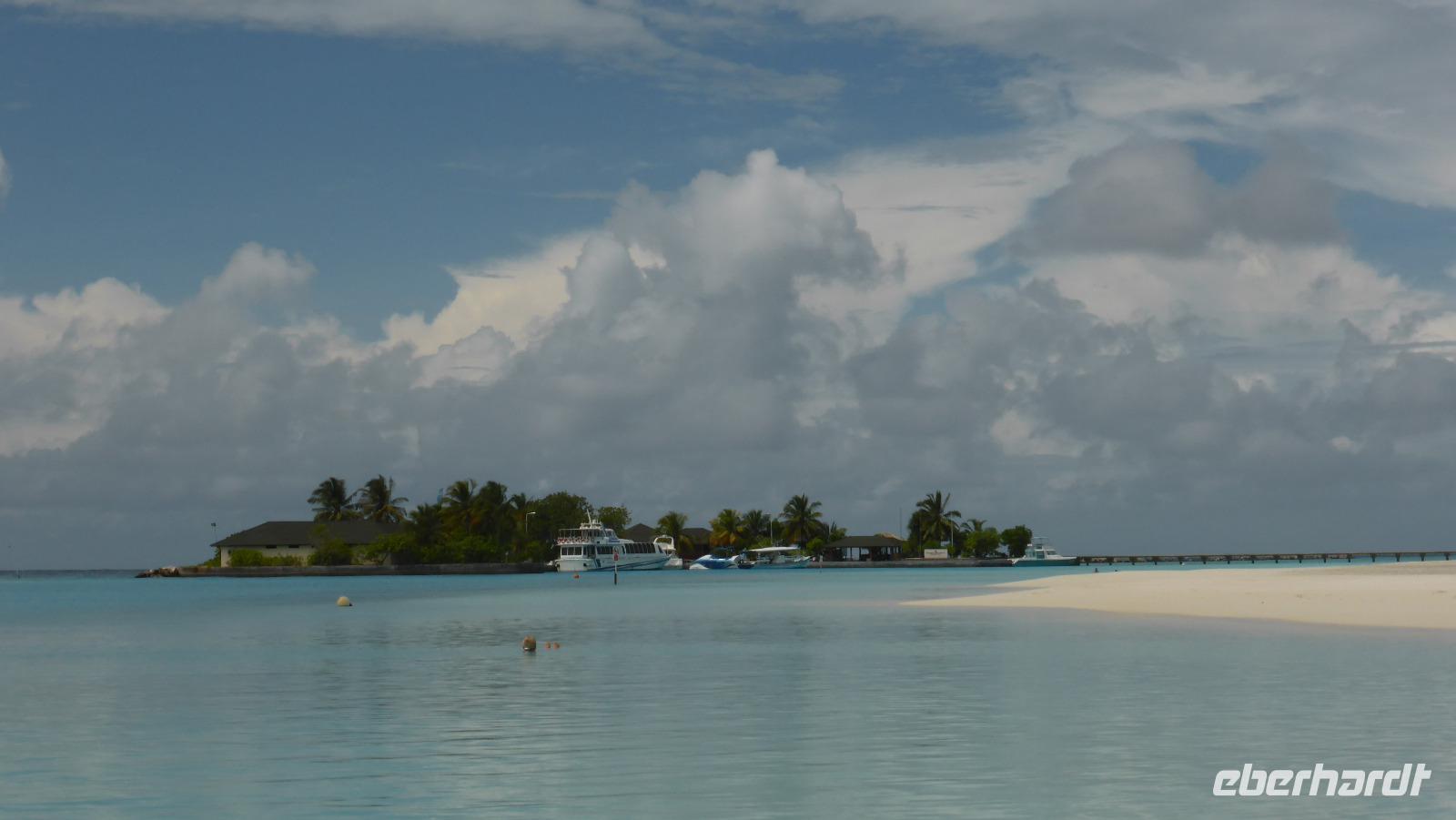 Nach 1,5 Stunden Flug mit Sri Lankan Airlines erreichen wir Male bzw. die separate Flughafeninsel neben der Hauptstadt. Gleich am Ausgang des kleinen Flughafens erwartet uns das Wassertaxi im klaren azurblauen Wasser. Nach 20 Minuten Bootsfahrt erreichen wir die Insel Lankanfinolhu mit unserem Hotel Paradise Island Resort. In der weitläufigen Anlage beziehen wir unsere Strandbungalows. Vom Bungalow über die eigene Terrasse sind es noch so 30-40 Meter bis zum strahlend blauen Wasser, der helle Sandstrand wird von Kokospalmen und anderen Pflanzen beschattet. Ja, hier lässt es sich aushalten....