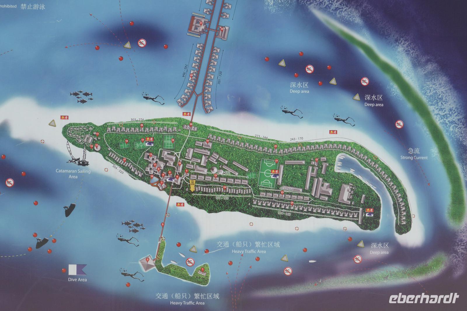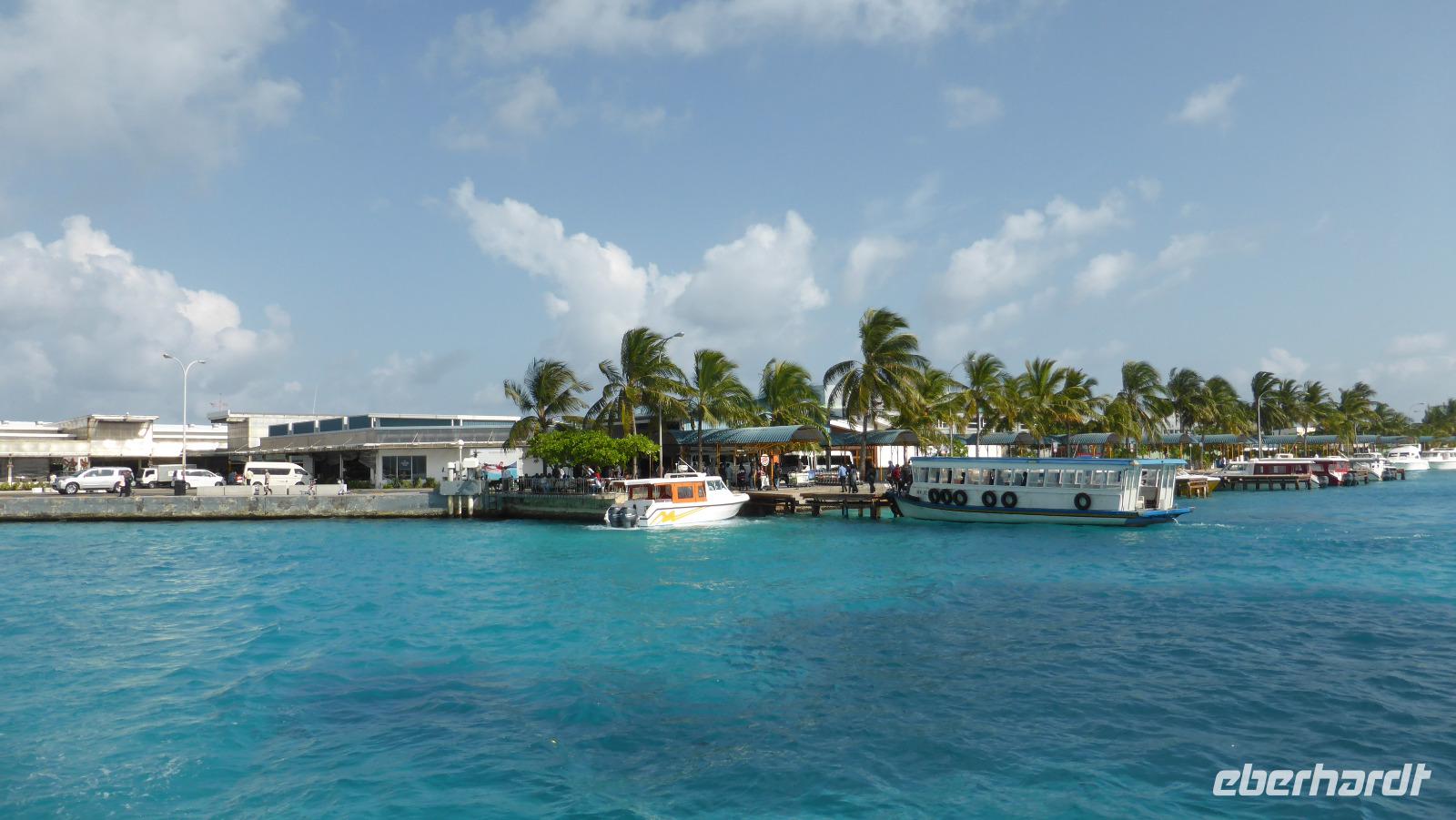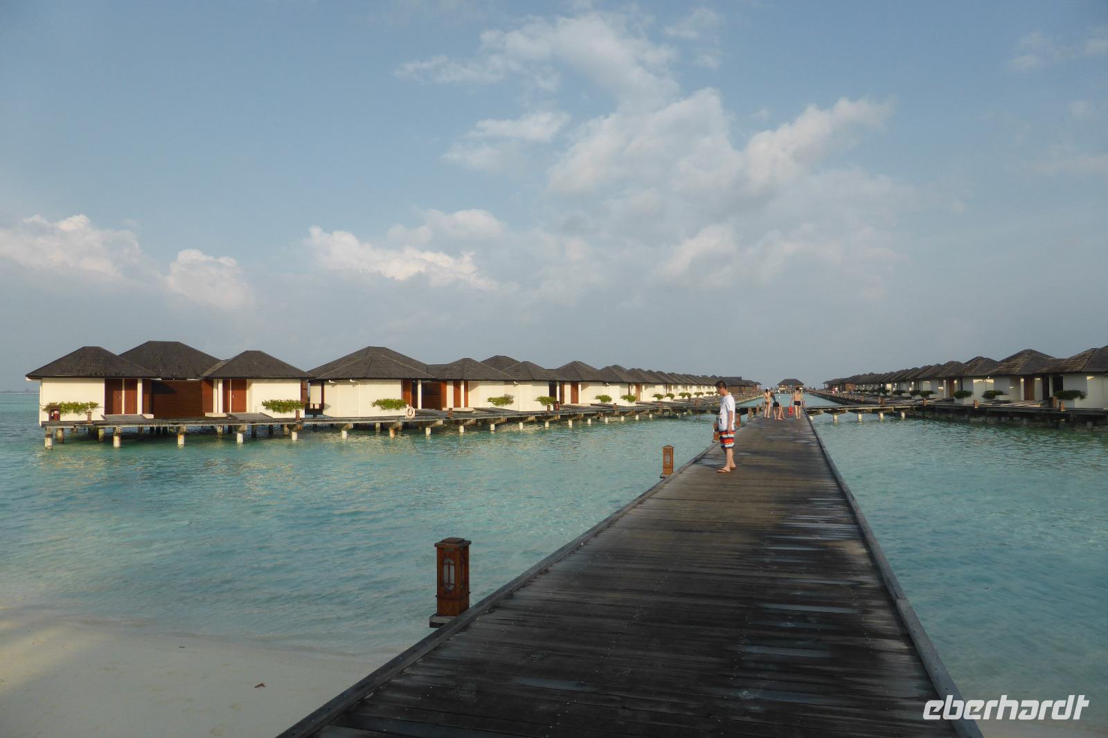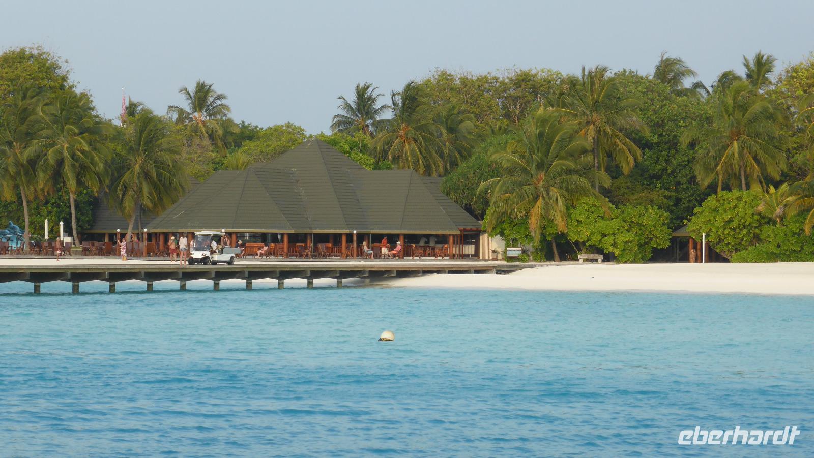Nach 1,5 Stunden Flug mit Sri Lankan Airlines erreichen wir Male bzw. die separate Flughafeninsel neben der Hauptstadt. Gleich am Ausgang des kleinen Flughafens erwartet uns das Wassertaxi im klaren azurblauen Wasser. Nach 20 Minuten Bootsfahrt erreichen wir die Insel Lankanfinolhu mit unserem Hotel Paradise Island Resort. In der weitläufigen Anlage beziehen wir unsere Strandbungalows. Vom Bungalow über die eigene Terrasse sind es noch so 30-40 Meter bis zum strahlend blauen Wasser, der helle Sandstrand wird von Kokospalmen und anderen Pflanzen beschattet. Ja, hier lässt es sich aushalten....