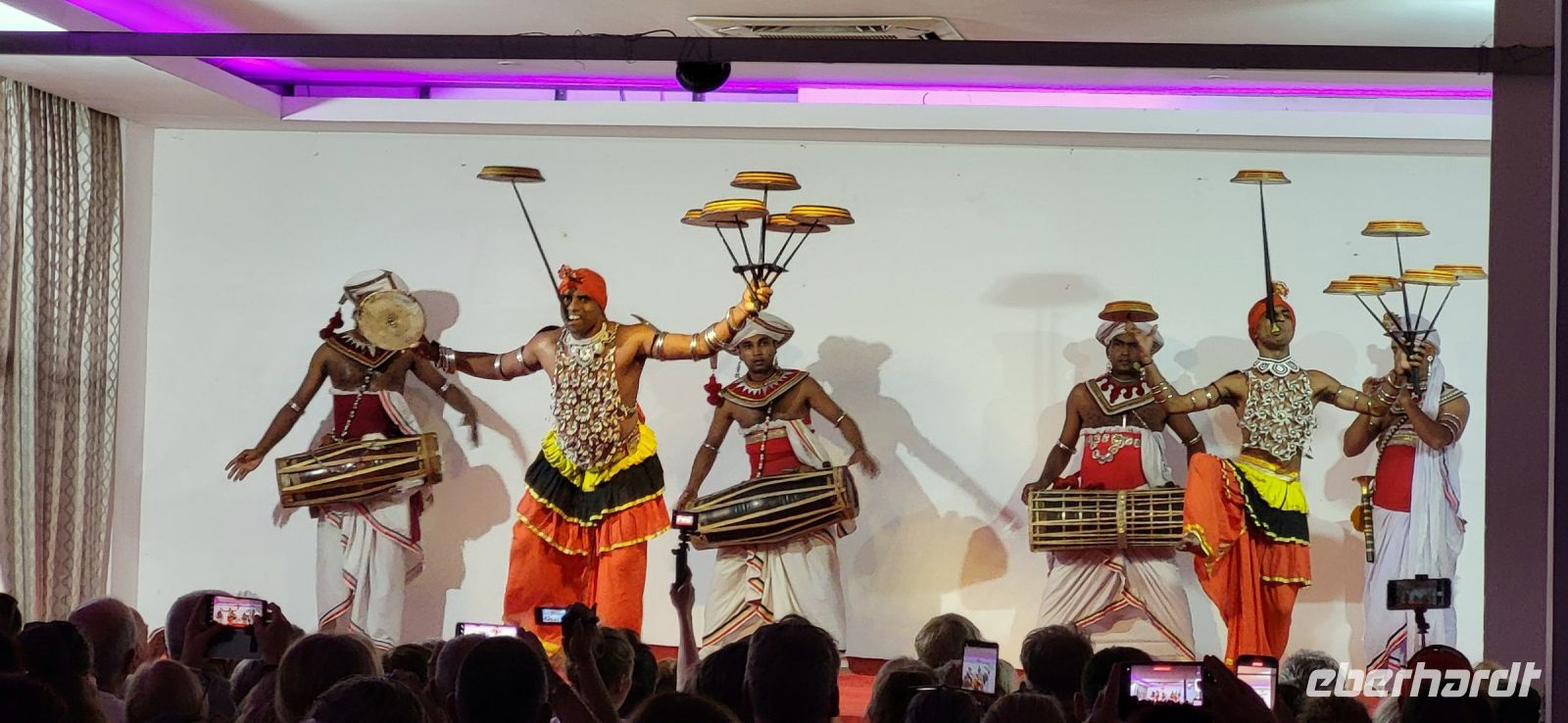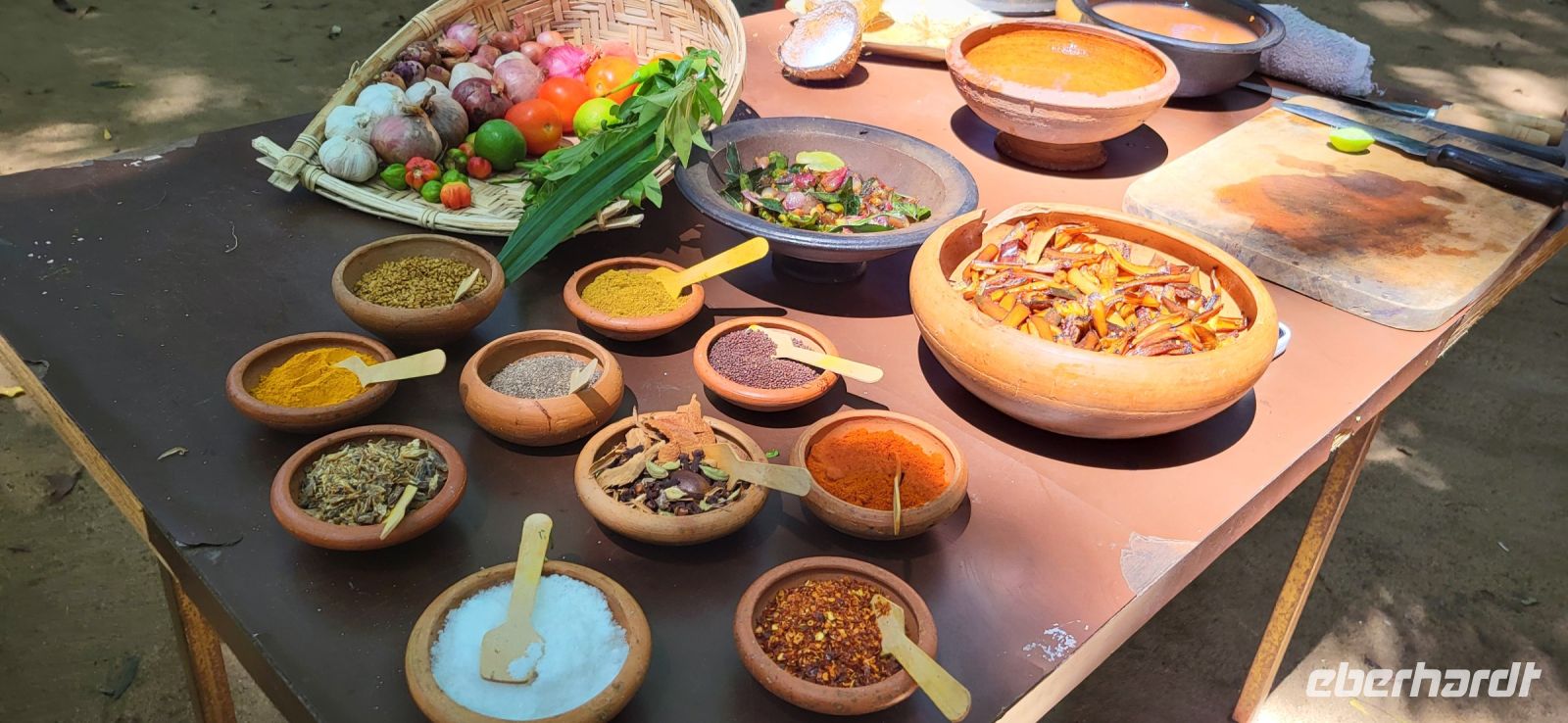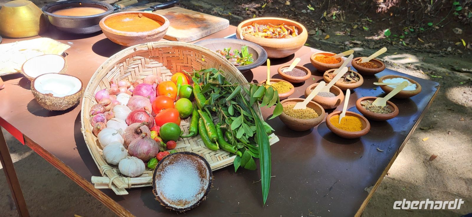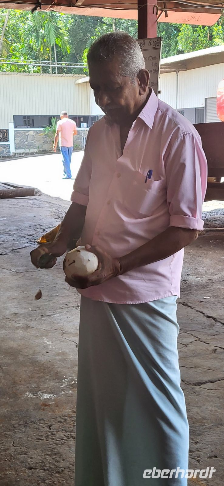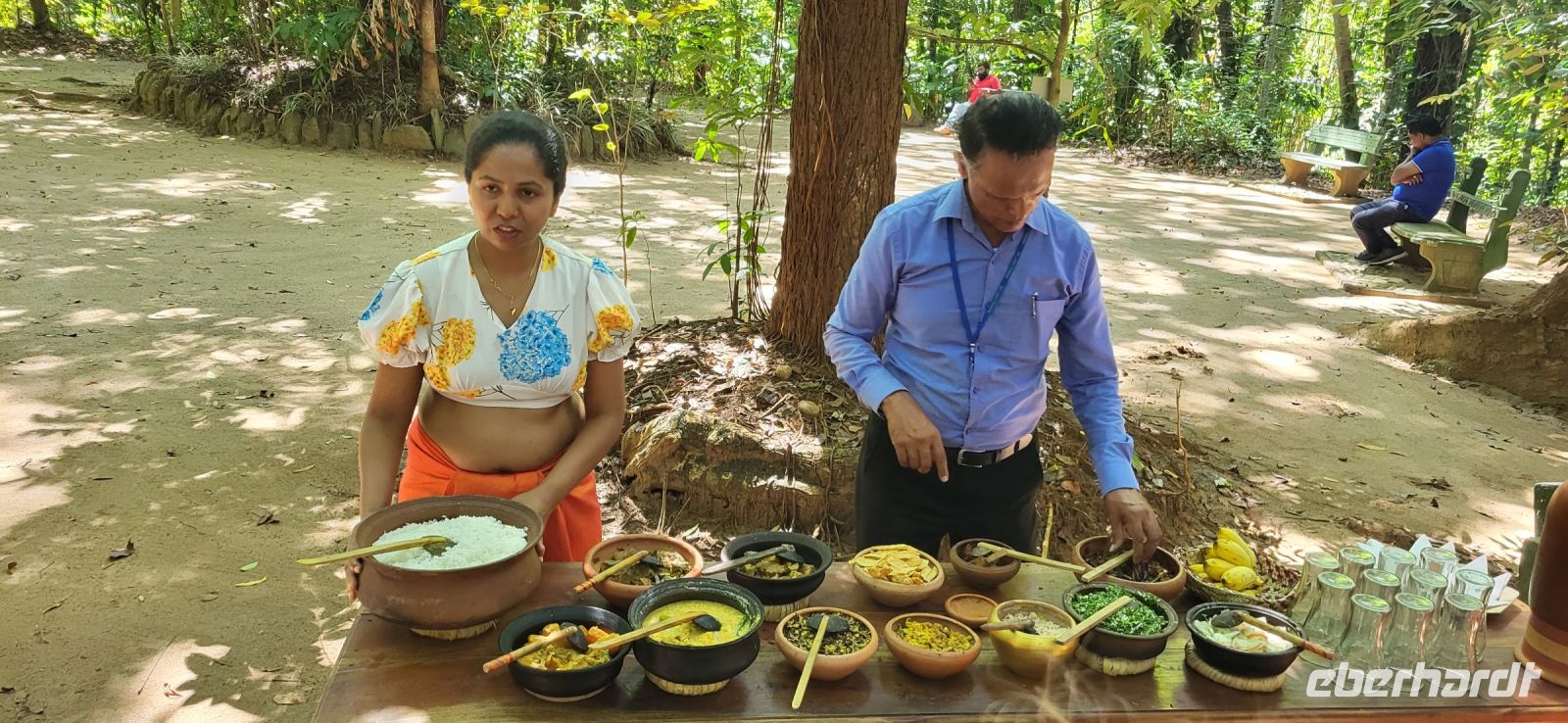 Nach einem herrlichen Frühstück starten wir zu einem Aussichtspunkt in Kandy, von wo aus wir eine tolle Übersicht und eine noch bessere Aussicht über die Stadt haben. Diese war einst von 1592 bis 1815 die Hauptstadt der Insel, bevor sie durch Colombo ersetzt wurde. Bei allerbesten Wetterverhältnissen steuern wir den nun 200 Jahre alten Botanischen Garten an und genießen die nächsten Stunden dieses wunderbare Stück Natur, bestaunen die vielen exotischen Pflanzen und Bäume, die hier aus der ganzen Welt zusammengetragen wurden. Neben Flora und Fauna hören und sehen wir auch, dass sich hier viele junge oder potenzielle Paare zum Kennenlernen treffen und je weniger man sich kennt, so näher man am Eingang sitzt und je vermeintlich besser man sich schon für gut befunden hat, umso weiter im Park hineinsitzt man auf den vielzähligen Parkbänken ringsherum. Und tatsächlich, wir sehen so einige junge Menschen ins Gespräch vertieft. In diesem wunderbaren Areal könnten wir uns noch Stunden aufhalten, jedoch werden wir heute zum Showkochen erwartet. Einige Fahrminuten später biegen wir von der Straße ab und befinden uns schlagartig mitten in der Natur. Hier werden wir von Köchin Sanda und einer Mitarbeiterin bereits erwartet, die uns zunächst mit einem Mangosaft einer noch unreifen Frucht begrüßen. Dieser schmeckt vorzüglich, erfrischend und ist auch für uns in dieser Form noch Neuland. Sanda demonstriert erst mal, was in keiner einheimischen Küche frisch fehlen darf, nämlich Kokosnuss. Schnell mit einer Sichel halbiert, werden die Hälften auf einer Art Hobel geraspelt, dann frisch verwendet oder mit Wasser ausgedrückt, damit frische Kokosmilch entsteht. Natürlich dürfen wir uns auch versuchen und stellen fest, so einfach wie es aussieht, ist es beim ersten Mal nicht. Sanda erklärt uns nun die verschiedenen Gerichte und bereitet für uns ein tolles Linsencurry auf offenem Feuer zu. Viele Zutaten werden hinzugefügt, die wir vor Ort bestaunen. Dazu fertigt sie noch einen Auberginen- sowie auch einen srilankanischen Gurkensalat. Das restliche Buffet haben die beiden Damen schon im Vorfeld für uns zubereitet, sodass wir bald auch alles kosten können. Heute nutzen wir dazu noch die Gelegenheit, das gewohnte Besteck gegen die eigenen Finger zu tauschen. Etwas ungewohnt, aber nach Erklärungen von Bonny und Sanda klappt es auch bei uns-ein völlig neues Essgefühl. Nach einem abschließenden Dessert verlassen wir diesen schönen Platz, wo wir in herrlicher Natur für uns gekocht und wir bestens gegessen haben. Es geht zurück nach Kandy Downtown, wo wir wieder den Kandy Lake und das ehrwürdige Queen’s Hotel passieren. Buntes Treiben mit viel Verkehr, Bussen, Tuk Tuks wuseln wild durcheinander, wir mittendrin mit unserem Busfahrer Kamal, der mit stoischer Gelassenheit den üblichen Verkehr mit Bravour meistert. Bevor des zum Folkloreabend mit den berühmten Kandy Tänzen geht, steuern wir noch einen einheimischen Supermarkt an, um uns mit den landestypischen Gewürzen zu mehr als zivilen Preisen zu versorgen. Die anschließenden Darbietungen der Kandy Tänzer sind geprägt von vielen farbenfrohen Kostümen, Tänzen, Akrobatik, Trommeln und Musik. Ein beeindruckendes Spektakel einer anderen Welt. Zurück im Golden Crowne Hotel genießen wir heute die Ruhe, das erneut sehr schmackhafte Abendbuffet, welches sich nochmals an Auswahl und Vielfalt übertrifft. In Sri Lanka sind wir nun wirklich im Schlaraffenland angekommen.