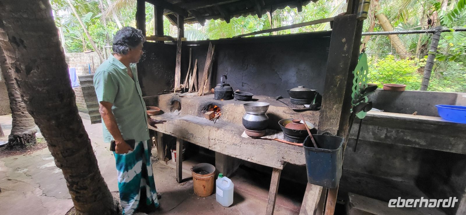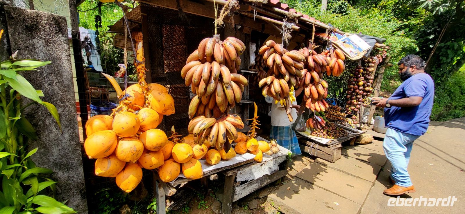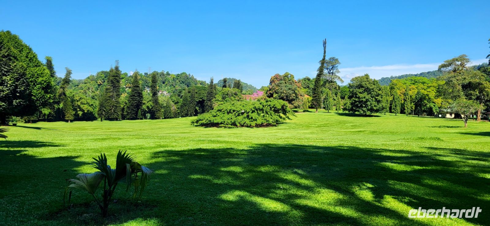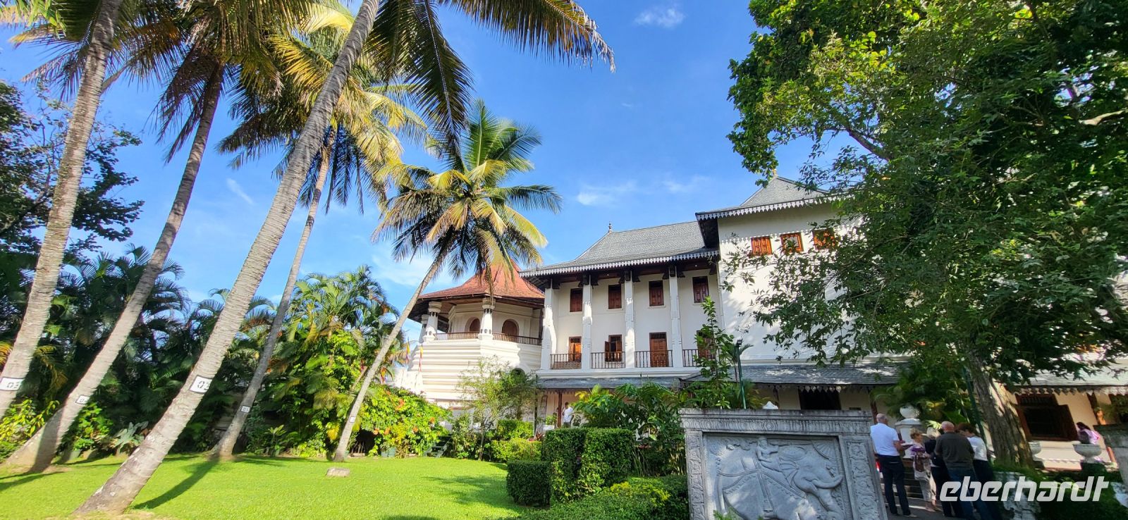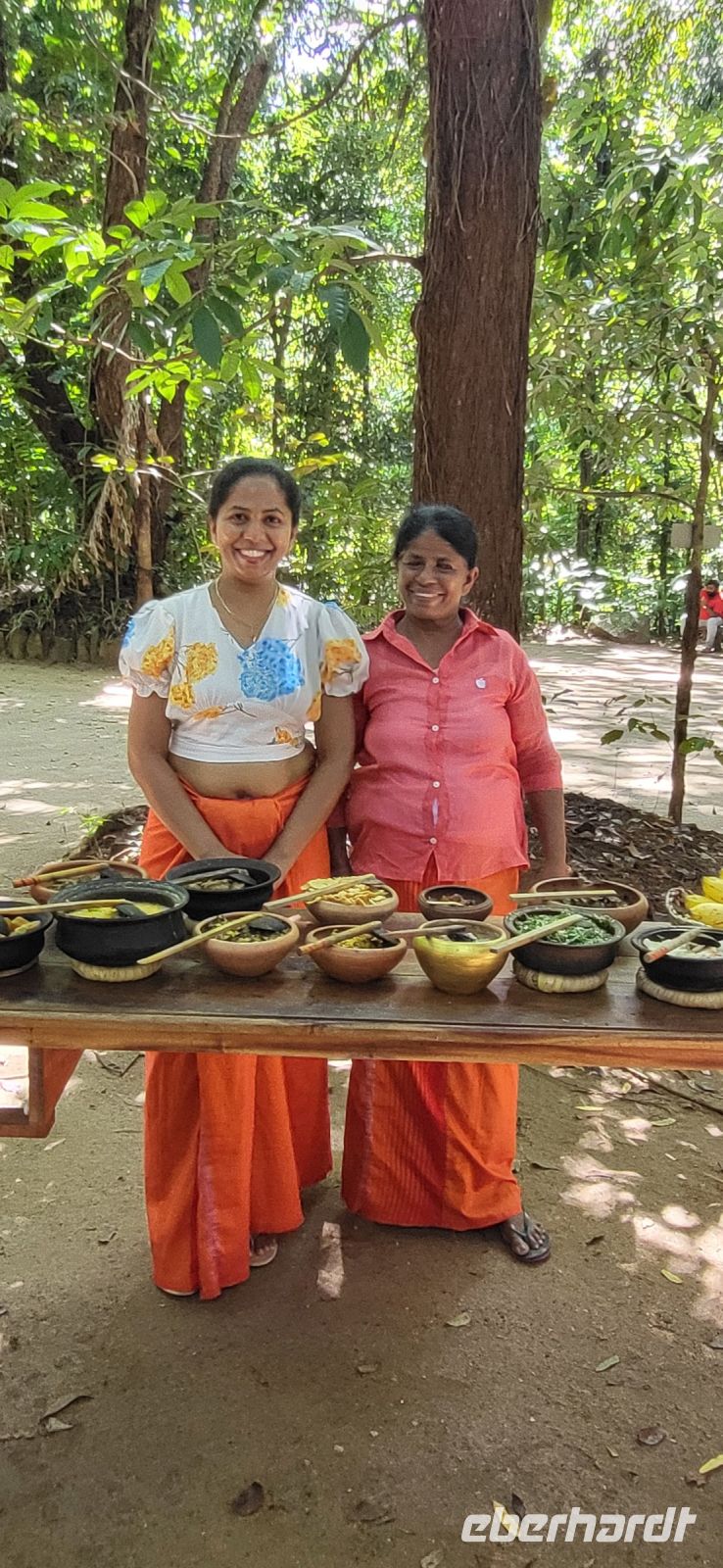 Nach einem herrlichen Frühstück starten wir zu einem Aussichtspunkt in Kandy, von wo aus wir eine tolle Übersicht und eine noch bessere Aussicht über die Stadt haben. Diese war einst von 1592 bis 1815 die Hauptstadt der Insel, bevor sie durch Colombo ersetzt wurde. Bei allerbesten Wetterverhältnissen steuern wir den nun 200 Jahre alten Botanischen Garten an und genießen die nächsten Stunden dieses wunderbare Stück Natur, bestaunen die vielen exotischen Pflanzen und Bäume, die hier aus der ganzen Welt zusammengetragen wurden. Neben Flora und Fauna hören und sehen wir auch, dass sich hier viele junge oder potenzielle Paare zum Kennenlernen treffen und je weniger man sich kennt, so näher man am Eingang sitzt und je vermeintlich besser man sich schon für gut befunden hat, umso weiter im Park hineinsitzt man auf den vielzähligen Parkbänken ringsherum. Und tatsächlich, wir sehen so einige junge Menschen ins Gespräch vertieft. In diesem wunderbaren Areal könnten wir uns noch Stunden aufhalten, jedoch werden wir heute zum Showkochen erwartet. Einige Fahrminuten später biegen wir von der Straße ab und befinden uns schlagartig mitten in der Natur. Hier werden wir von Köchin Sanda und einer Mitarbeiterin bereits erwartet, die uns zunächst mit einem Mangosaft einer noch unreifen Frucht begrüßen. Dieser schmeckt vorzüglich, erfrischend und ist auch für uns in dieser Form noch Neuland. Sanda demonstriert erst mal, was in keiner einheimischen Küche frisch fehlen darf, nämlich Kokosnuss. Schnell mit einer Sichel halbiert, werden die Hälften auf einer Art Hobel geraspelt, dann frisch verwendet oder mit Wasser ausgedrückt, damit frische Kokosmilch entsteht. Natürlich dürfen wir uns auch versuchen und stellen fest, so einfach wie es aussieht, ist es beim ersten Mal nicht. Sanda erklärt uns nun die verschiedenen Gerichte und bereitet für uns ein tolles Linsencurry auf offenem Feuer zu. Viele Zutaten werden hinzugefügt, die wir vor Ort bestaunen. Dazu fertigt sie noch einen Auberginen- sowie auch einen srilankanischen Gurkensalat. Das restliche Buffet haben die beiden Damen schon im Vorfeld für uns zubereitet, sodass wir bald auch alles kosten können. Heute nutzen wir dazu noch die Gelegenheit, das gewohnte Besteck gegen die eigenen Finger zu tauschen. Etwas ungewohnt, aber nach Erklärungen von Bonny und Sanda klappt es auch bei uns-ein völlig neues Essgefühl. Nach einem abschließenden Dessert verlassen wir diesen schönen Platz, wo wir in herrlicher Natur für uns gekocht und wir bestens gegessen haben. Es geht zurück nach Kandy Downtown, wo wir wieder den Kandy Lake und das ehrwürdige Queen’s Hotel passieren. Buntes Treiben mit viel Verkehr, Bussen, Tuk Tuks wuseln wild durcheinander, wir mittendrin mit unserem Busfahrer Kamal, der mit stoischer Gelassenheit den üblichen Verkehr mit Bravour meistert. Bevor des zum Folkloreabend mit den berühmten Kandy Tänzen geht, steuern wir noch einen einheimischen Supermarkt an, um uns mit den landestypischen Gewürzen zu mehr als zivilen Preisen zu versorgen. Die anschließenden Darbietungen der Kandy Tänzer sind geprägt von vielen farbenfrohen Kostümen, Tänzen, Akrobatik, Trommeln und Musik. Ein beeindruckendes Spektakel einer anderen Welt. Zurück im Golden Crowne Hotel genießen wir heute die Ruhe, das erneut sehr schmackhafte Abendbuffet, welches sich nochmals an Auswahl und Vielfalt übertrifft. In Sri Lanka sind wir nun wirklich im Schlaraffenland angekommen.