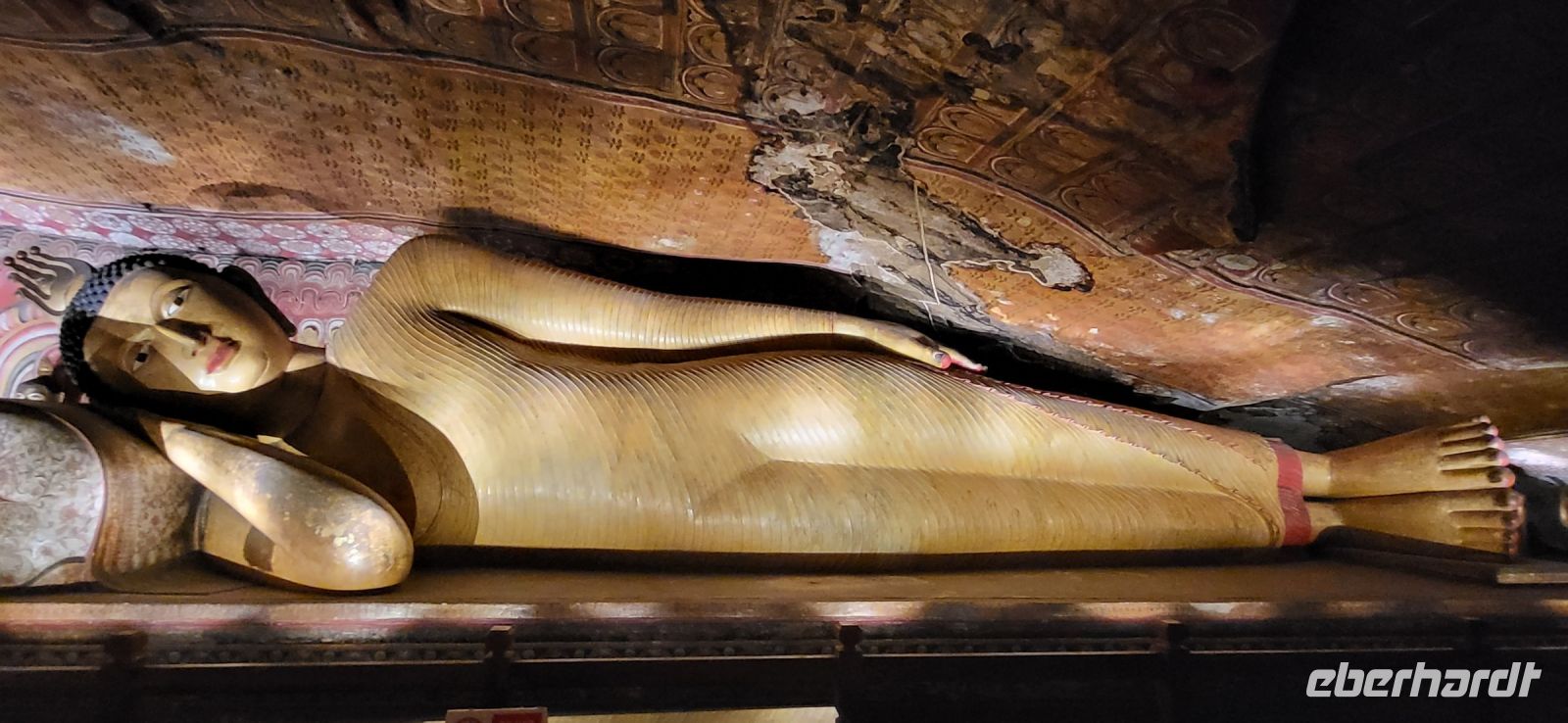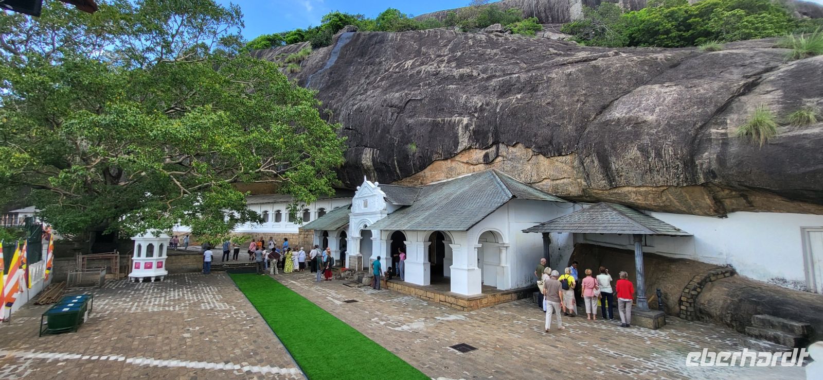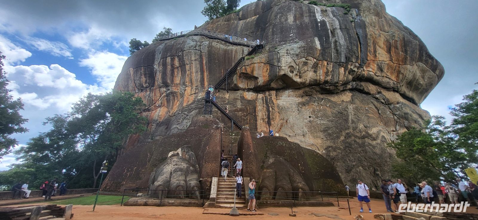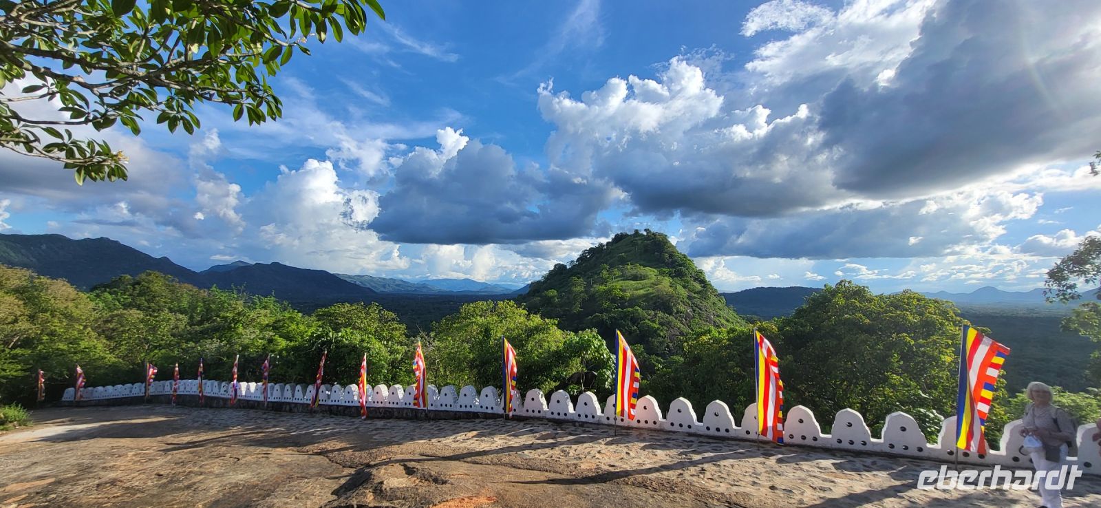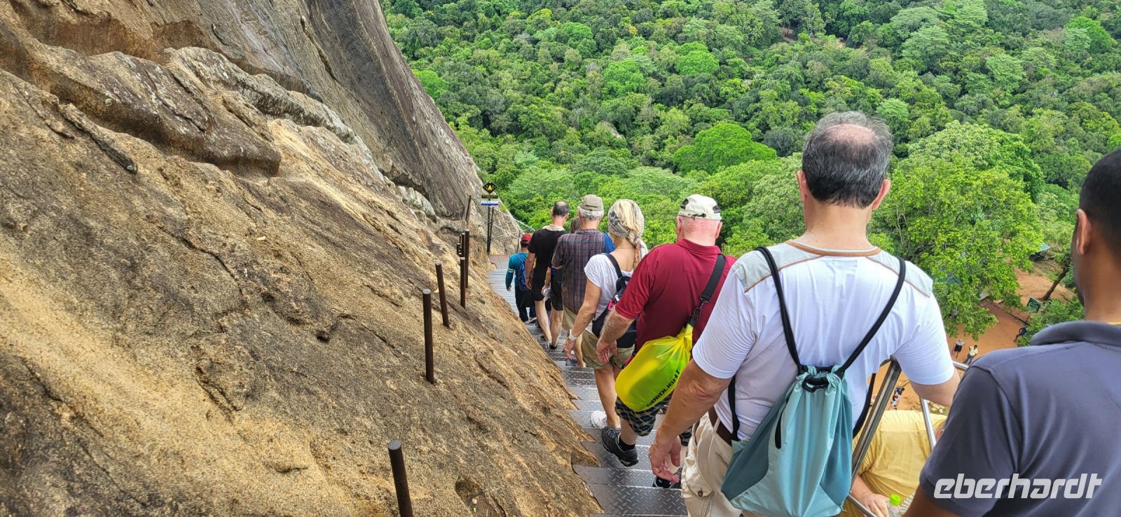 Der heutige Tag startet sportlich. Nach einem genüsslichen Frühstück fahren wir nach Sigiriya, um den berühmten Löwenfelsen zu bezwingen. Leider sind wir mit dem Gedanken nicht alleine und so machen sich vor und hinter uns ebenso am frühen Morgen weitere Touristen auf den Weg. Dank unseres versierten Reiseleiters Bonny, führt uns dieser abseits der vielen Touristen an einem beinahe ebenerdigen Weg nach oben, sodass wir nur noch wenige Stufen steigen müssen, bis wir schließlich am Fuße des Löwenfelsens sind, geht es mit dem Großteil der Gruppe zum Aufstieg der historischen Felsenfestung über eine Stahltreppe. Wir machen uns bewusst, dass die Menschen der damaligen Zeit diese Höhe mit wesentlich einfacheren Mitteln bezwungen haben als wir heutzutage. Oben angekommen, werden wir mit einem grandiosen Ausblick über die üppige Natur und 360° Rundumblick belohnt. Hier sieht man u.a. noch die Grundmauern des damaligen Palastgebäudes, einer der Zisternen, in denen einst Regenwasser gespeichert wurde und somit die Wasserversorgung auch bei längerer Belagerung garantierte. Ebenso ist auch den Thorn des damaligen Herrschers gut erhalten und überhaupt ist es ein beachtliches Areal von drei Hektar auf 200 m Höhe gelegen. Wieder am Fuße und somit den Tatzen des ehemaligen Löwensymbols am Aufgang angekommen, bestaunen wir die bekannten Wolkenmädchen. 1500 Jahre alte Malereien finden wir noch sehr gut erhalten an einer Wand. Fotografieren dürfen wir leider nicht und so bleibt uns nur die Erinnerung. Nachdem wir alles in Ruhe genossen haben, geht es wieder hinunter ins Tal. Wir sind mittags froh, ein schönes Seidengeschäft anzusteuern, wo wir nicht nur Toiletten, sondern auch schöne Kleidung vorfinden. Beeindruckend wird uns gezeigt, wie man aus etlichen Metern Stoff einen wunderschönen Sari für die Damen wickelt und bindet. So mancher nutzt die Gelegenheit aus dem verschwitzten Shirt in ein neues, frisch erworbenes Hemd zu schlüpfen. Wieder halten wir in einem schönen Lokal zum Mittagessen und können erst mal das Erlebte sacken lassen. Nachmittags erreichen wir Kandy, die ehemalige Hauptstadt Sri Lankas, welche heute u.a. für den sogenannten Zahntempel bekannt ist. In unserem eigentlich gebuchten Hotel erfahren wir, dass dieses bedauerlicherweise überbucht ist und wir auf ein anderes Hotel umgebucht wurden. Es lässt sich leider nicht ändern und nach einigen Fahrminuten erreichen wir das Golden Crown Hotel, welches für die nächsten beiden Nächte unsere Unterkunft sein wird. Bis zum Abendessen nutzt so mancher die freien Stunden um im wunderschönen Infinity-Pool zu baden oder einfach mal ein wenig zu relaxen. Heute dürfen wir das reichhaltig und liebevoll gestaltete Buffet stürmen, denn wir haben uns reichlich sportlich betätigt.