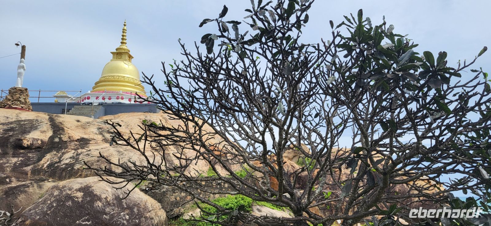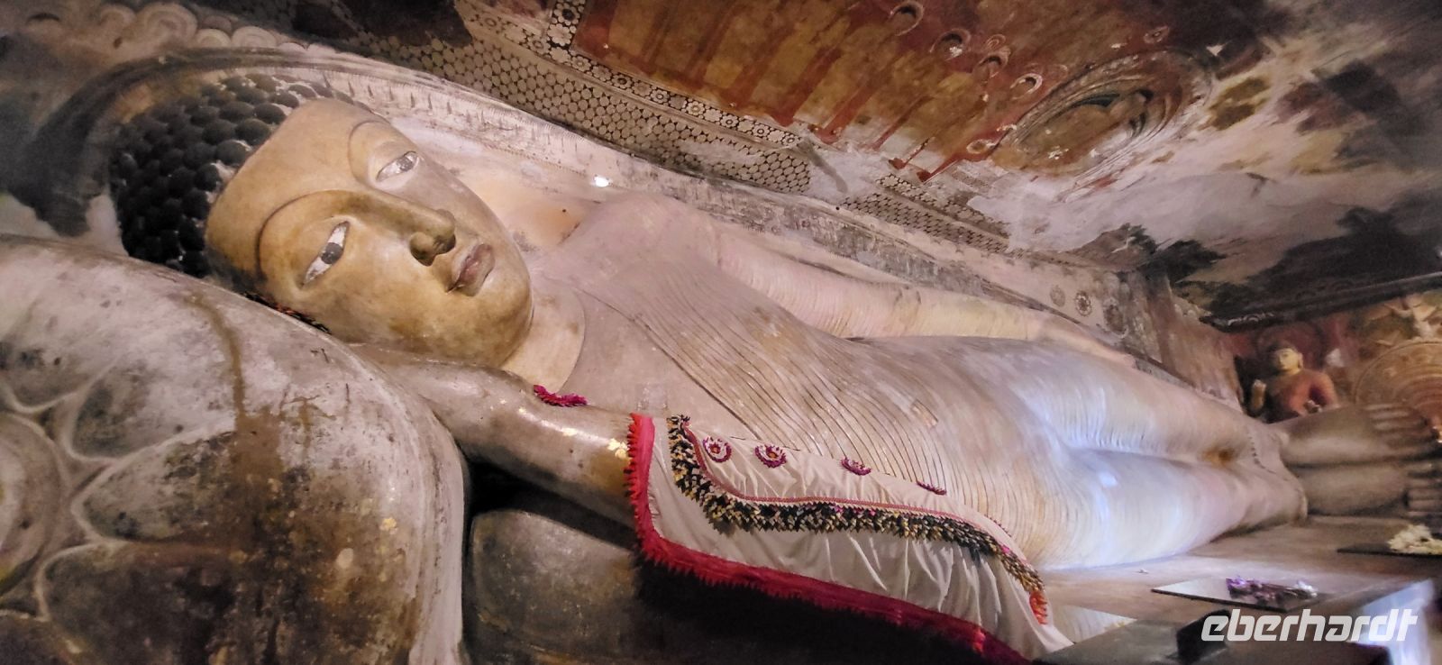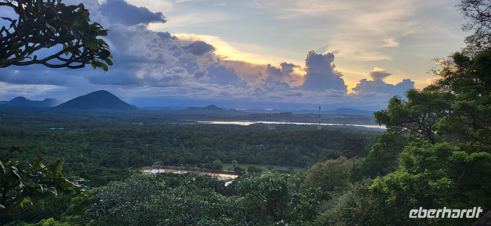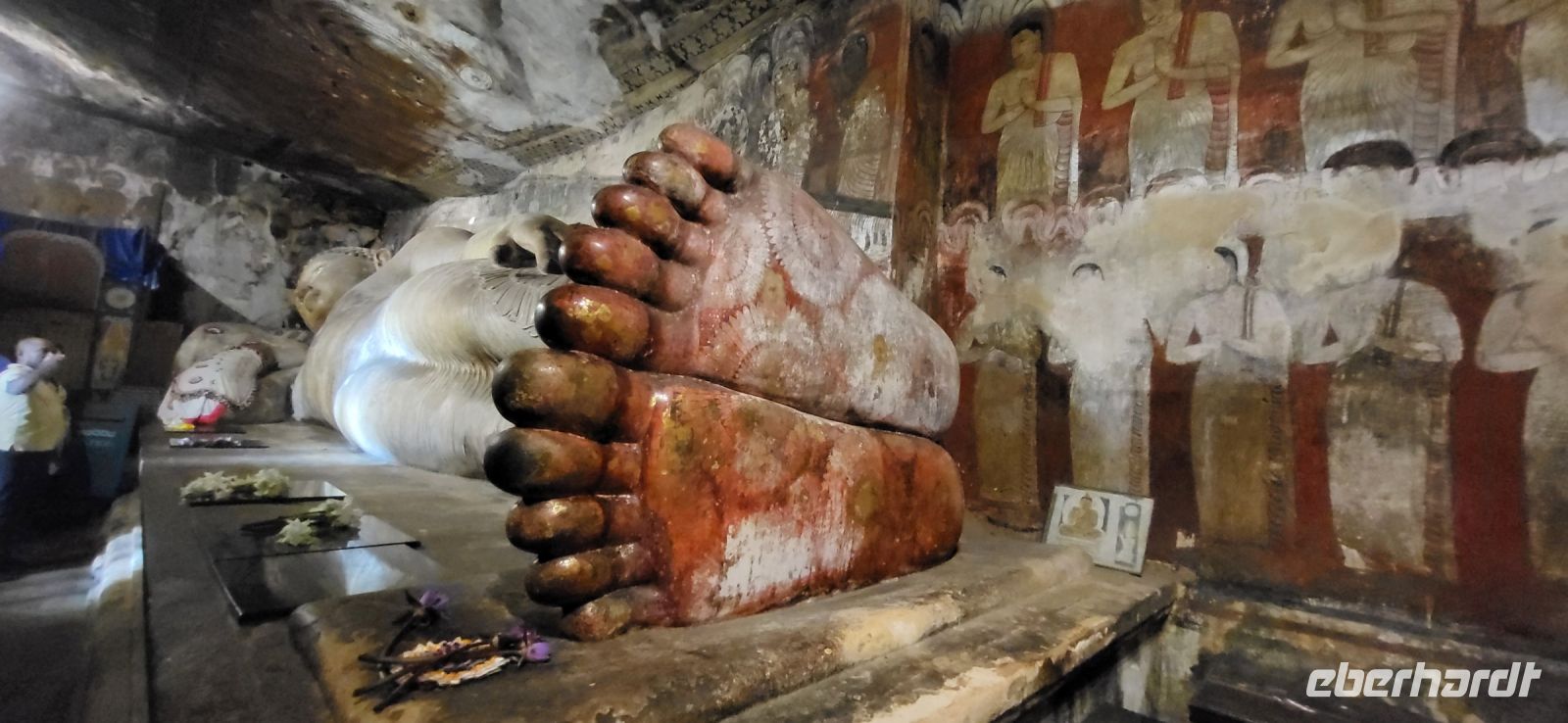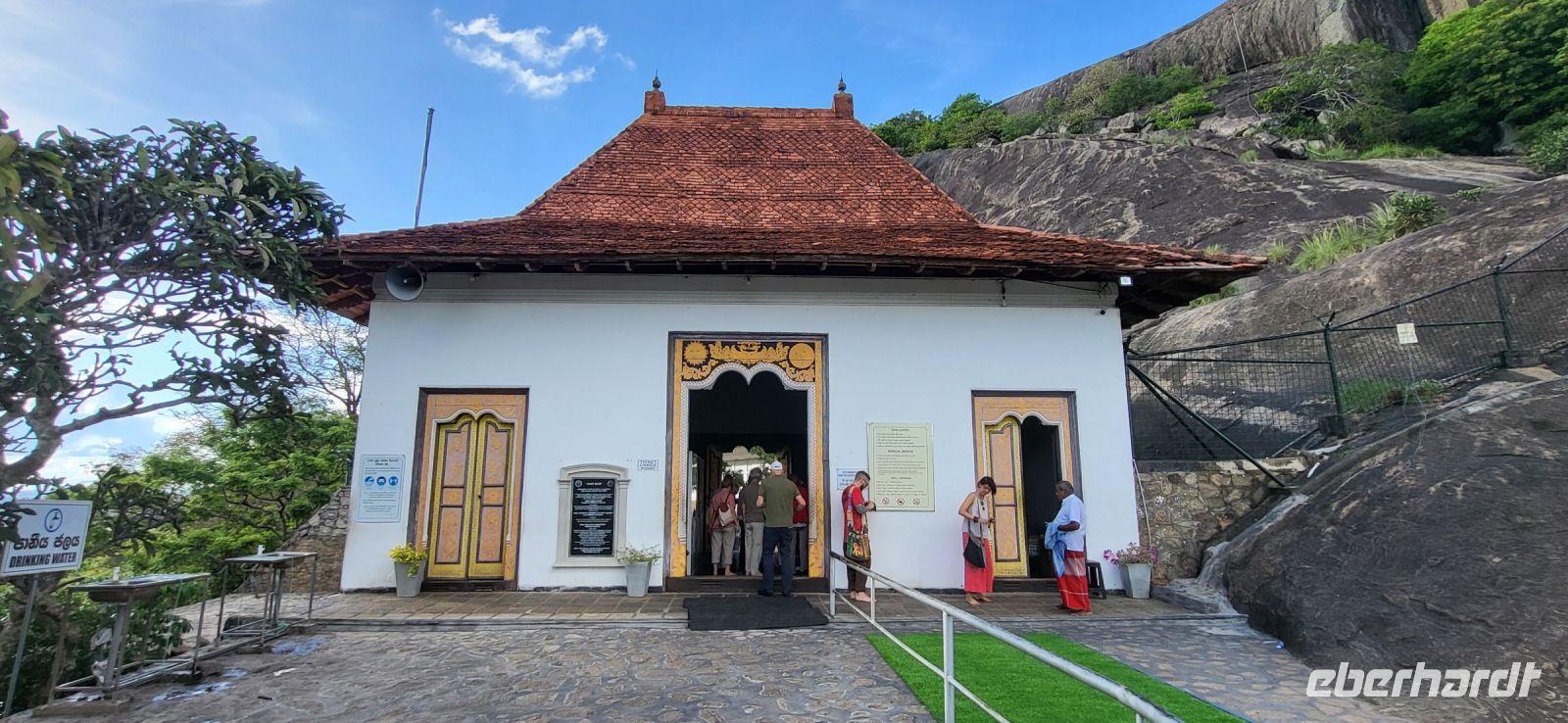 Der heutige Tag startet sportlich. Nach einem genüsslichen Frühstück fahren wir nach Sigiriya, um den berühmten Löwenfelsen zu bezwingen. Leider sind wir mit dem Gedanken nicht alleine und so machen sich vor und hinter uns ebenso am frühen Morgen weitere Touristen auf den Weg. Dank unseres versierten Reiseleiters Bonny, führt uns dieser abseits der vielen Touristen an einem beinahe ebenerdigen Weg nach oben, sodass wir nur noch wenige Stufen steigen müssen, bis wir schließlich am Fuße des Löwenfelsens sind, geht es mit dem Großteil der Gruppe zum Aufstieg der historischen Felsenfestung über eine Stahltreppe. Wir machen uns bewusst, dass die Menschen der damaligen Zeit diese Höhe mit wesentlich einfacheren Mitteln bezwungen haben als wir heutzutage. Oben angekommen, werden wir mit einem grandiosen Ausblick über die üppige Natur und 360° Rundumblick belohnt. Hier sieht man u.a. noch die Grundmauern des damaligen Palastgebäudes, einer der Zisternen, in denen einst Regenwasser gespeichert wurde und somit die Wasserversorgung auch bei längerer Belagerung garantierte. Ebenso ist auch den Thorn des damaligen Herrschers gut erhalten und überhaupt ist es ein beachtliches Areal von drei Hektar auf 200 m Höhe gelegen. Wieder am Fuße und somit den Tatzen des ehemaligen Löwensymbols am Aufgang angekommen, bestaunen wir die bekannten Wolkenmädchen. 1500 Jahre alte Malereien finden wir noch sehr gut erhalten an einer Wand. Fotografieren dürfen wir leider nicht und so bleibt uns nur die Erinnerung. Nachdem wir alles in Ruhe genossen haben, geht es wieder hinunter ins Tal. Wir sind mittags froh, ein schönes Seidengeschäft anzusteuern, wo wir nicht nur Toiletten, sondern auch schöne Kleidung vorfinden. Beeindruckend wird uns gezeigt, wie man aus etlichen Metern Stoff einen wunderschönen Sari für die Damen wickelt und bindet. So mancher nutzt die Gelegenheit aus dem verschwitzten Shirt in ein neues, frisch erworbenes Hemd zu schlüpfen. Wieder halten wir in einem schönen Lokal zum Mittagessen und können erst mal das Erlebte sacken lassen. Nachmittags erreichen wir Kandy, die ehemalige Hauptstadt Sri Lankas, welche heute u.a. für den sogenannten Zahntempel bekannt ist. In unserem eigentlich gebuchten Hotel erfahren wir, dass dieses bedauerlicherweise überbucht ist und wir auf ein anderes Hotel umgebucht wurden. Es lässt sich leider nicht ändern und nach einigen Fahrminuten erreichen wir das Golden Crown Hotel, welches für die nächsten beiden Nächte unsere Unterkunft sein wird. Bis zum Abendessen nutzt so mancher die freien Stunden um im wunderschönen Infinity-Pool zu baden oder einfach mal ein wenig zu relaxen. Heute dürfen wir das reichhaltig und liebevoll gestaltete Buffet stürmen, denn wir haben uns reichlich sportlich betätigt.