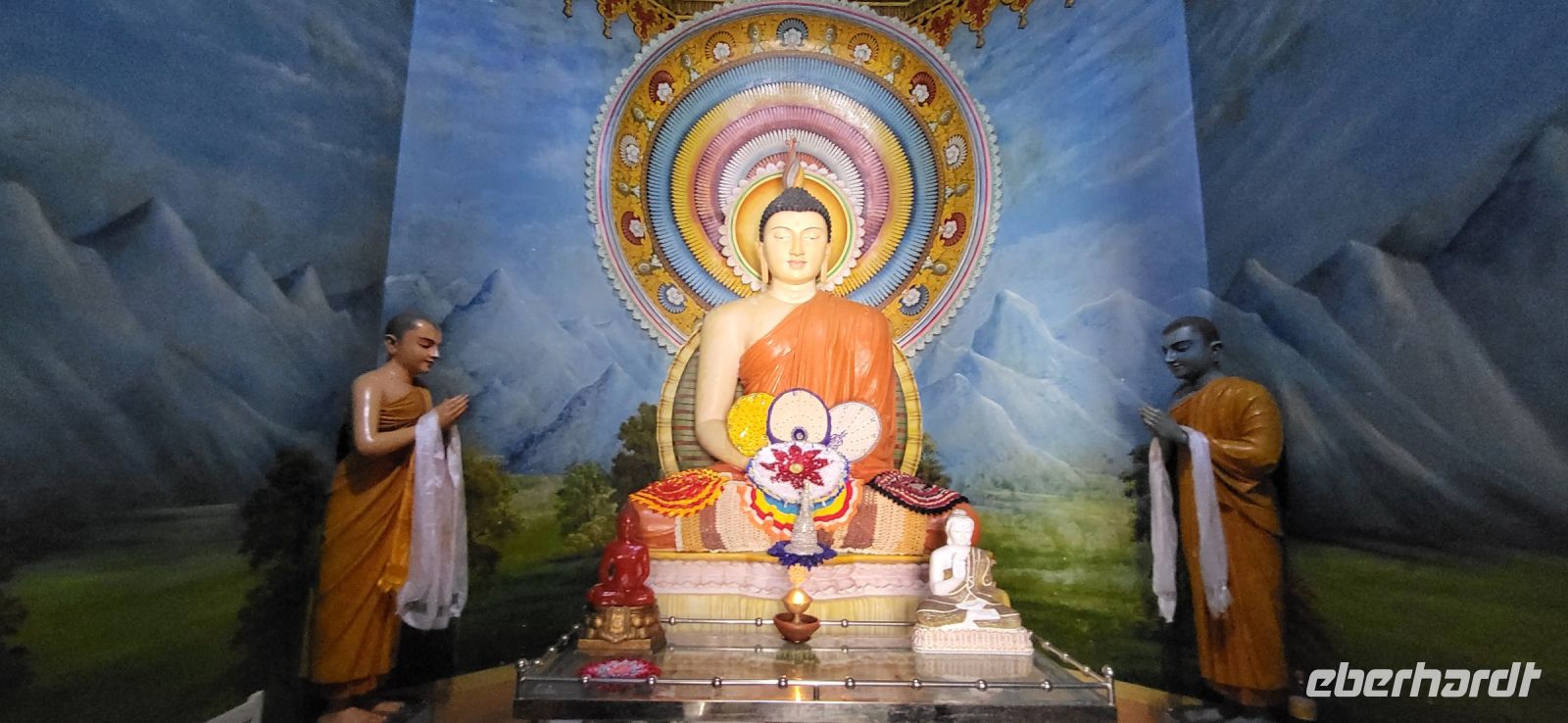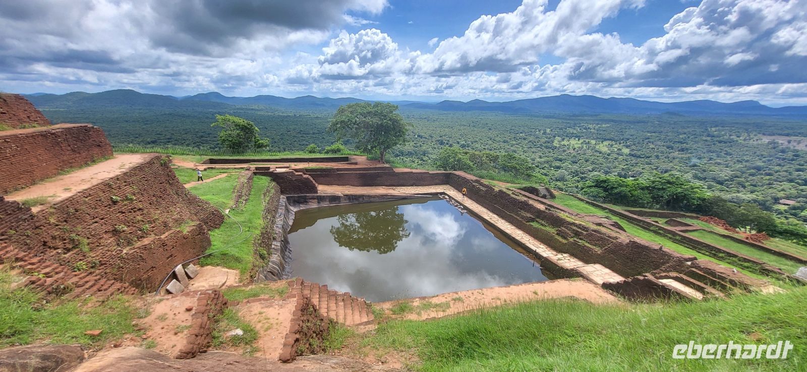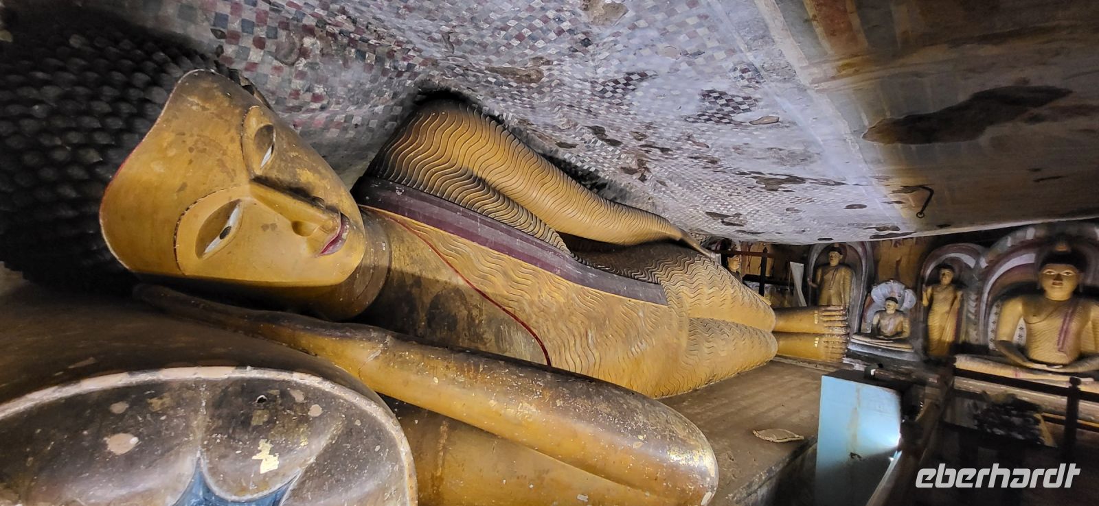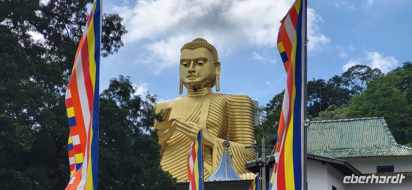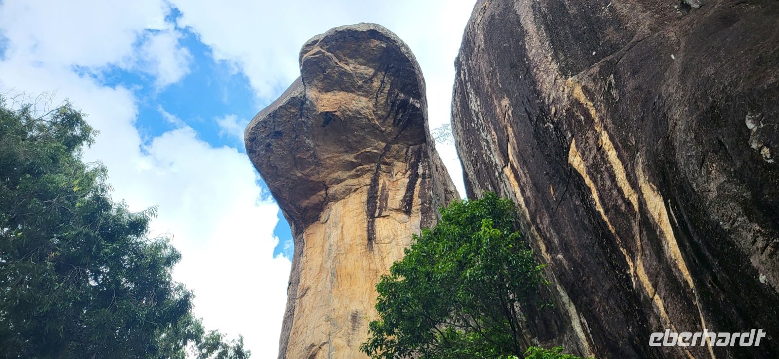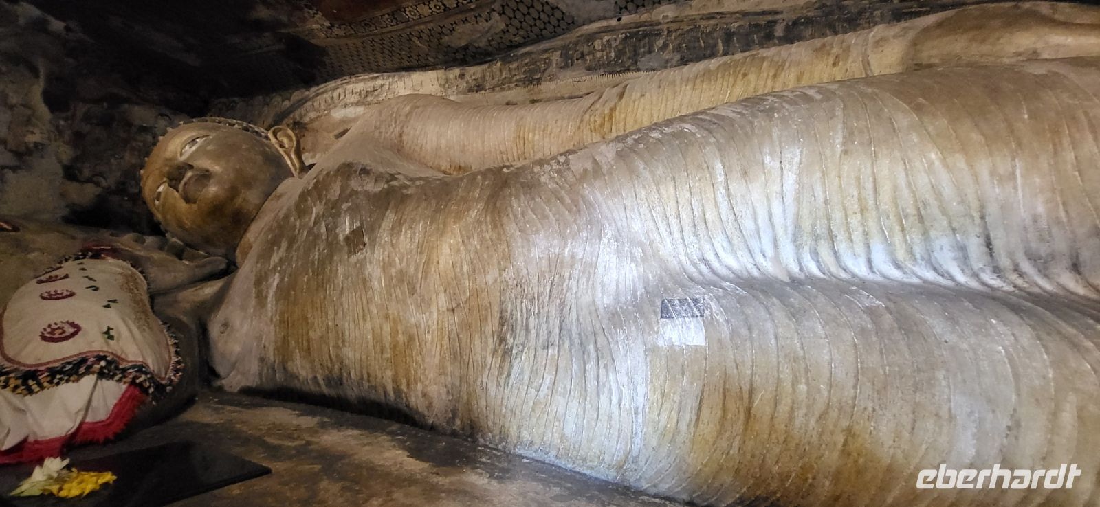 Der heutige Tag startet sportlich. Nach einem genüsslichen Frühstück fahren wir nach Sigiriya, um den berühmten Löwenfelsen zu bezwingen. Leider sind wir mit dem Gedanken nicht alleine und so machen sich vor und hinter uns ebenso am frühen Morgen weitere Touristen auf den Weg. Dank unseres versierten Reiseleiters Bonny, führt uns dieser abseits der vielen Touristen an einem beinahe ebenerdigen Weg nach oben, sodass wir nur noch wenige Stufen steigen müssen, bis wir schließlich am Fuße des Löwenfelsens sind, geht es mit dem Großteil der Gruppe zum Aufstieg der historischen Felsenfestung über eine Stahltreppe. Wir machen uns bewusst, dass die Menschen der damaligen Zeit diese Höhe mit wesentlich einfacheren Mitteln bezwungen haben als wir heutzutage. Oben angekommen, werden wir mit einem grandiosen Ausblick über die üppige Natur und 360° Rundumblick belohnt. Hier sieht man u.a. noch die Grundmauern des damaligen Palastgebäudes, einer der Zisternen, in denen einst Regenwasser gespeichert wurde und somit die Wasserversorgung auch bei längerer Belagerung garantierte. Ebenso ist auch den Thorn des damaligen Herrschers gut erhalten und überhaupt ist es ein beachtliches Areal von drei Hektar auf 200 m Höhe gelegen. Wieder am Fuße und somit den Tatzen des ehemaligen Löwensymbols am Aufgang angekommen, bestaunen wir die bekannten Wolkenmädchen. 1500 Jahre alte Malereien finden wir noch sehr gut erhalten an einer Wand. Fotografieren dürfen wir leider nicht und so bleibt uns nur die Erinnerung. Nachdem wir alles in Ruhe genossen haben, geht es wieder hinunter ins Tal. Wir sind mittags froh, ein schönes Seidengeschäft anzusteuern, wo wir nicht nur Toiletten, sondern auch schöne Kleidung vorfinden. Beeindruckend wird uns gezeigt, wie man aus etlichen Metern Stoff einen wunderschönen Sari für die Damen wickelt und bindet. So mancher nutzt die Gelegenheit aus dem verschwitzten Shirt in ein neues, frisch erworbenes Hemd zu schlüpfen. Wieder halten wir in einem schönen Lokal zum Mittagessen und können erst mal das Erlebte sacken lassen. Nachmittags erreichen wir Kandy, die ehemalige Hauptstadt Sri Lankas, welche heute u.a. für den sogenannten Zahntempel bekannt ist. In unserem eigentlich gebuchten Hotel erfahren wir, dass dieses bedauerlicherweise überbucht ist und wir auf ein anderes Hotel umgebucht wurden. Es lässt sich leider nicht ändern und nach einigen Fahrminuten erreichen wir das Golden Crown Hotel, welches für die nächsten beiden Nächte unsere Unterkunft sein wird. Bis zum Abendessen nutzt so mancher die freien Stunden um im wunderschönen Infinity-Pool zu baden oder einfach mal ein wenig zu relaxen. Heute dürfen wir das reichhaltig und liebevoll gestaltete Buffet stürmen, denn wir haben uns reichlich sportlich betätigt.