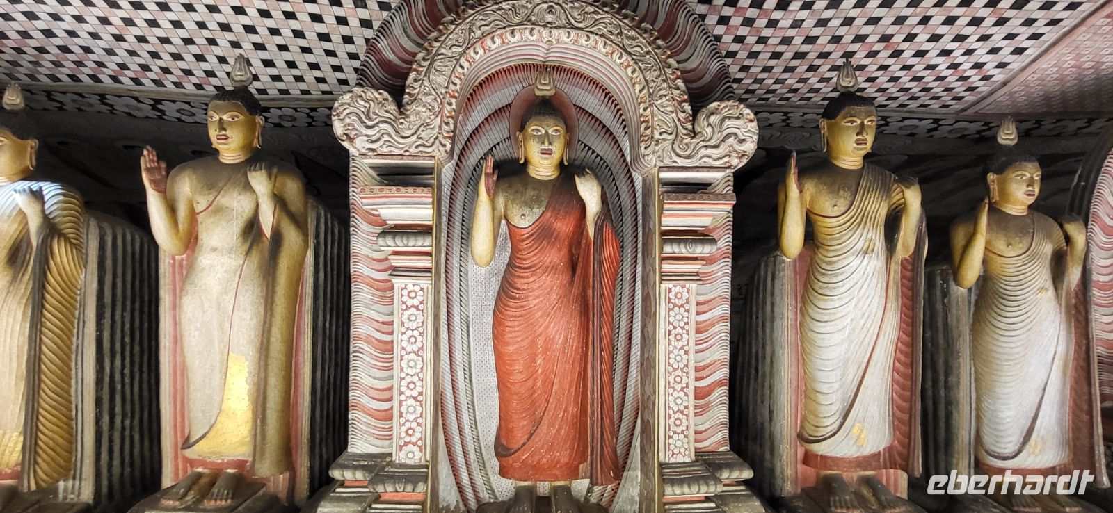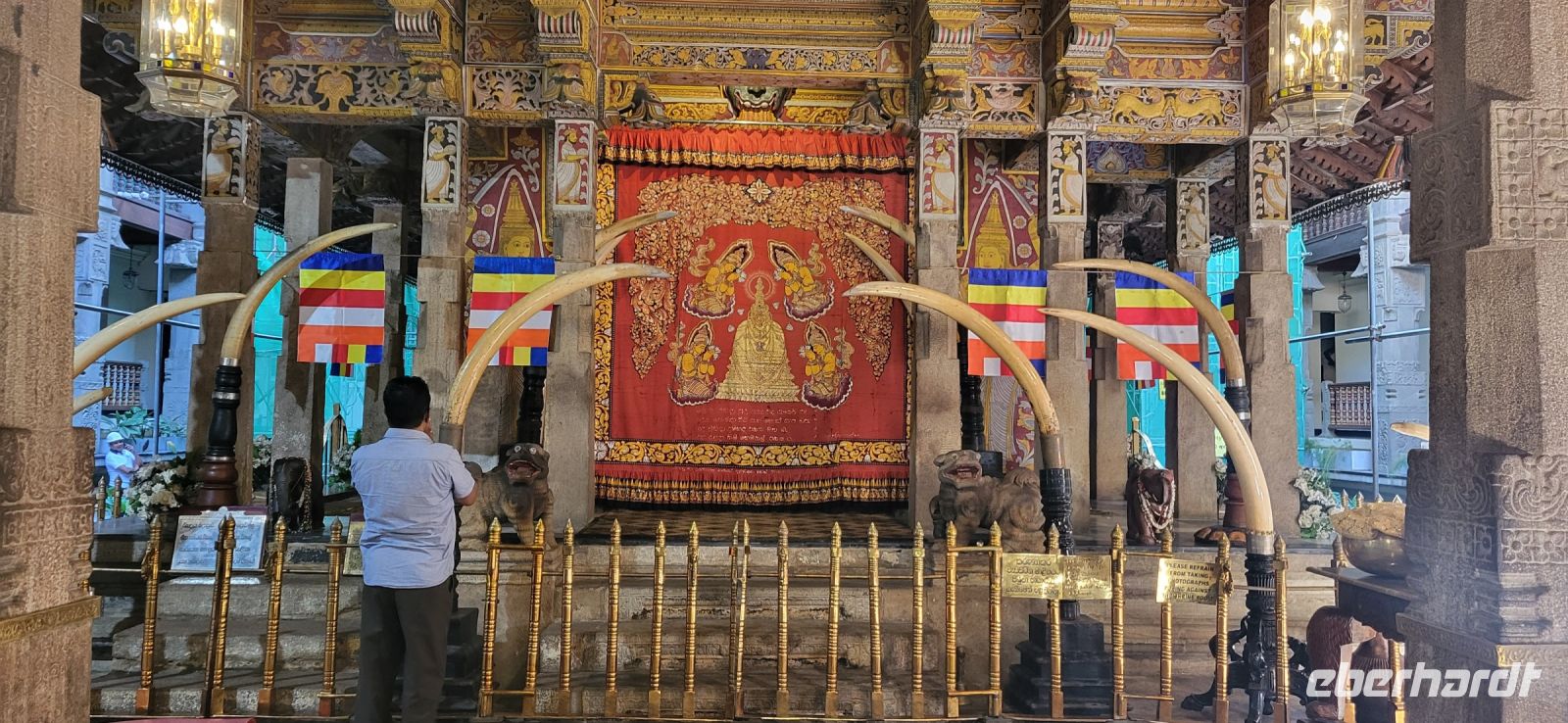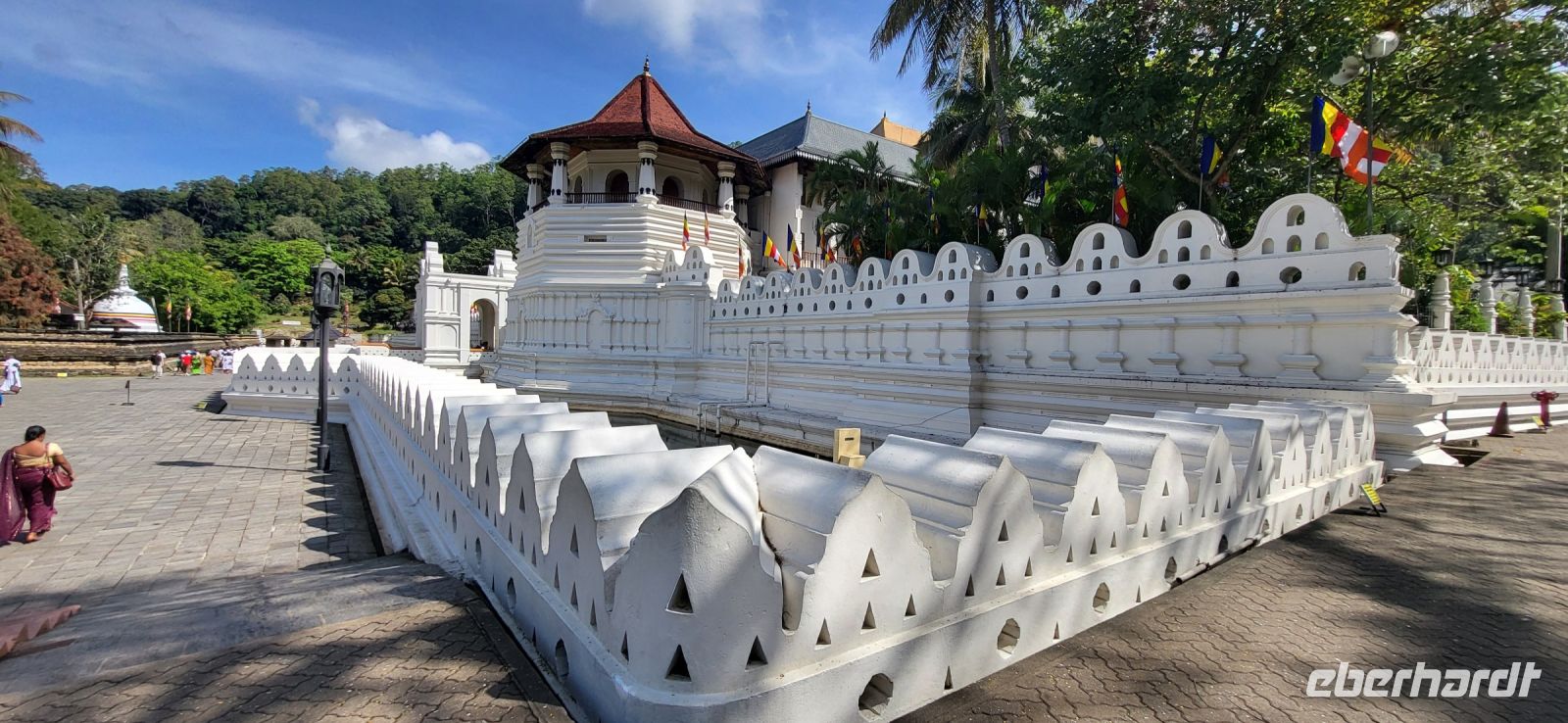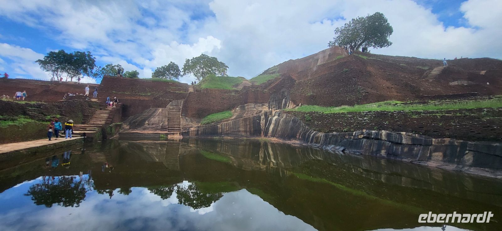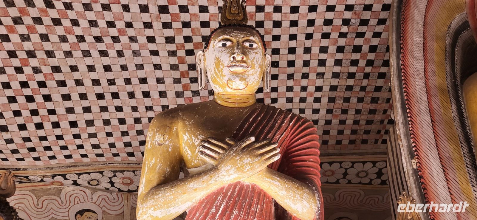 Der heutige Tag startet sportlich. Nach einem genüsslichen Frühstück fahren wir nach Sigiriya, um den berühmten Löwenfelsen zu bezwingen. Leider sind wir mit dem Gedanken nicht alleine und so machen sich vor und hinter uns ebenso am frühen Morgen weitere Touristen auf den Weg. Dank unseres versierten Reiseleiters Bonny, führt uns dieser abseits der vielen Touristen an einem beinahe ebenerdigen Weg nach oben, sodass wir nur noch wenige Stufen steigen müssen, bis wir schließlich am Fuße des Löwenfelsens sind, geht es mit dem Großteil der Gruppe zum Aufstieg der historischen Felsenfestung über eine Stahltreppe. Wir machen uns bewusst, dass die Menschen der damaligen Zeit diese Höhe mit wesentlich einfacheren Mitteln bezwungen haben als wir heutzutage. Oben angekommen, werden wir mit einem grandiosen Ausblick über die üppige Natur und 360° Rundumblick belohnt. Hier sieht man u.a. noch die Grundmauern des damaligen Palastgebäudes, einer der Zisternen, in denen einst Regenwasser gespeichert wurde und somit die Wasserversorgung auch bei längerer Belagerung garantierte. Ebenso ist auch den Thorn des damaligen Herrschers gut erhalten und überhaupt ist es ein beachtliches Areal von drei Hektar auf 200 m Höhe gelegen. Wieder am Fuße und somit den Tatzen des ehemaligen Löwensymbols am Aufgang angekommen, bestaunen wir die bekannten Wolkenmädchen. 1500 Jahre alte Malereien finden wir noch sehr gut erhalten an einer Wand. Fotografieren dürfen wir leider nicht und so bleibt uns nur die Erinnerung. Nachdem wir alles in Ruhe genossen haben, geht es wieder hinunter ins Tal. Wir sind mittags froh, ein schönes Seidengeschäft anzusteuern, wo wir nicht nur Toiletten, sondern auch schöne Kleidung vorfinden. Beeindruckend wird uns gezeigt, wie man aus etlichen Metern Stoff einen wunderschönen Sari für die Damen wickelt und bindet. So mancher nutzt die Gelegenheit aus dem verschwitzten Shirt in ein neues, frisch erworbenes Hemd zu schlüpfen. Wieder halten wir in einem schönen Lokal zum Mittagessen und können erst mal das Erlebte sacken lassen. Nachmittags erreichen wir Kandy, die ehemalige Hauptstadt Sri Lankas, welche heute u.a. für den sogenannten Zahntempel bekannt ist. In unserem eigentlich gebuchten Hotel erfahren wir, dass dieses bedauerlicherweise überbucht ist und wir auf ein anderes Hotel umgebucht wurden. Es lässt sich leider nicht ändern und nach einigen Fahrminuten erreichen wir das Golden Crown Hotel, welches für die nächsten beiden Nächte unsere Unterkunft sein wird. Bis zum Abendessen nutzt so mancher die freien Stunden um im wunderschönen Infinity-Pool zu baden oder einfach mal ein wenig zu relaxen. Heute dürfen wir das reichhaltig und liebevoll gestaltete Buffet stürmen, denn wir haben uns reichlich sportlich betätigt.