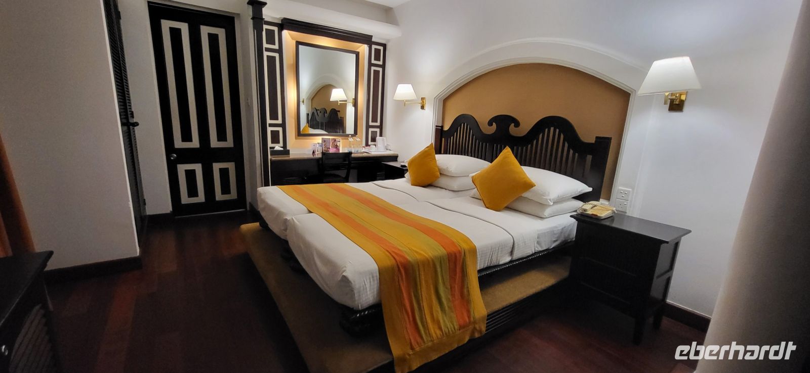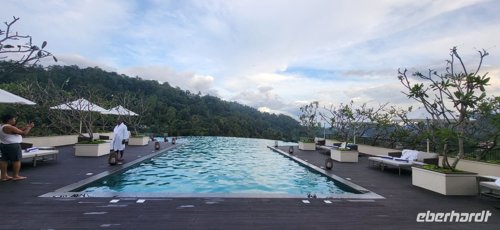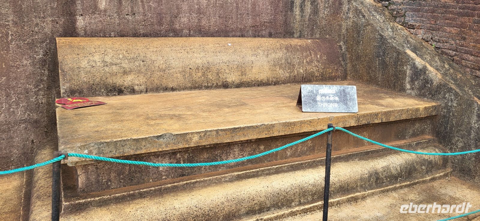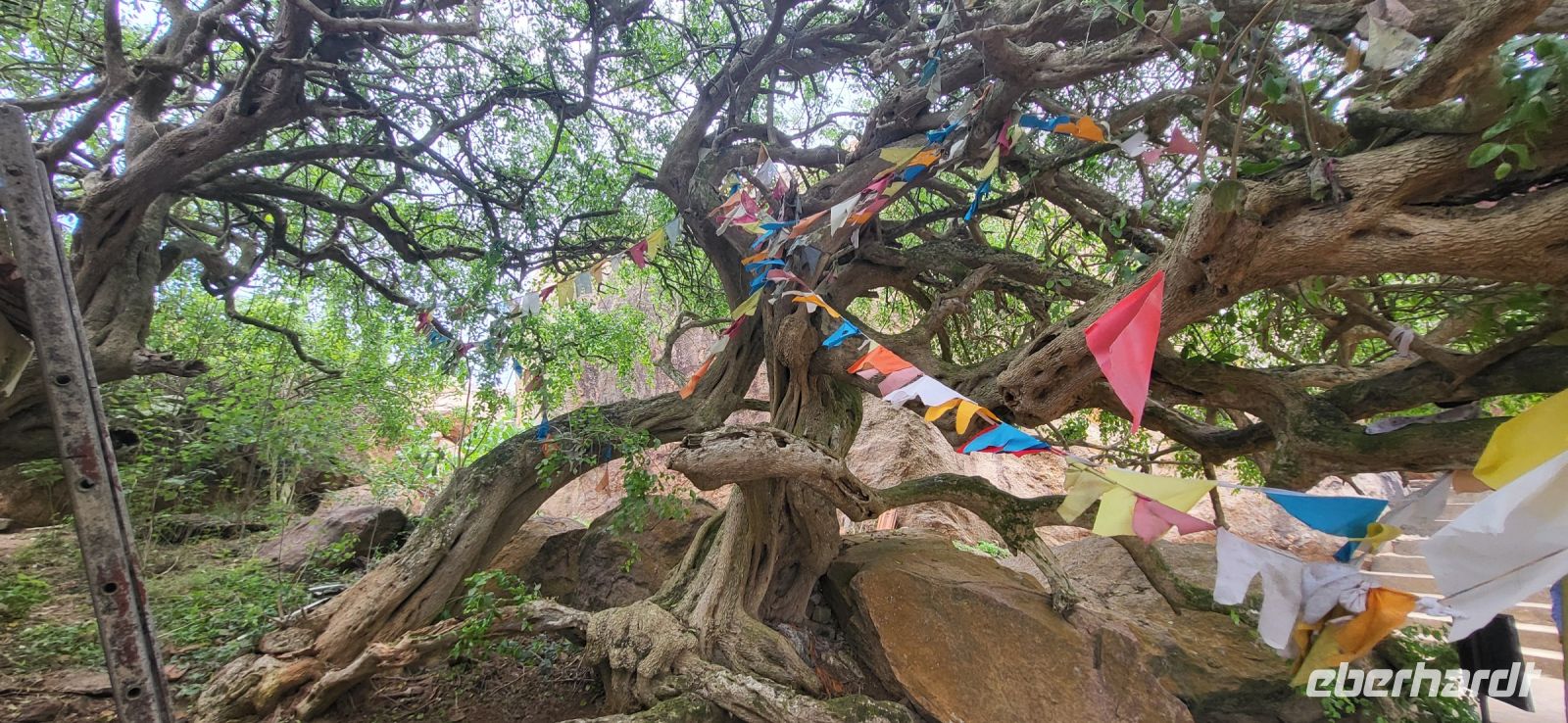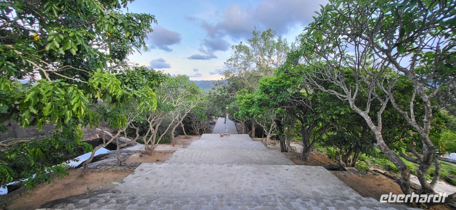 Der heutige Tag startet sportlich. Nach einem genüsslichen Frühstück fahren wir nach Sigiriya, um den berühmten Löwenfelsen zu bezwingen. Leider sind wir mit dem Gedanken nicht alleine und so machen sich vor und hinter uns ebenso am frühen Morgen weitere Touristen auf den Weg. Dank unseres versierten Reiseleiters Bonny, führt uns dieser abseits der vielen Touristen an einem beinahe ebenerdigen Weg nach oben, sodass wir nur noch wenige Stufen steigen müssen, bis wir schließlich am Fuße des Löwenfelsens sind, geht es mit dem Großteil der Gruppe zum Aufstieg der historischen Felsenfestung über eine Stahltreppe. Wir machen uns bewusst, dass die Menschen der damaligen Zeit diese Höhe mit wesentlich einfacheren Mitteln bezwungen haben als wir heutzutage. Oben angekommen, werden wir mit einem grandiosen Ausblick über die üppige Natur und 360° Rundumblick belohnt. Hier sieht man u.a. noch die Grundmauern des damaligen Palastgebäudes, einer der Zisternen, in denen einst Regenwasser gespeichert wurde und somit die Wasserversorgung auch bei längerer Belagerung garantierte. Ebenso ist auch den Thorn des damaligen Herrschers gut erhalten und überhaupt ist es ein beachtliches Areal von drei Hektar auf 200 m Höhe gelegen. Wieder am Fuße und somit den Tatzen des ehemaligen Löwensymbols am Aufgang angekommen, bestaunen wir die bekannten Wolkenmädchen. 1500 Jahre alte Malereien finden wir noch sehr gut erhalten an einer Wand. Fotografieren dürfen wir leider nicht und so bleibt uns nur die Erinnerung. Nachdem wir alles in Ruhe genossen haben, geht es wieder hinunter ins Tal. Wir sind mittags froh, ein schönes Seidengeschäft anzusteuern, wo wir nicht nur Toiletten, sondern auch schöne Kleidung vorfinden. Beeindruckend wird uns gezeigt, wie man aus etlichen Metern Stoff einen wunderschönen Sari für die Damen wickelt und bindet. So mancher nutzt die Gelegenheit aus dem verschwitzten Shirt in ein neues, frisch erworbenes Hemd zu schlüpfen. Wieder halten wir in einem schönen Lokal zum Mittagessen und können erst mal das Erlebte sacken lassen. Nachmittags erreichen wir Kandy, die ehemalige Hauptstadt Sri Lankas, welche heute u.a. für den sogenannten Zahntempel bekannt ist. In unserem eigentlich gebuchten Hotel erfahren wir, dass dieses bedauerlicherweise überbucht ist und wir auf ein anderes Hotel umgebucht wurden. Es lässt sich leider nicht ändern und nach einigen Fahrminuten erreichen wir das Golden Crown Hotel, welches für die nächsten beiden Nächte unsere Unterkunft sein wird. Bis zum Abendessen nutzt so mancher die freien Stunden um im wunderschönen Infinity-Pool zu baden oder einfach mal ein wenig zu relaxen. Heute dürfen wir das reichhaltig und liebevoll gestaltete Buffet stürmen, denn wir haben uns reichlich sportlich betätigt.