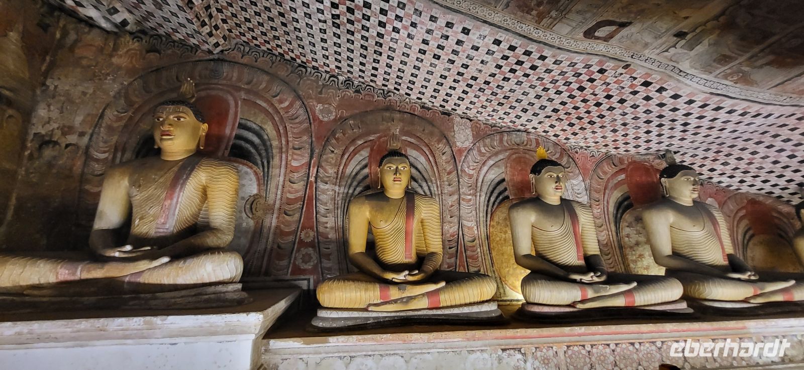 Heute Morgen verlassen wir nach einem letzten tollen Frühstück im Hotel Colombo durch den Großstadtdschungel. Doch zunächst zeigt man uns eine Karte Sri Lankas mit unserer Reiseroute der nächsten zwei Wochen. Der Inselstaat ist von der Fläche vergleichbar mit Bayern, liegt 800 Km nördlich des Äquators, misst 432 Km von Nord nach Süd sowie 224 Km von West nach Ost. Den Umriss der Insel kann man sich gut merken, denn er sieht wie eine Hand von innen aus. Auf geht’s mit unserem bequemen „Milka-Mobil“-ja, wir haben einen lilafarbenen Bus und erneut erleben wir die Stadt eher ruhig, da heute Samstag ist. Bonny überrascht uns mit einem Abstecher nach Negombo, nördlich der Hauptstadt gelegen, wo wir einen Fischmarkt mit fangfrischen Meeresbewohnern aller Art zu sehen bekommen. Etwas gewöhnungsbedürftig für unsere Nasen (am frühen Morgen), aber auf jeden Fall sehr interessant zu sehen. Dazu noch etliche Fischerboote in den schillerndsten Farben liegen am Fluss vor Anker. Auf unserer Weiterfahrt hören wir viel Interessantes über das Schulsystem des Landes, wo im Grunde allen Kindern eine gute Ausbildung kostenfrei und verpflichtend bereitgehalten wird. Am späten Vormittag erreichen wir die Kokosfabrik Colo in Mirigama und erhalten eine interessante Führung, die uns zeigt, wie aus der reifen Kokosnuss hochwertiges Kokospulver hergestellt wird und das finale Produkt für den Export gefertigt. Unseren Mittagsstopp erleben wir sehr idyllisch und sitzen in der Natur im schönen Restaurant Oak Ray. Nochmals gibt es ein schmackhaftes, einheimisches Buffet mit endlos vielen Köstlichkeiten. Die Weiterfahrt nach Dambulla führt uns durch üppige Natur, kleine Orte mit schönen Wohnhäusern. Am späten Nachmittag erreichen wir Dambulla und besteigen genau zur richtigen Zeit den Berg, der uns zum Höhlentempel führt. Malerische Aussicht auf die schöne Landschaft, die unter uns liegt, entlohnt uns für den etwas anstrengenden Aufstieg, der mittlerweile auch ohne viele Stufen verändert wurde. Oben angekommen staunen wir über die fünf imposanten Höhlen, die unzählige Buddhastatuen beherbergen, welche mitunter vor mehr als 2000 Jahren gefertigt wurden und bestens erhalten sind. Eine Augenweide und ein Einblick in eine andere Welt… Den Abstieg versüßt uns die herrliche Landschaft, die nun milden Temperaturen. Auf dem Weg zum Hotel sehen wir unglaubliche drei Elefanten am Straßenrand, deren Korridor wir passieren. Am frühen Abend erreichen wir unser Hotel, die Cinnamon Lodge in Habarana, beziehen unsere geschmackvollen Zimmer dieser Deluxanlage, die malerisch in die Natur eingelassen ist. Ein reichhaltiges Abendbuffet rundet den Tag ab. Nach so vielen neuen Eindrücken ziehen wir uns recht bald auf unsere Zimmer zurück in Vorbereitung auf den kommenden Tag mit neuen Abenteuern.