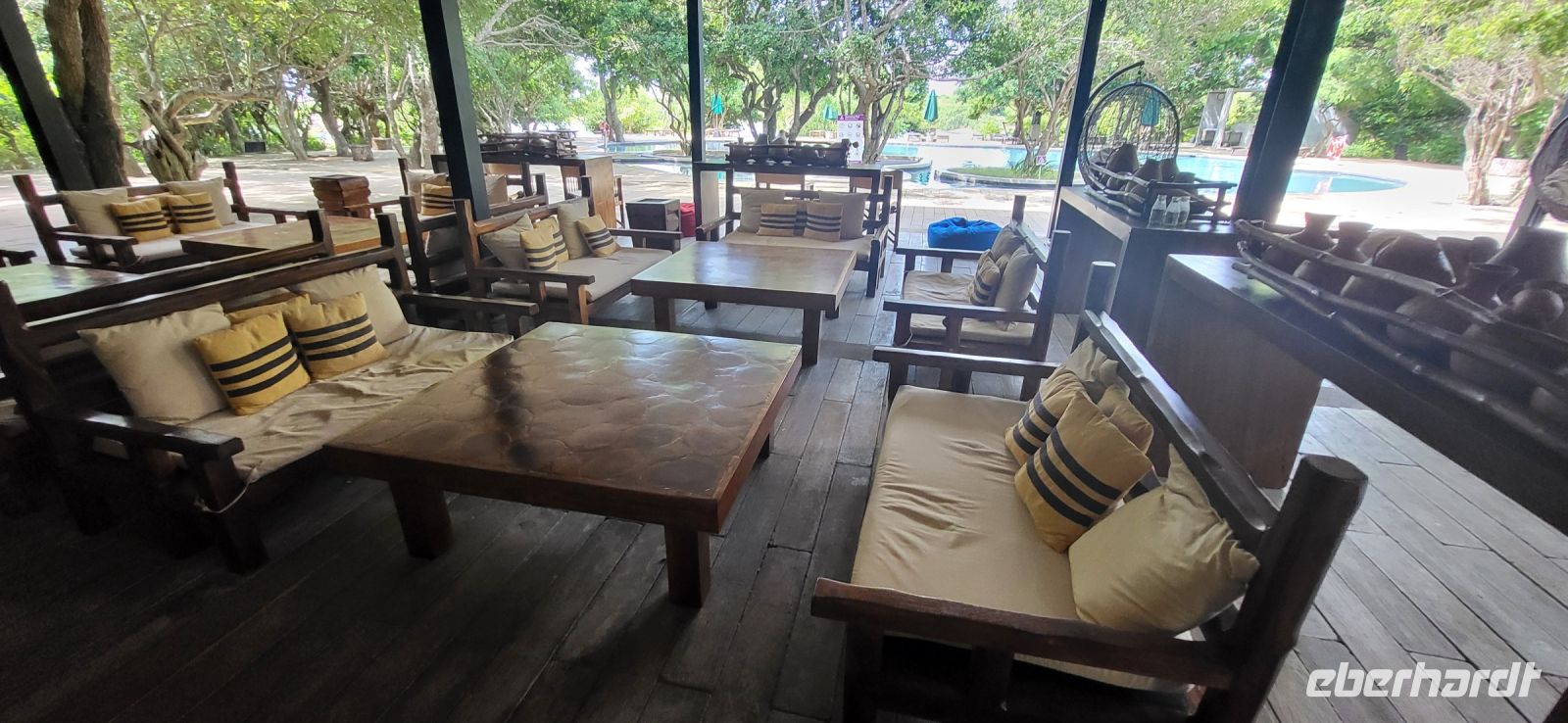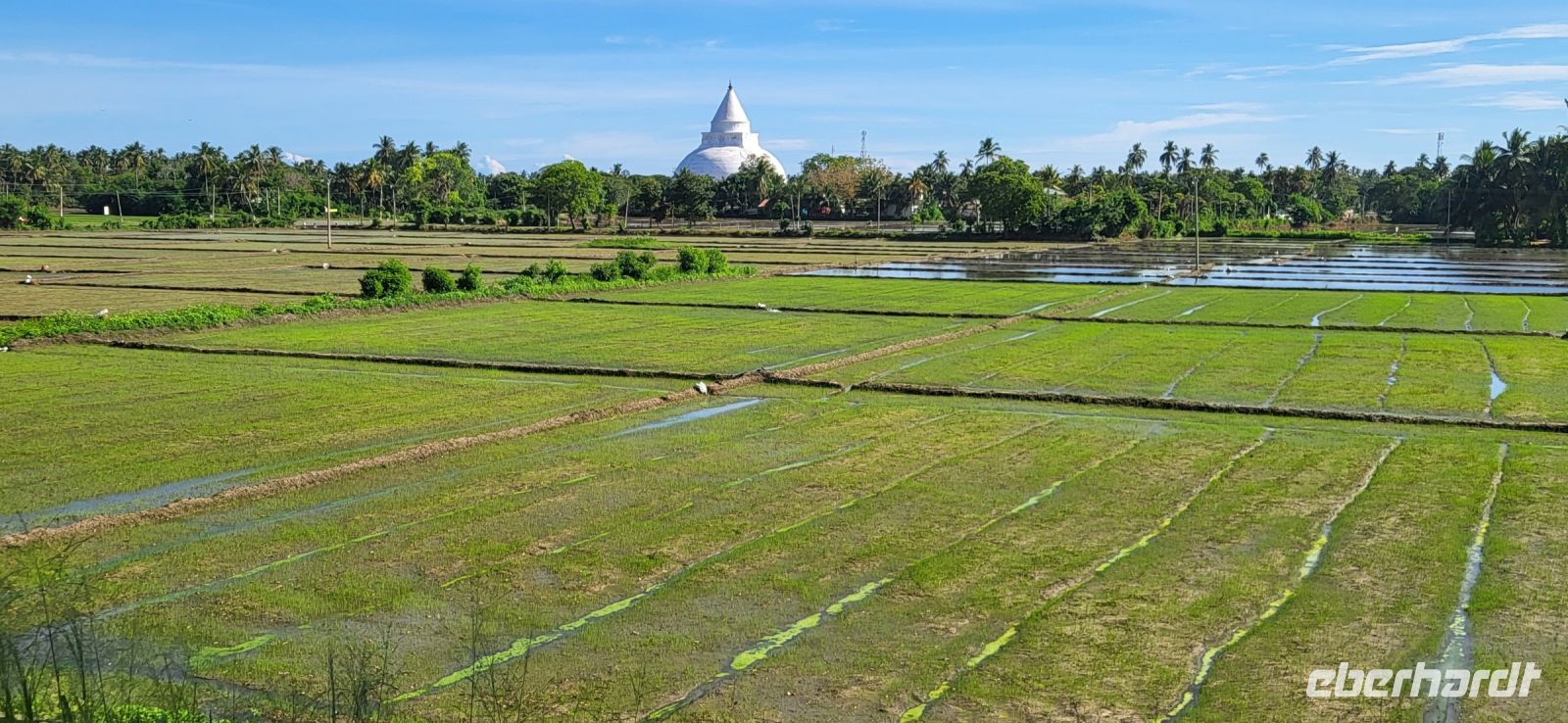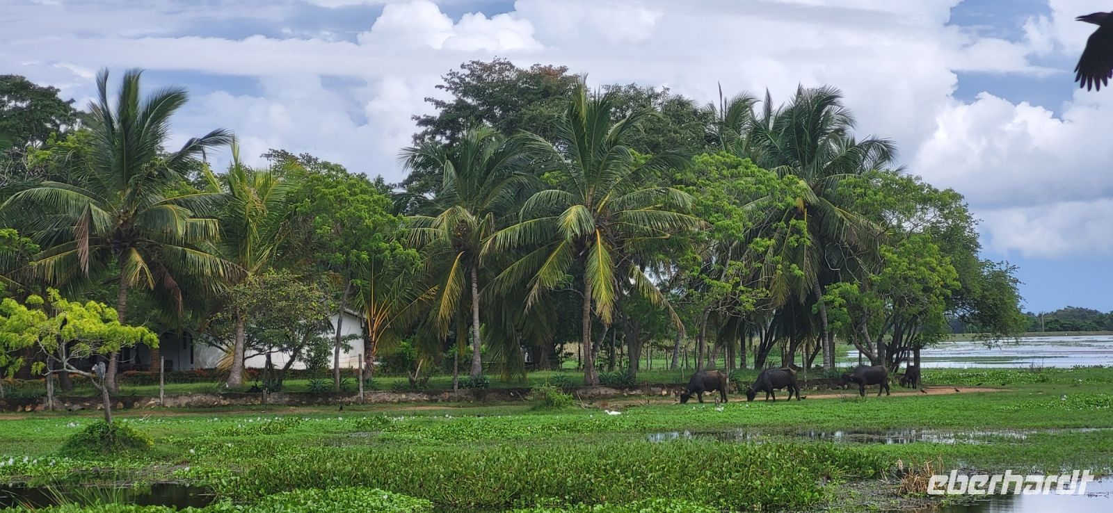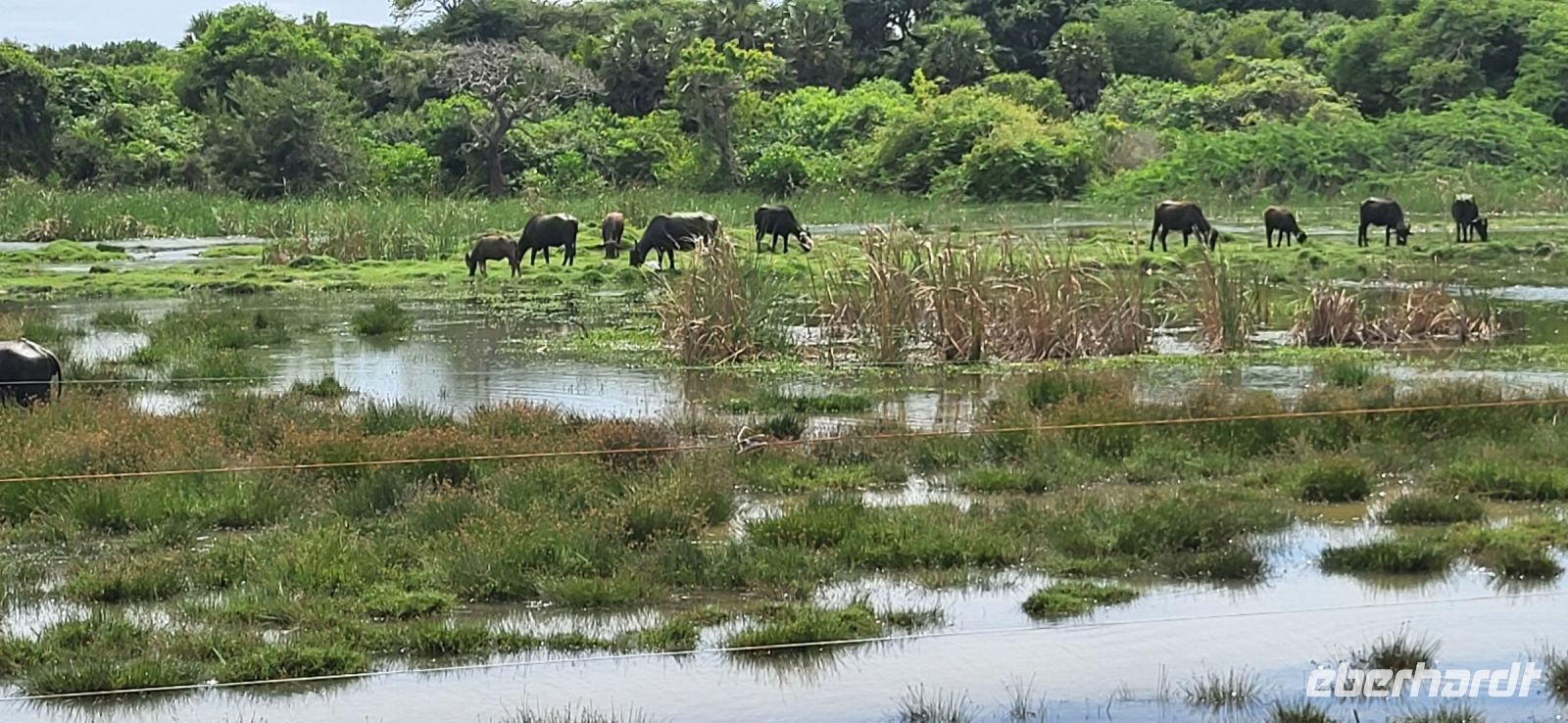 Heute haben wir die Qual der Wahl. Bedingt dadurch, dass wir unsere Programmpunkte vor Ort etwas anders gelegt haben, haben wir heute einen freien Tag. Diesen können wir gemütlich in der Lodge und somit am Pool verbringen oder begeben uns mit Bonny zu einer Fahrt ins Blaue. Natürlich zieht es die meisten von uns wieder nach draußen. Unser erstes Ziel ist Kirinda mit dem Vihara Maha Devi Tempel. Dieser ist direkt am Indischen Ozean gelegen und für uns alle ein absolut magischer Ort. Der Tempel liegt auf einer Anhöhe mit atemberaubender Kulisse und zieht uns förmlich in seinen Bann. Hier könnten wir noch viel länger bleiben. Unsere Weiterfahrt führt uns durch Dörfer entlang der Hauptstraße, mit vielen interessanten Dingen links und rechts. Viele Reisfelder prägen die Landschaft, Wasserbüffel liegen genüsslich im kühlen Nass. Bäume voller Flughunde, die statt schlafen, lieber unruhig lärmen. Im Rain Tree Hotel in Tissamaharamaya halten wir, um einen Mittagssnack zu ordern, lassen die Küche in Ruhe vorbereiten und fahren nochmals weiter, um einen schönen Spaziergang entlang eines Stausees zu unternehmen. Hier sehen wir ebenfalls wieder imposante Vögel, Warane, Reisbauern in der Vorbereitung. Dies ist auch die Gegend, wo Bonny aufgewachsen ist und so statten wir seiner Familie einen Besuch ab. Wir lernen seinen Bruder und seine 92-jährige Mutter kennen. Herzlich erfolgt die Begrüßung mit einer frischen Kokosnuss aus dem eigenen Garten, deren Wasser wir genüsslich trinken. Einfach köstlich. Bonnys Bruder hat vor Jahrzehnten Deutsch im Goethe-Institut gelernt und spricht dieses noch erstaunlich gut. Einfach eine nette und für uns sicherlich unvergessliche Begegnung! Wir spazieren weiter und enden an unserem Restaurant, welches bereits das Mittagessen fertig hat. Da alle anderen Gäste auf Ausflügen sind, sind wir hier exklusiv zu Gast und werden köstlich umsorgt. Anschließend geht es zurück zum Cinnamon Wild Yala Hotel, wo wir schon von unseren Mitreisenden erwartet werden. Ein toller und spontaner Ausflugstag geht zu Ende, den wir alle sicherlich nicht missen wollen. Es erfolgt ein letztes Abendessen mit unglaublicher Auswahl und erneut stehen wir ratlos am Buffet, denn wir haben mehr als die Qual der Wahl.