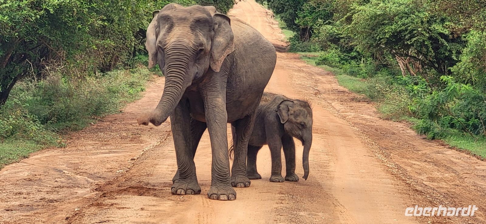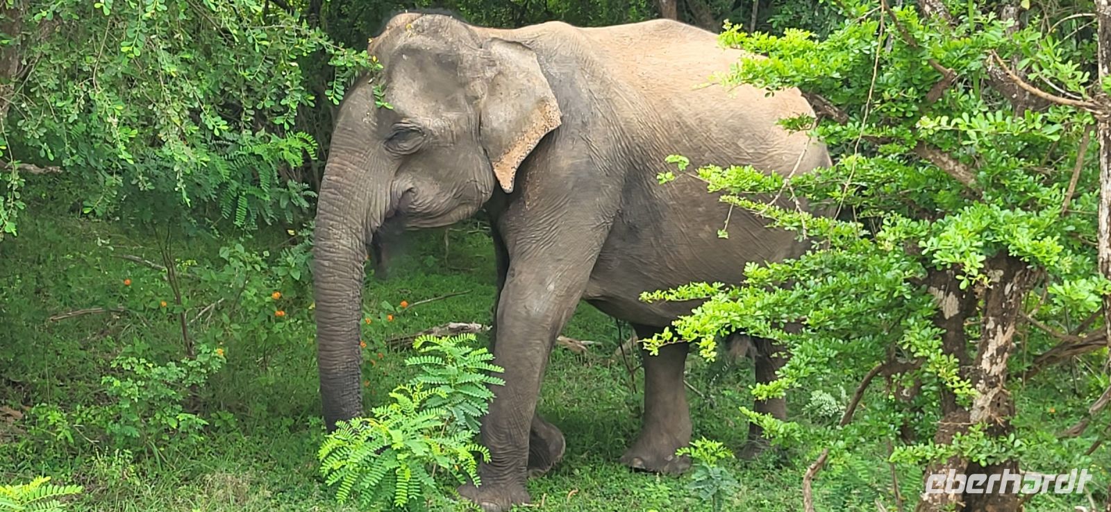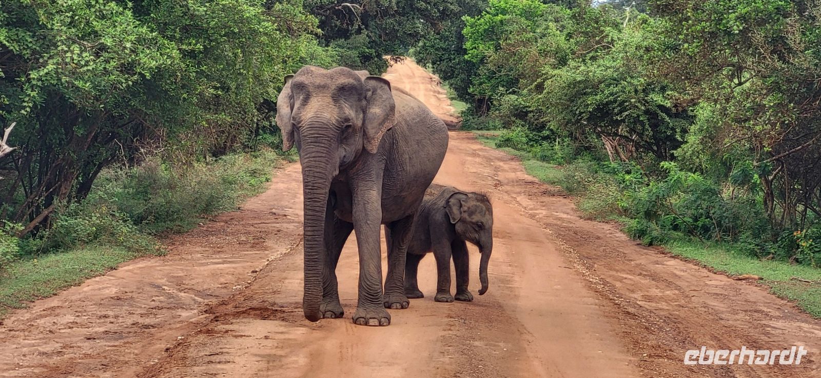 Um eben genau dieses Mal nicht vor den Hühnern aufzustehen, entscheiden wir uns für einen freien Vormittag und eine Nachmittagssafari im Yala Nationalpark. Dieser 1500 km² und älteste Nationalpark des Landes wurde 1937 gegründet. Der Yala Park ist sehr weitläufig, misst 98.000 Hektar und ist in fünf Abschnitte eingeteilt. Von diesen sind nur Abschnitt eins und zwei für Safaris freigegeben, der Rest ist Naturschutzgebiet für die Tiere und den Forschern vorbehalten. Dank Bonnys guter Planung sind wir die ersten Jeeps am Eingang und warten geduldig, bis dieser um 14.00 Uhr seine Pforten öffnet. Anders als anderswo auf der Welt gibt es hier eine Mittagspause von 12 bis 14 Uhr, in der keine Fahrzeuge im Park unterwegs sein dürfen. Am Nachmittag bekommen wir einige Tiere zu sehen, zu denen Buntstörche, Ibisse, Büffel, Bienenfresser, Pelikane, Warane, Tukane, Kampfadler, Mungos, Krokodile und Wildschweine zählen. Heute sehen wir ebenso etliche Elefanten, darunter Mütter mit Jungtieren und kleinere Herden. Wir genießen die herrliche Natur, Farben und Eindrücke und lassen diese auf uns wirken. Nach einer sehr erfolgreichen Safari kehren wir in unsere schöne Unterkunft zurück. Abends erfolgt neben einem kräftigen Gewitter ein weiteres Abendessen und wir sind immer wieder aufs Neue erstaunt, wie vielfältig die Küche Sri Lankas ist.