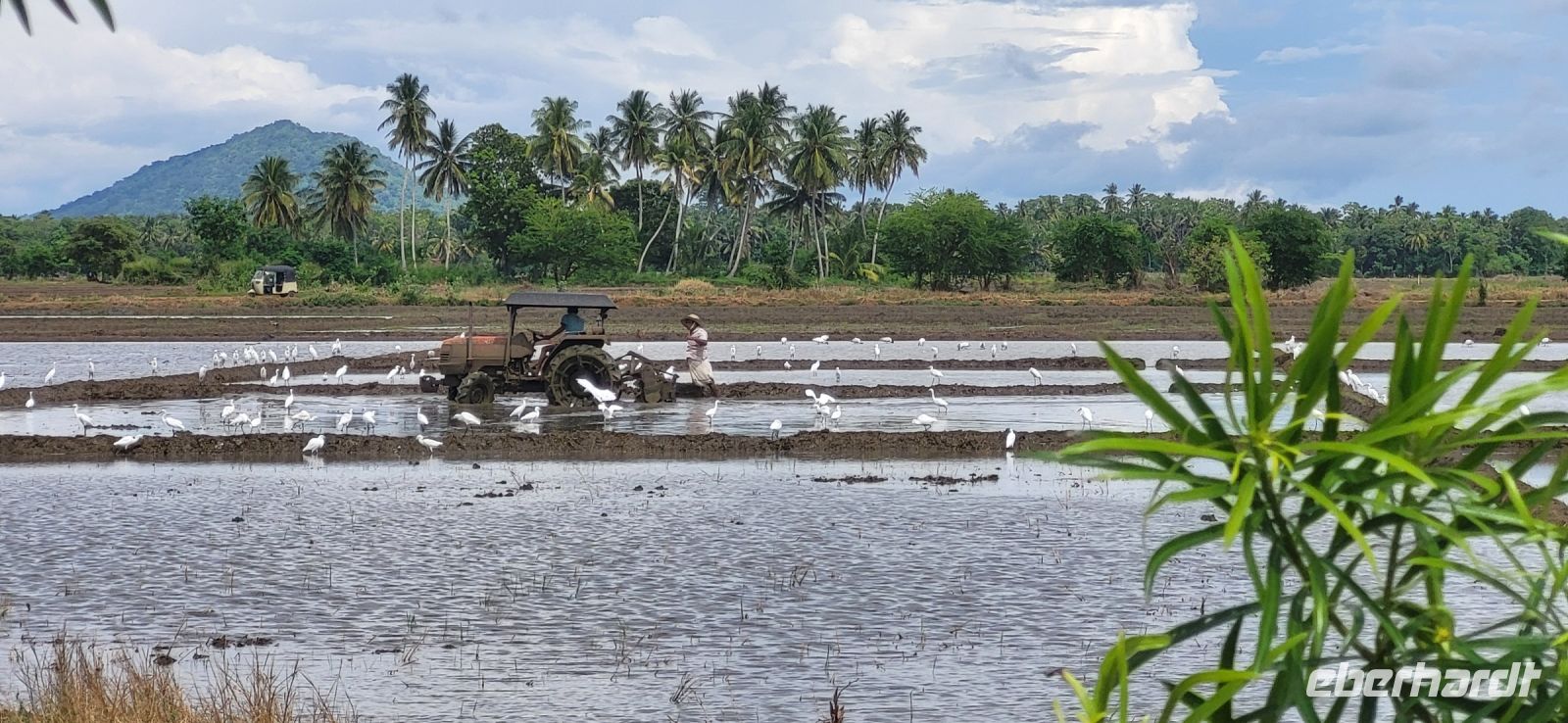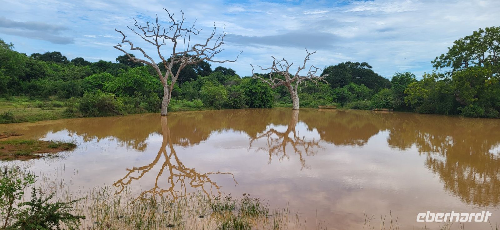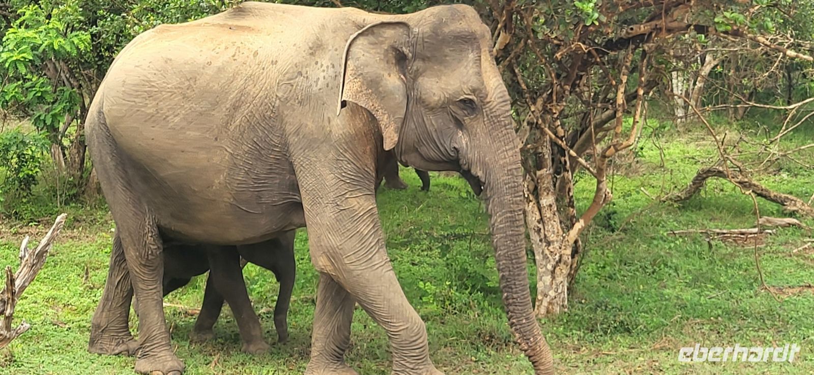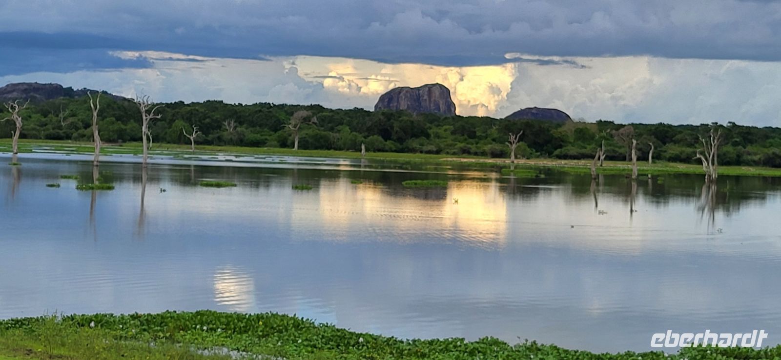 Um eben genau dieses Mal nicht vor den Hühnern aufzustehen, entscheiden wir uns für einen freien Vormittag und eine Nachmittagssafari im Yala Nationalpark. Dieser 1500 km² und älteste Nationalpark des Landes wurde 1937 gegründet. Der Yala Park ist sehr weitläufig, misst 98.000 Hektar und ist in fünf Abschnitte eingeteilt. Von diesen sind nur Abschnitt eins und zwei für Safaris freigegeben, der Rest ist Naturschutzgebiet für die Tiere und den Forschern vorbehalten. Dank Bonnys guter Planung sind wir die ersten Jeeps am Eingang und warten geduldig, bis dieser um 14.00 Uhr seine Pforten öffnet. Anders als anderswo auf der Welt gibt es hier eine Mittagspause von 12 bis 14 Uhr, in der keine Fahrzeuge im Park unterwegs sein dürfen. Am Nachmittag bekommen wir einige Tiere zu sehen, zu denen Buntstörche, Ibisse, Büffel, Bienenfresser, Pelikane, Warane, Tukane, Kampfadler, Mungos, Krokodile und Wildschweine zählen. Heute sehen wir ebenso etliche Elefanten, darunter Mütter mit Jungtieren und kleinere Herden. Wir genießen die herrliche Natur, Farben und Eindrücke und lassen diese auf uns wirken. Nach einer sehr erfolgreichen Safari kehren wir in unsere schöne Unterkunft zurück. Abends erfolgt neben einem kräftigen Gewitter ein weiteres Abendessen und wir sind immer wieder aufs Neue erstaunt, wie vielfältig die Küche Sri Lankas ist.