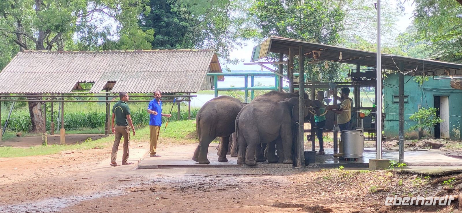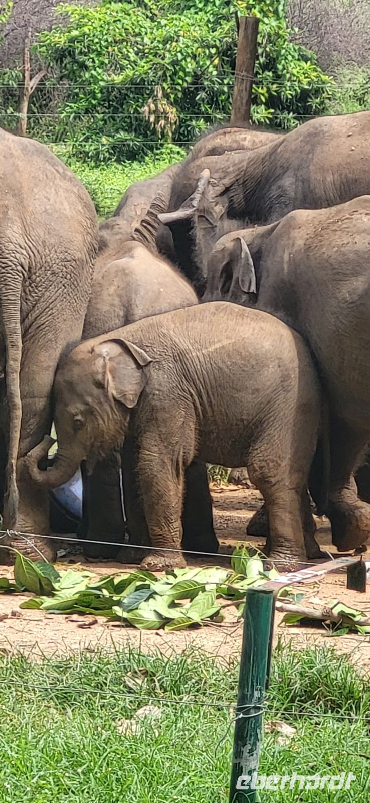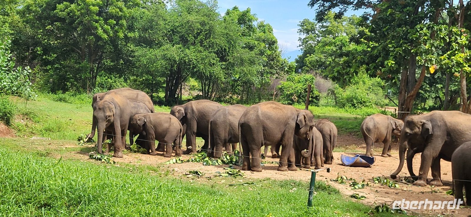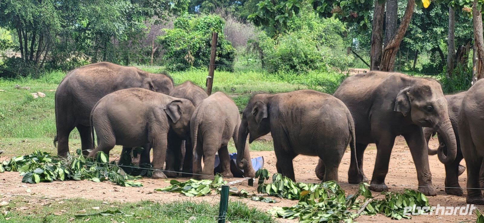 Am frühen Morgen, mit einem letzten Frühstück und einer schönen Geburtstagsüberraschung, verlassen wir die Yala Region. Unser Vormittagsziel ist das bekannte Udawalawa Elephant Transit Home, in dem über 50 junge Elefanten groß gezogen und versorgt werden. Diese Jungtiere sind in erster Linie Waisen, deren Mütter durch verschiedene Umstände ums Leben kamen. Ziel ist es, diese in einem gewissen Alter wieder auszuwildern, dazu ist man bemüht, den Kontakt zu Menschen so gering wie möglich zu halten. Ein tolles Erlebnis zu sehen, wie diese in kleinen Gruppen, zur Fütterung per Milchschlauch und fester Nahrung hereingelassen werden. Interessant auch, wie ganz klein und schon etwas größer miteinander harmonieren. Nachdem wir das Ereignis 30 Minuten verfolgt haben, ziehen wir weiter Richtung Küste und halten spontan im Craft Tunnel Pottery. Hier treffen wir auf den Künstler selbst, der es sich zum Projekt gemacht hat, den Frauen in der Umgebung zu einem Einkommen zu verhelfen, indem dieses das Töpferhandwerk erlernen und im Nachgang diese selbst herstellen können. Ein tolles Projekt, welches man einfach unterstützen möchte. Der Künstler ist zeitgleich auch Architekt des tollen Anwesens, in dem wir auch zu Mittag essen. Alles ist sehr geschmackvoll aufeinander abgestimmt und dieses wunderbare Ambiente gefällt uns allen sehr. Nachmittags haben wir unser Ziel erreicht und checken im gigantischen Shangri-La’s Golf & Spa Resort mit unglaublichen 53 Hektar und 300 Zimmern ein. Eine sehr weitläufige Anlage mit drei verschiedenen Pools, dazu viel Natur um uns herum, lässt uns nun den Nachmittag genießen. Erst einmal müssen wir alles kennenlernen und vor allem, uns nicht verlaufen. Abends treffen wir uns zu einem ebenfalls erneut tollen Buffet mit vielen schmackhaften Speisen wieder. Nochmals feiern wir unser Geburtstagskind mit freundlicher Unterstützung des Küchenpersonals, welches eine kleine Torte gefertigt hat und mit versammelter Mannschaft ein schönes Lied anstimmt.