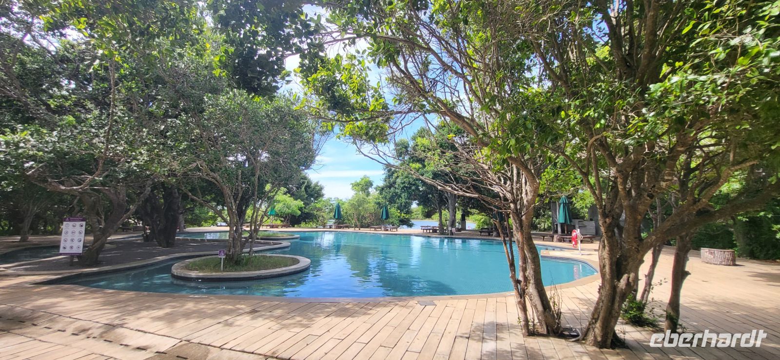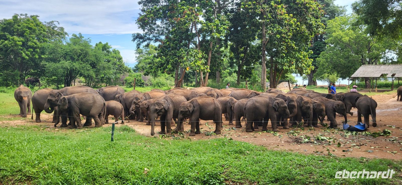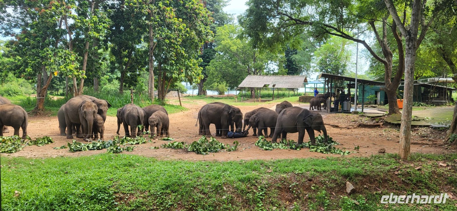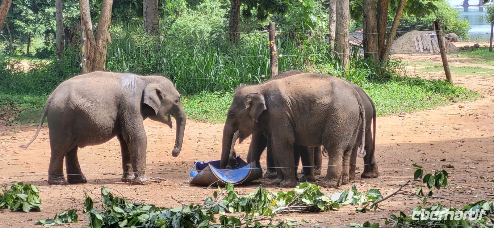 Am frühen Morgen, mit einem letzten Frühstück und einer schönen Geburtstagsüberraschung, verlassen wir die Yala Region. Unser Vormittagsziel ist das bekannte Udawalawa Elephant Transit Home, in dem über 50 junge Elefanten groß gezogen und versorgt werden. Diese Jungtiere sind in erster Linie Waisen, deren Mütter durch verschiedene Umstände ums Leben kamen. Ziel ist es, diese in einem gewissen Alter wieder auszuwildern, dazu ist man bemüht, den Kontakt zu Menschen so gering wie möglich zu halten. Ein tolles Erlebnis zu sehen, wie diese in kleinen Gruppen, zur Fütterung per Milchschlauch und fester Nahrung hereingelassen werden. Interessant auch, wie ganz klein und schon etwas größer miteinander harmonieren. Nachdem wir das Ereignis 30 Minuten verfolgt haben, ziehen wir weiter Richtung Küste und halten spontan im Craft Tunnel Pottery. Hier treffen wir auf den Künstler selbst, der es sich zum Projekt gemacht hat, den Frauen in der Umgebung zu einem Einkommen zu verhelfen, indem dieses das Töpferhandwerk erlernen und im Nachgang diese selbst herstellen können. Ein tolles Projekt, welches man einfach unterstützen möchte. Der Künstler ist zeitgleich auch Architekt des tollen Anwesens, in dem wir auch zu Mittag essen. Alles ist sehr geschmackvoll aufeinander abgestimmt und dieses wunderbare Ambiente gefällt uns allen sehr. Nachmittags haben wir unser Ziel erreicht und checken im gigantischen Shangri-La’s Golf & Spa Resort mit unglaublichen 53 Hektar und 300 Zimmern ein. Eine sehr weitläufige Anlage mit drei verschiedenen Pools, dazu viel Natur um uns herum, lässt uns nun den Nachmittag genießen. Erst einmal müssen wir alles kennenlernen und vor allem, uns nicht verlaufen. Abends treffen wir uns zu einem ebenfalls erneut tollen Buffet mit vielen schmackhaften Speisen wieder. Nochmals feiern wir unser Geburtstagskind mit freundlicher Unterstützung des Küchenpersonals, welches eine kleine Torte gefertigt hat und mit versammelter Mannschaft ein schönes Lied anstimmt.