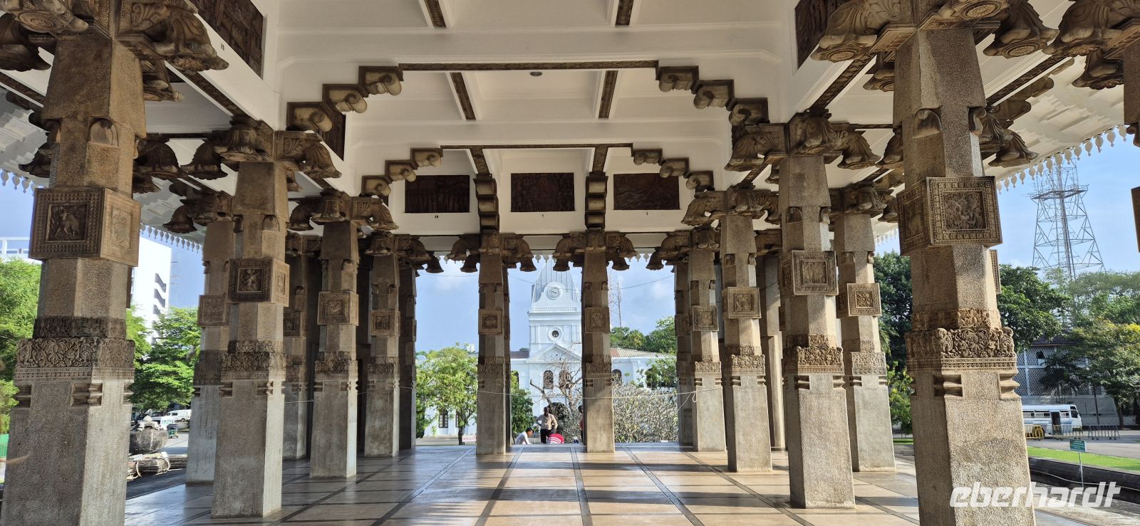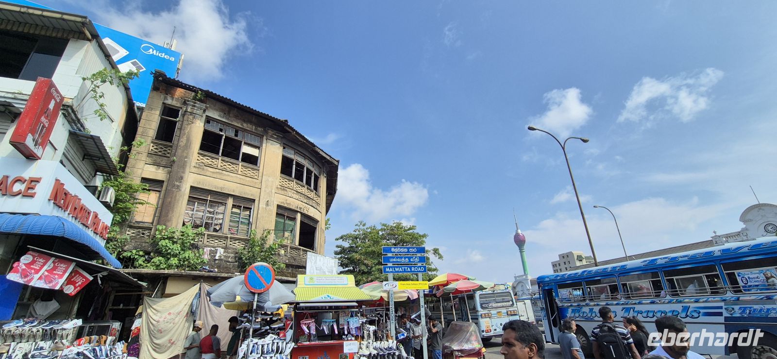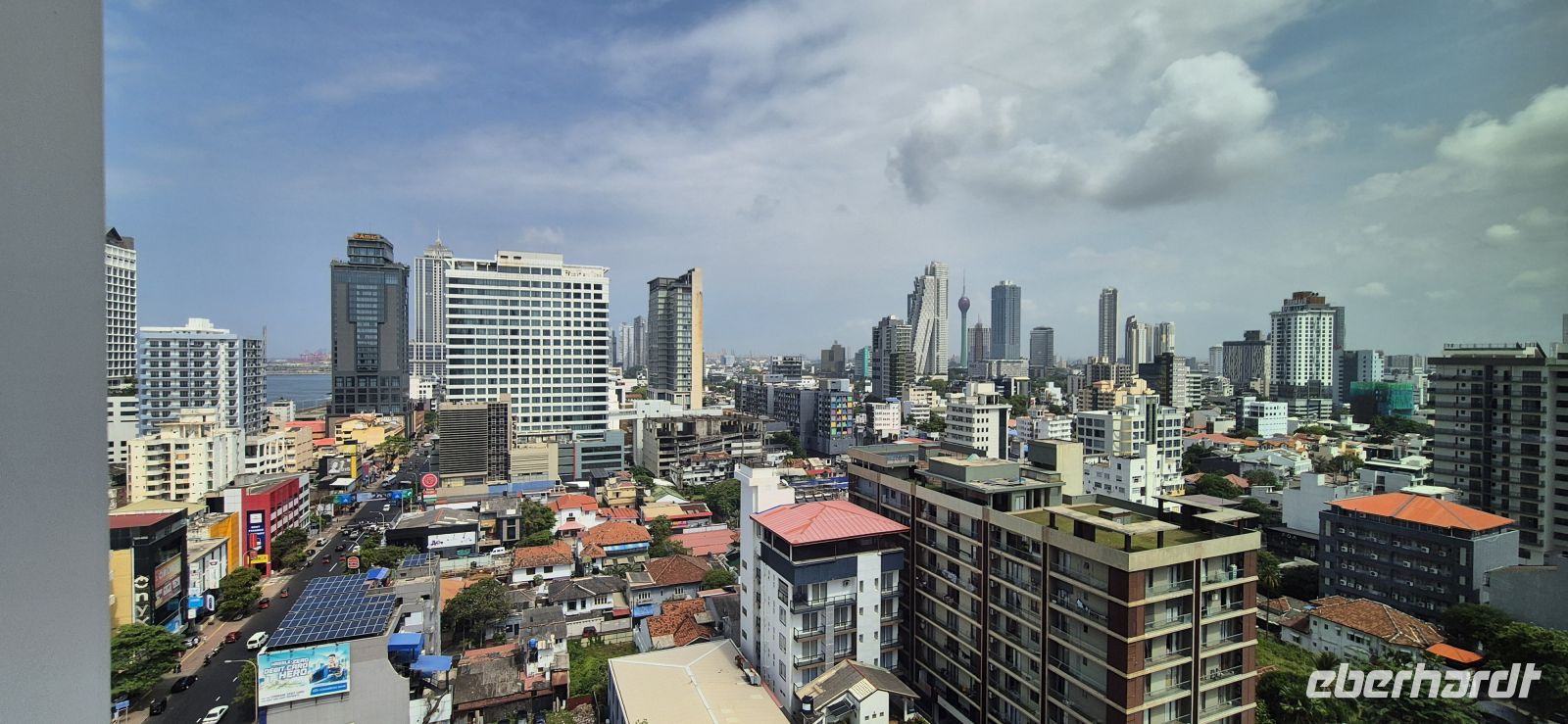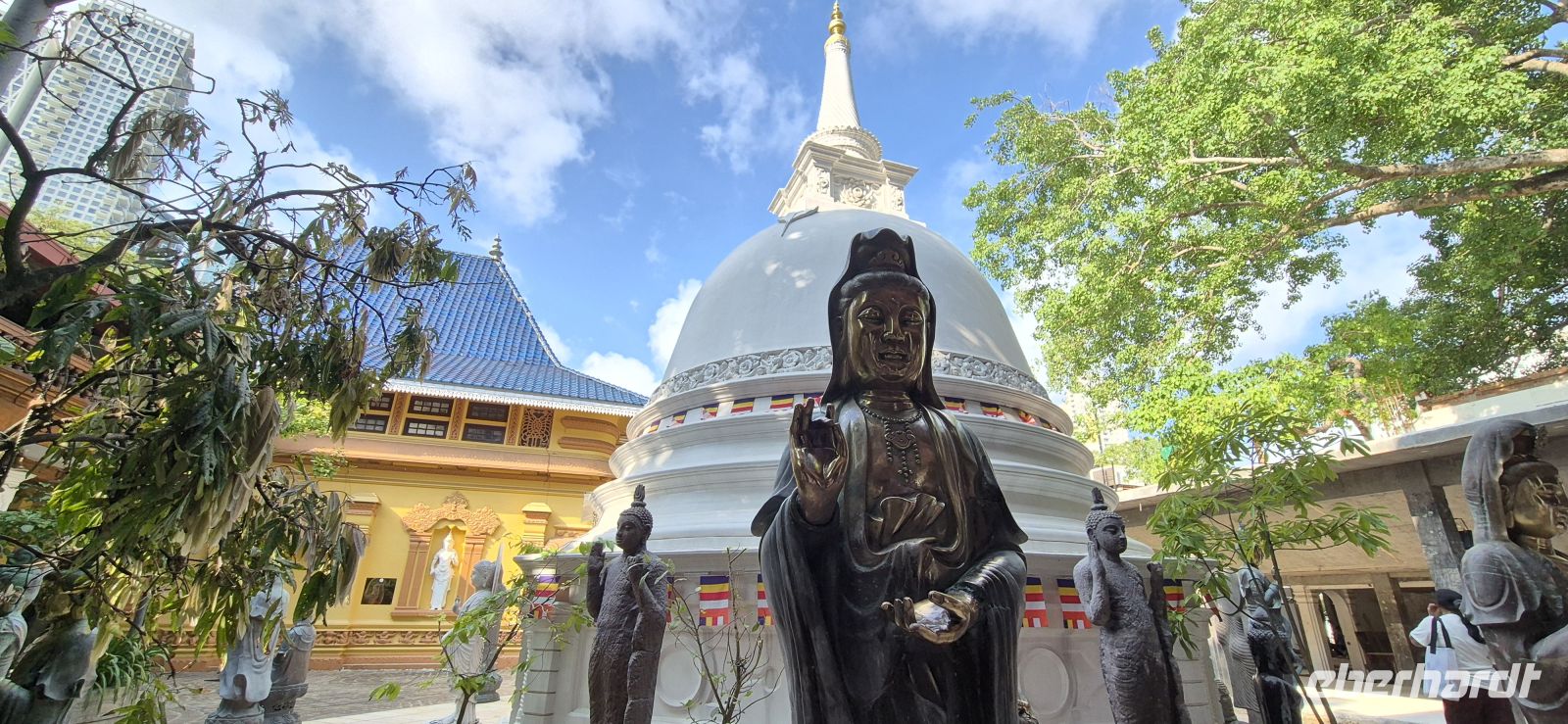 Der erste Morgen in Sri Lanka beginnt nach ein paar Stunden Schlaf auf der obersten Etage unseres Hotels – mit einem Frühstück, das keine Wünsche offenlässt. Vor uns breitet sich Colombo aus: Palmen, Dächer, das Meer direkt gegenüber und dazwischen das geschäftige Treiben einer tropischen Metropole. Bei frischen Früchten, Curryduft genießen wir den Blick und das herrliche Frühstücksbuffet. Der Vormittag steht uns zur freien Verfügung – Zeit, um anzukommen, noch ein bisschen auszuruhen oder einfach die Aussicht zu genießen. Einige erkunden schon die nähere Umgebung, andere lassen sich am Pool nieder. Bevor es am Nachmittag auf Stadterkundung geht, treffen wir uns zu einem kleinen Umtrunk mit Aussicht – ein Saft aus frischen Früchten produziert in der Hand, nutzen wir die Gelegenheit, um uns besser kennenzulernen, zu plaudern und zu erfahren, woher unsere Mitreisenden kommen und was sie nach Sri Lanka führt. Im Anschluss starten wir dann zu unserer ersten Citytour. Das Wetter zeigt sich von seiner besten Seite: strahlend blauer Himmel, Sonne pur und natürlich tropisch schwül. Wir fahren vorbei an den glänzenden Zwillingstürmen des World Trade Centers, Sinnbild des modernen Colombo. Gleich daneben liegt das historische Dutch Hospital, eines der ältesten Gebäude der Stadt. Wo früher Patienten behandelt wurden, laden heute stilvolle Restaurants und kleine Boutiquen zum Verweilen ein – ein charmantes Beispiel, wie Geschichte und Gegenwart in Colombo harmonisch ineinanderfließen.