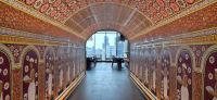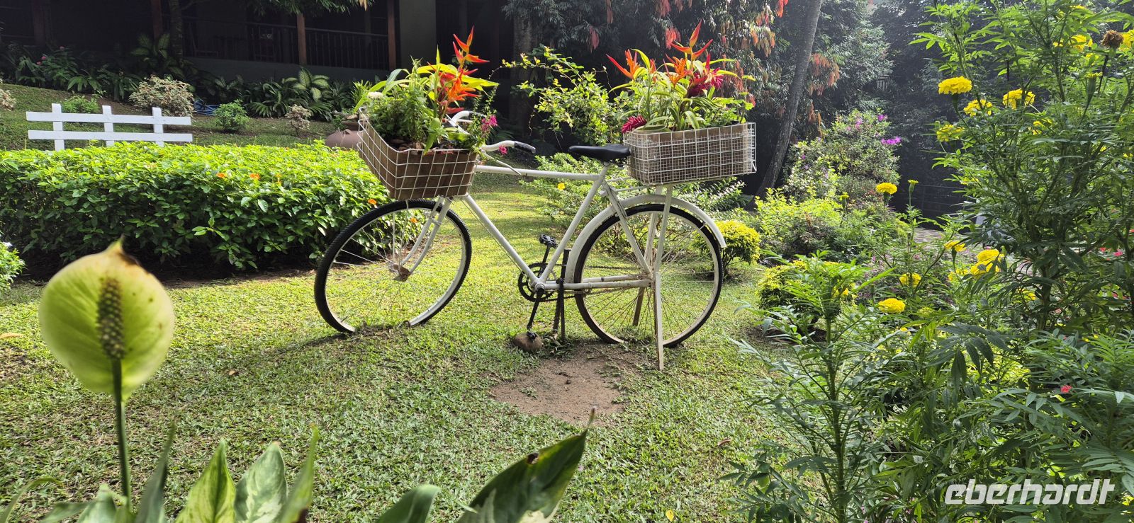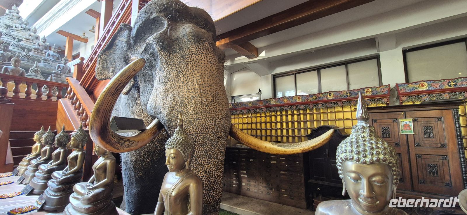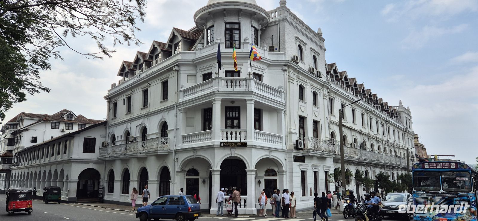 Nach einem erneut fantastischen Frühstück verabschieden wir uns von der Cinnamon Lodge und der traumhaft schönen Anlage, die für zwei Nächte unsere Unterkunft war. Unser erster Stopp entführt uns in die bunte Welt der Seide-in ein Seidengeschäft. Eine einheimische Mitarbeiterin erklärt uns auf Deutsch und mit schriller Stimme, wie aus hauchzarten Fäden prachtvolle Stoffe entstehen – faszinierend, wie viel Handarbeit und Tradition dahintersteckt. Einige von uns schlüpfen gespannt in farbenprächtige Saris. Vor der Sigiriya-Fotowand entstehen fröhliche Erinnerungsbilder, und ein paar neue Mitbringsel wechseln hier den Besitzer. Unsere Fahrt Richtung Kandy geht weiter, als wir plötzlich einen wilden Elefanten am Straßenrand spazierend vorfinden. Was für ein Spektakel und wir sind nicht nur sehr überrascht, sondern auch total happy, den ersten Elefanten in freier Umgebung angetroffen zu haben. Dann erwartet uns das nächste Highlight: die Ananda-Kokosfarm. Hier erleben wir, warum die Kokosnuss auf Sri Lanka nicht nur ein Lebensmittel, sondern auf vielfältige Weise zum Leben gehört. Wir sehen, wie die grüne Nuss fachkundig geöffnet, dann aufgeschlagen, ausgekratzt und zu frischen Kokosflocken und dann zu Kokosmilch verarbeitet wird. Aus den Fasern, die keinesfalls Abfall sind, entstehen Besen, Körbe und sogar Seile, die vor unseren Augen gedreht werden – ein wunderbarer Einblick in traditionelles Handwerk. Der Besuch begeistert alle, und schnell wird klar: Diesen Programmpunkt möchten wir unbedingt beibehalten! Dann geht es weiter in die letzte Königstadt Kandy. Umrahmt von einer herrlichen Bergwelt und üppigem Grün, empfängt uns ein angenehmes Klima auf nun 500 m Höhe. In Kandy tauchen wir zu Fuß mitten hinein in das geschäftige Stadtleben. Moderne Einkaufszentren treffen hier auf alte Markthallen, Händler rufen, Gewürze duften, Menschen strömen an uns vorbei – und wir sind einfach mittendrin. Ein kurzer Halt im historischen Queens Hotel bringt uns in koloniale Zeiten zurück, als dann plötzlich starker Regen einsetzt und wir sehr froh sind, nun den berühmten Zahntempel zu besuchen. Hier herrscht eine besondere Stimmung. Gläubige bringen Opfergaben, Trommeln erklingen, und überall duftet es nach Jasmin- und Lotusblüten. Hier wird ein Zahn Buddhas aufbewahrt – eines der wichtigsten Heiligtümer des Landes. Die goldene Kapelle, die kunstvollen Decken und die tiefe Ehrfurcht, die den Raum erfüllt, während wir den Gläubigen beim Beten zuschauen. Nachdem wir uns alles angeschaut haben, wollen wir auch nicht weiter stören und freuen uns nun auf unser neues Hotel für zwei Nächte, von dem wir schon so viel Gutes gehört haben.
