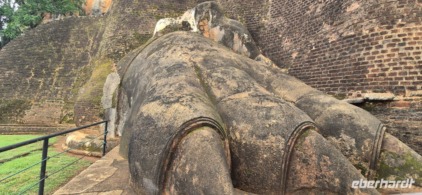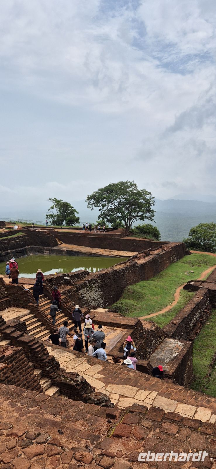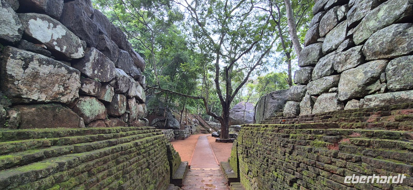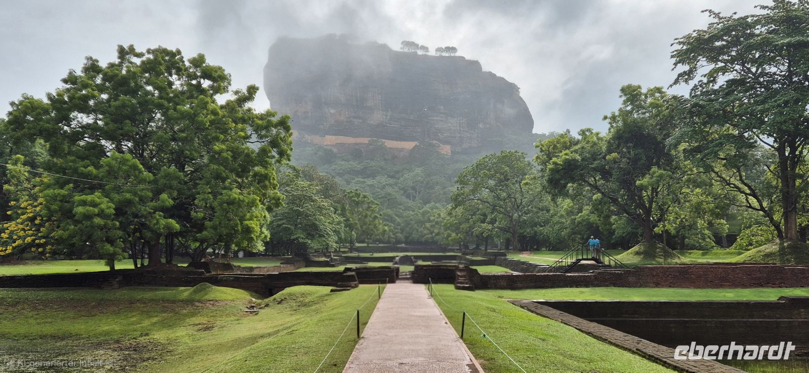 Heute steht eines der absoluten Highlights Sri Lankas auf unserem Programm – der legendäre Sigiriya-Löwenfelsen, auch „Lion Rock“ genannt. Wir starten am frühen Morgen bei bedecktem Himmel und ein bisschen Befeuchtung, was uns mehr als entgegenkommt. So ist es für uns deutlich angenehmer ist, als in der prallen Sonne zu wandern. Schon von weitem ragt der gewaltige Monolith aus dem satten Grün des Dschungels empor. Kein Wunder, dass dieser Ort zum UNESCO-Weltkulturerbe gehört – die Aussicht, die Geschichte und die Magie dieses Platzes sind schlicht überwältigend. Wir starten entlang des königlichen Gartens, der Wasserbecken entlang und schließlich unseren Aufstieg entlang der Löwentatzen über die Stahltreppe – ein bisschen Nervenkitzel ist dabei, aber die Anstrengung lohnt sich! Oben angekommen, breitet sich vor uns ein atemberaubendes Panorama aus: endlose Weite, sattgrüne Palmenhaine und die Überreste der einstigen Felsenfestung. Hier lebte im 5. Jahrhundert König Kassapa, der den Felsen zu seinem Palast machte. Sampa erzählt uns von den kunstvollen Wassergärten, den geheimnisvollen Höhlenmalereien und der einstigen königlichen Pracht – wir versuchen es uns vorzustellen, die richtigen Bilder dazu sollen an späterer Stelle folgen. Auf dem Rückweg geht es an der berühmten Spiegelwand vorbei, deren polierte Oberfläche einst so glänzte, dass der König darin sein Spiegelbild sehen konnte. Dahinter entdecken wir die faszinierenden und geheimnisvollen Wolkenmädchen, jene zarten Fresken, die zu den schönsten Kunstwerken Asiens zählen. Fotografieren ist hier streng verboten – und das ist auch gut so, denn so bleiben die uralten Malereien geschützt.