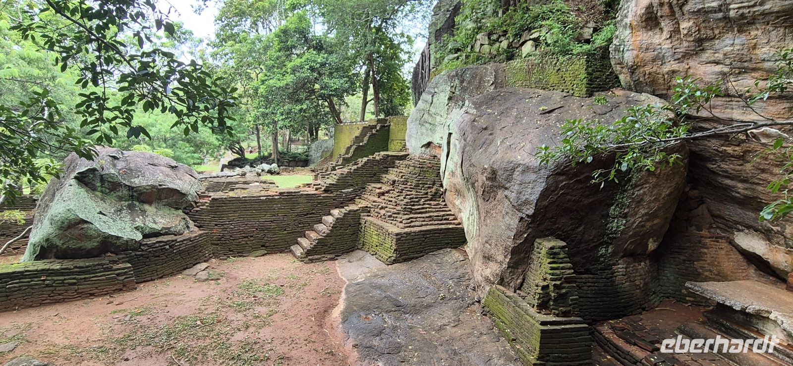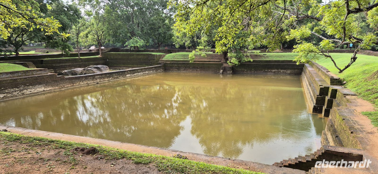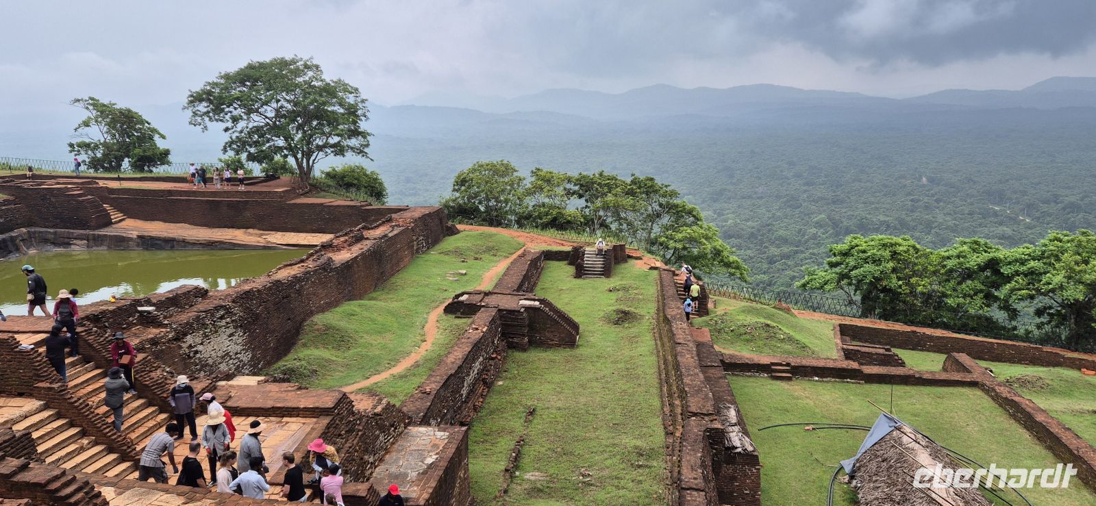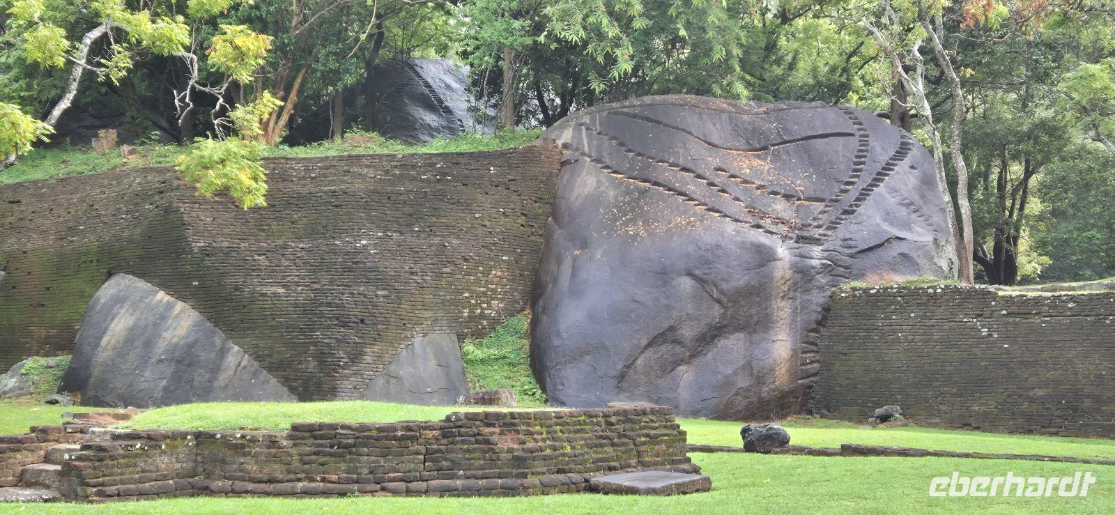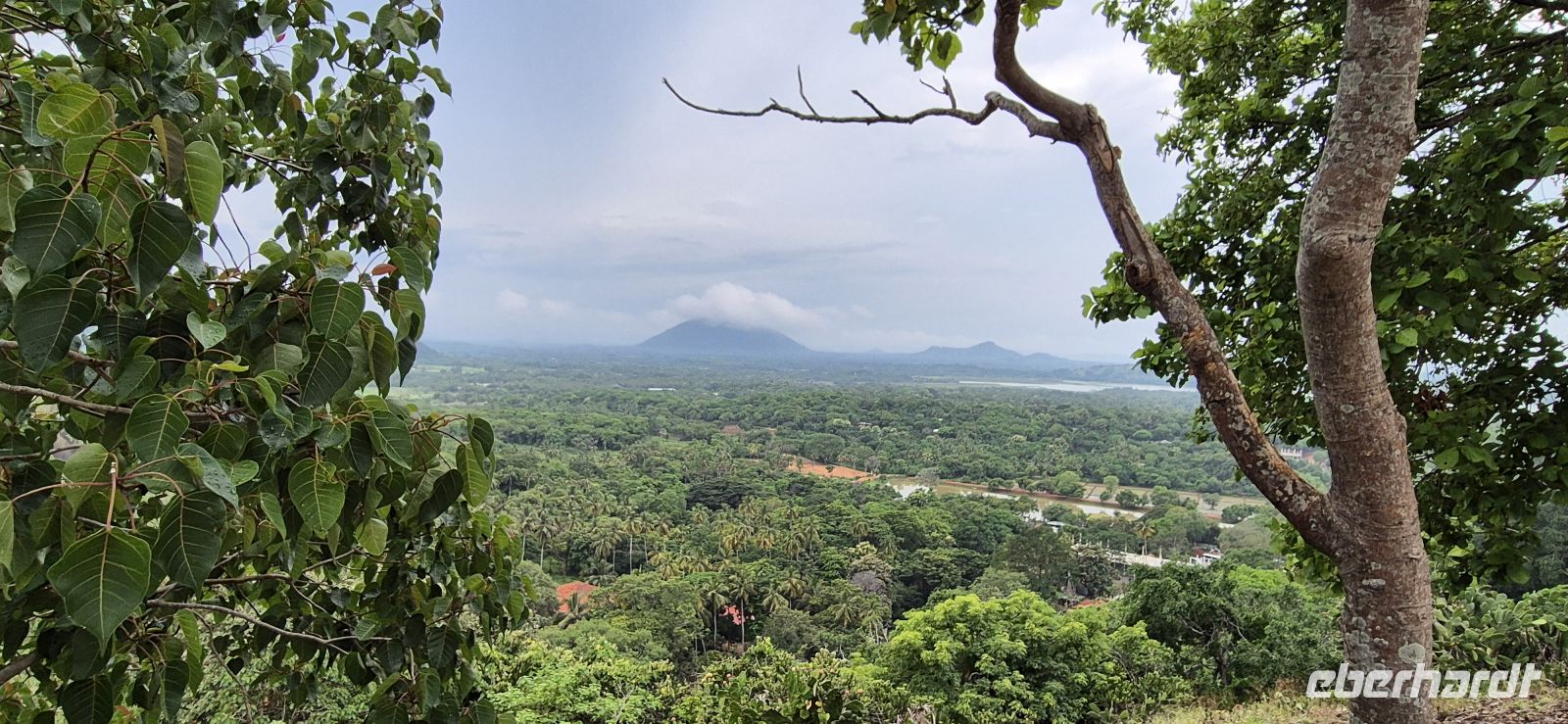 Heute steht eines der absoluten Highlights Sri Lankas auf unserem Programm – der legendäre Sigiriya-Löwenfelsen, auch „Lion Rock“ genannt. Wir starten am frühen Morgen bei bedecktem Himmel und ein bisschen Befeuchtung, was uns mehr als entgegenkommt. So ist es für uns deutlich angenehmer ist, als in der prallen Sonne zu wandern. Schon von weitem ragt der gewaltige Monolith aus dem satten Grün des Dschungels empor. Kein Wunder, dass dieser Ort zum UNESCO-Weltkulturerbe gehört – die Aussicht, die Geschichte und die Magie dieses Platzes sind schlicht überwältigend. Wir starten entlang des königlichen Gartens, der Wasserbecken entlang und schließlich unseren Aufstieg entlang der Löwentatzen über die Stahltreppe – ein bisschen Nervenkitzel ist dabei, aber die Anstrengung lohnt sich! Oben angekommen, breitet sich vor uns ein atemberaubendes Panorama aus: endlose Weite, sattgrüne Palmenhaine und die Überreste der einstigen Felsenfestung. Hier lebte im 5. Jahrhundert König Kassapa, der den Felsen zu seinem Palast machte. Sampa erzählt uns von den kunstvollen Wassergärten, den geheimnisvollen Höhlenmalereien und der einstigen königlichen Pracht – wir versuchen es uns vorzustellen, die richtigen Bilder dazu sollen an späterer Stelle folgen. Auf dem Rückweg geht es an der berühmten Spiegelwand vorbei, deren polierte Oberfläche einst so glänzte, dass der König darin sein Spiegelbild sehen konnte. Dahinter entdecken wir die faszinierenden und geheimnisvollen Wolkenmädchen, jene zarten Fresken, die zu den schönsten Kunstwerken Asiens zählen. Fotografieren ist hier streng verboten – und das ist auch gut so, denn so bleiben die uralten Malereien geschützt.