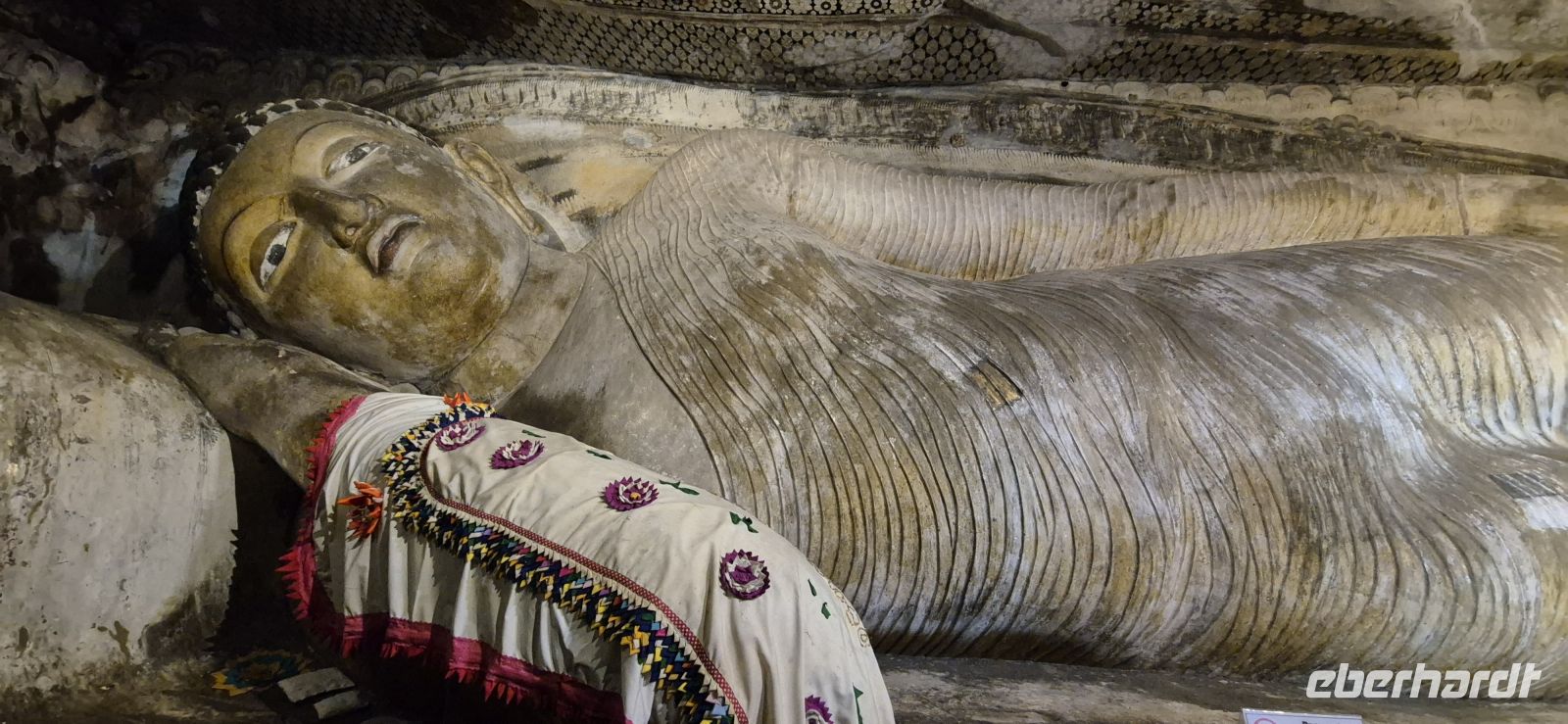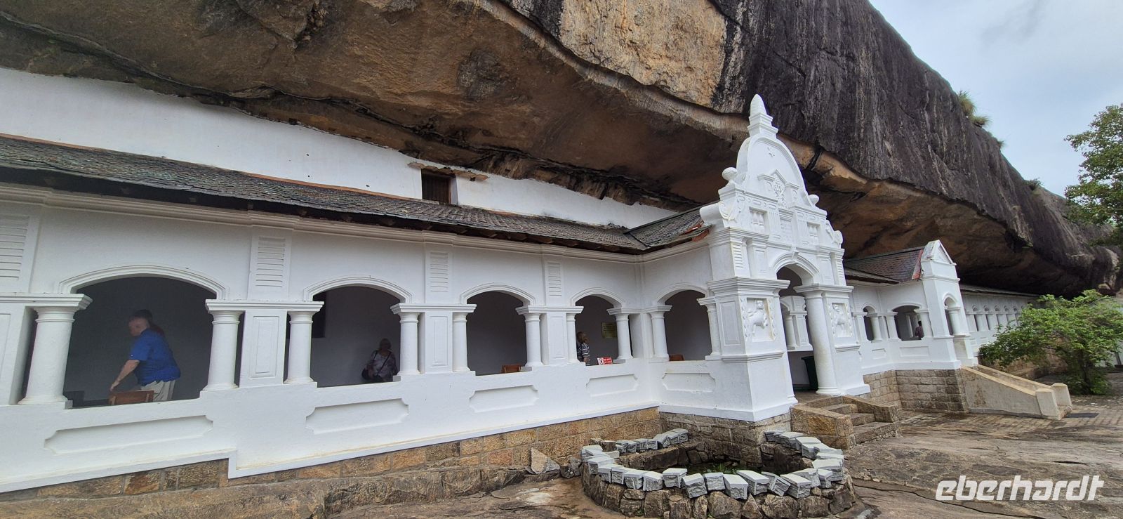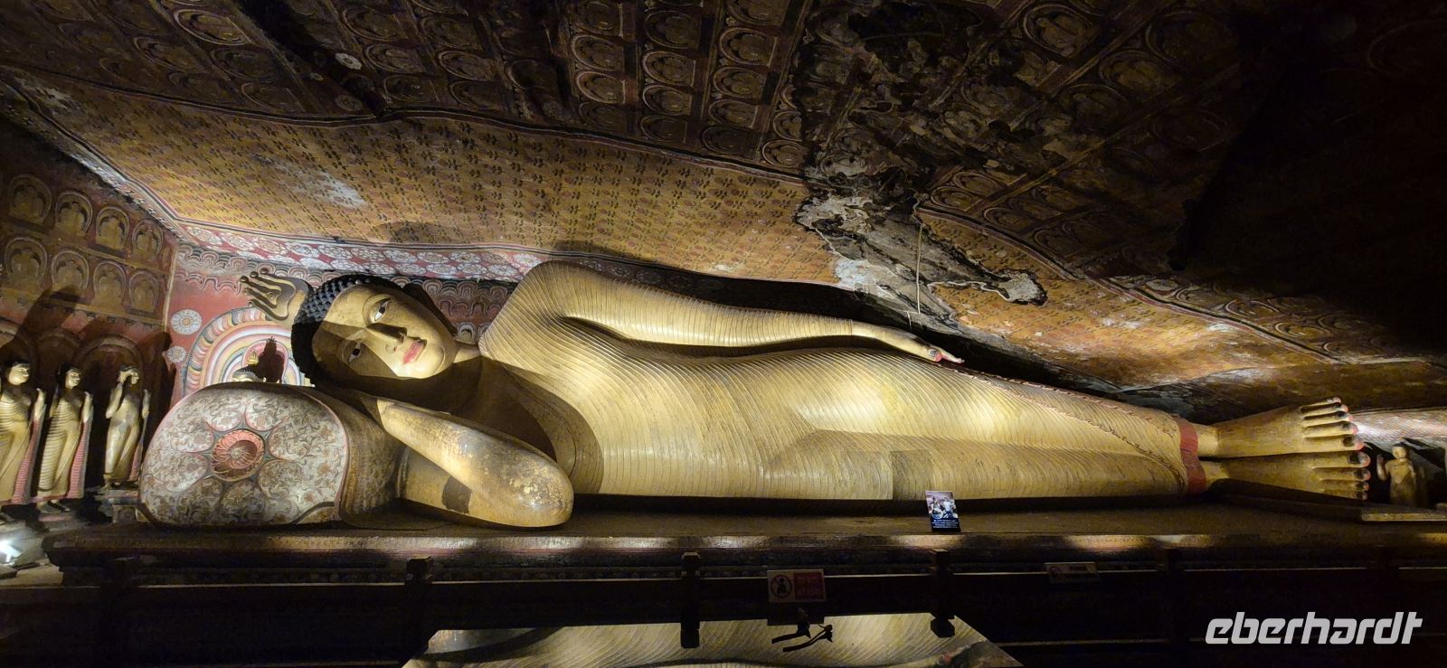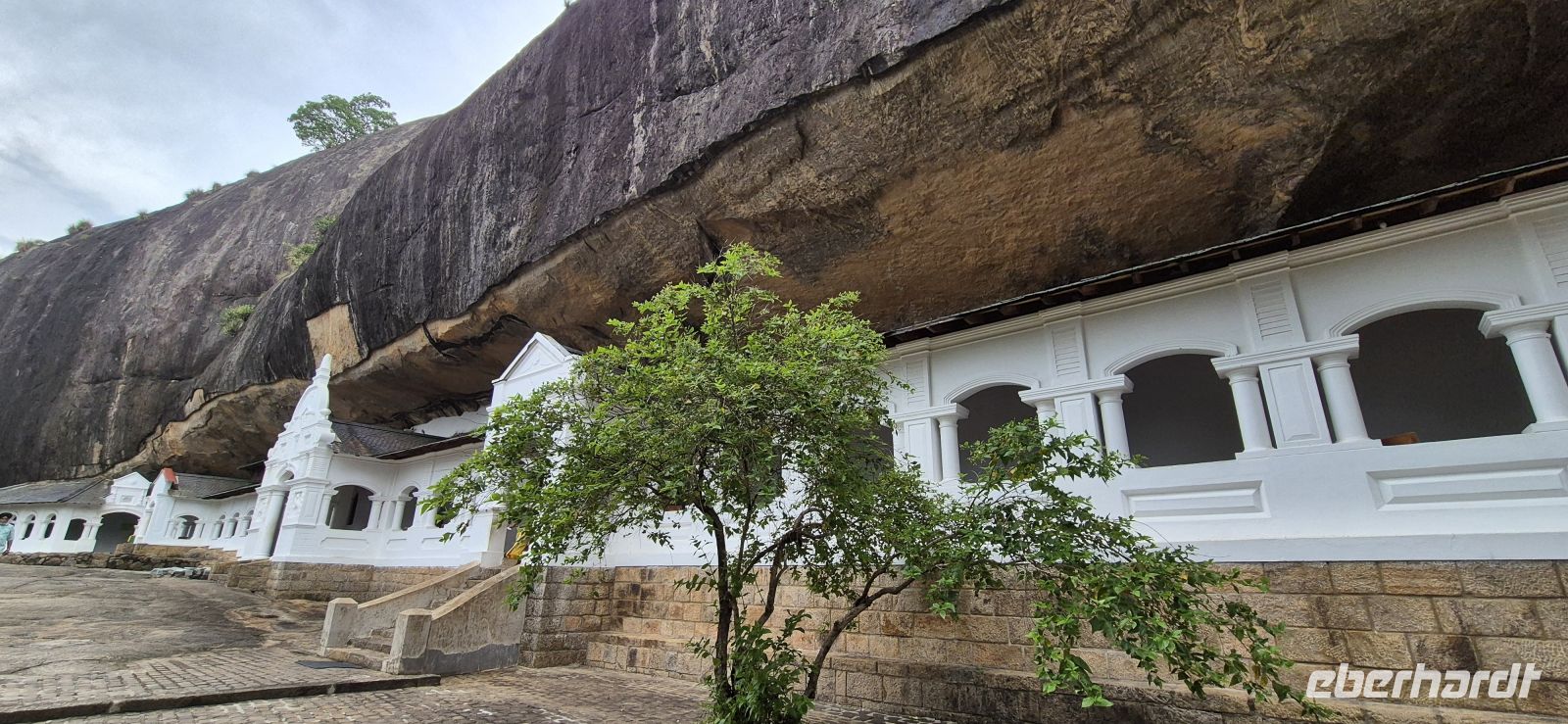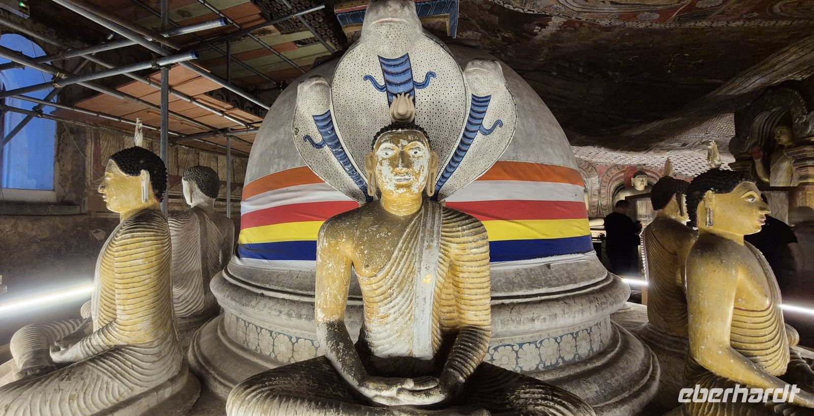 Wir hören, dass Sri Lanka einer der größten Exporteure von Kokosprodukten weltweit ist. Neben Öl, Milch und Mehl werden hier auch Kosmetika und sogar Aktivkohle aus Kokosnussschalen hergestellt. Ein echtes Multitalent der Natur! Sampa, unser Reiseleiter, verspricht uns auf dem Weg nach Kandy noch eine andere Station anzuschauen, wo die Kokosnuss nochmals auf andere Art und Weise verarbeitet wird. Doch zunächst steuern wir ein für Sri Lanka sehr wichtiges kulturelles Highlight an: den berühmten Felsentempel von Dambulla. Dieser thront majestätisch über der Landschaft, und schon von unten wirkt der goldene Buddha wie ein Wächter über das Heiligtum. Der Weg hinauf ist neu gestaltet – sanft ansteigend, angenehm zu gehen und mit Blick auf die grün bewaldeten Hügel ringsum.