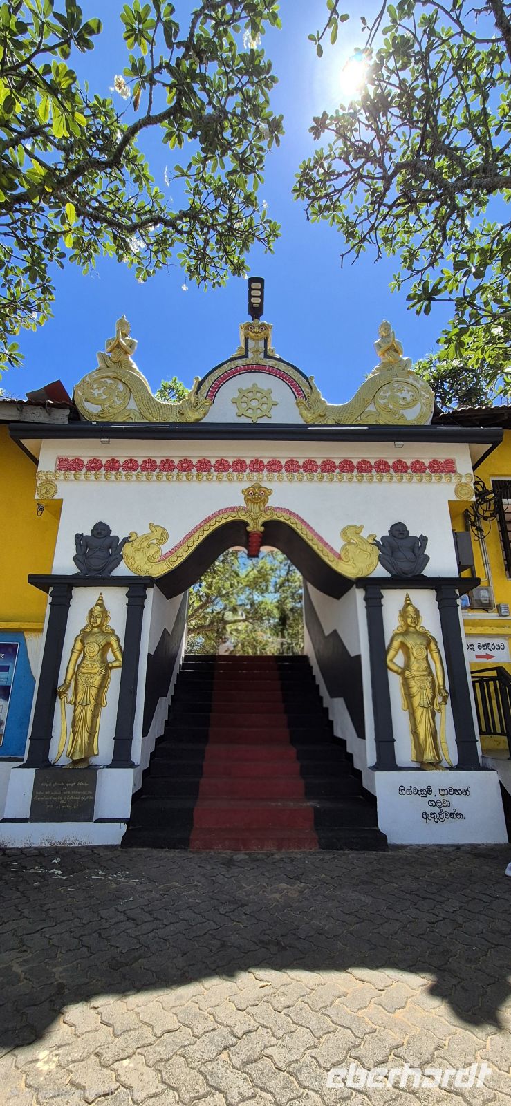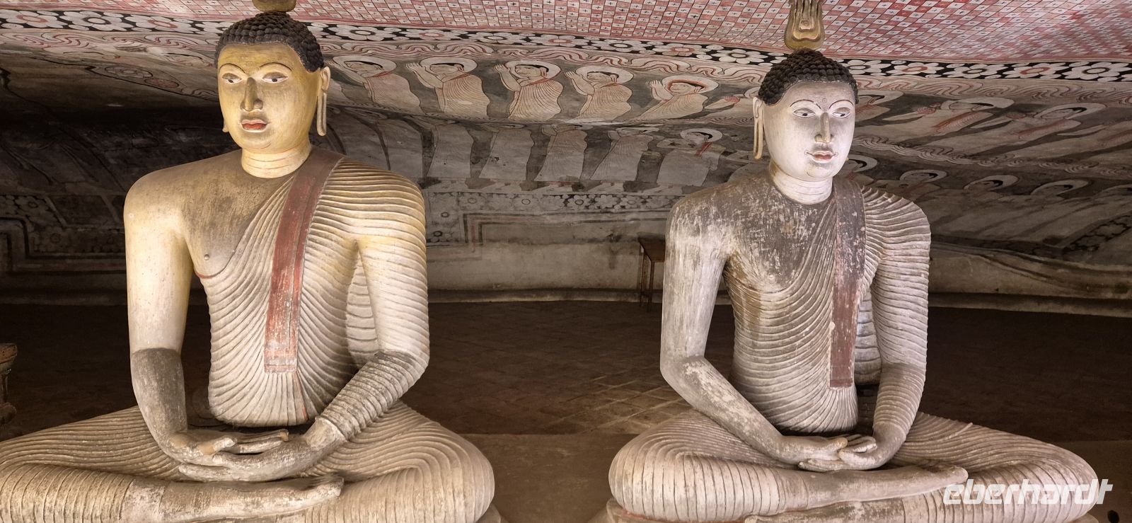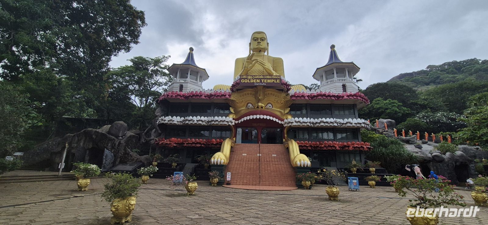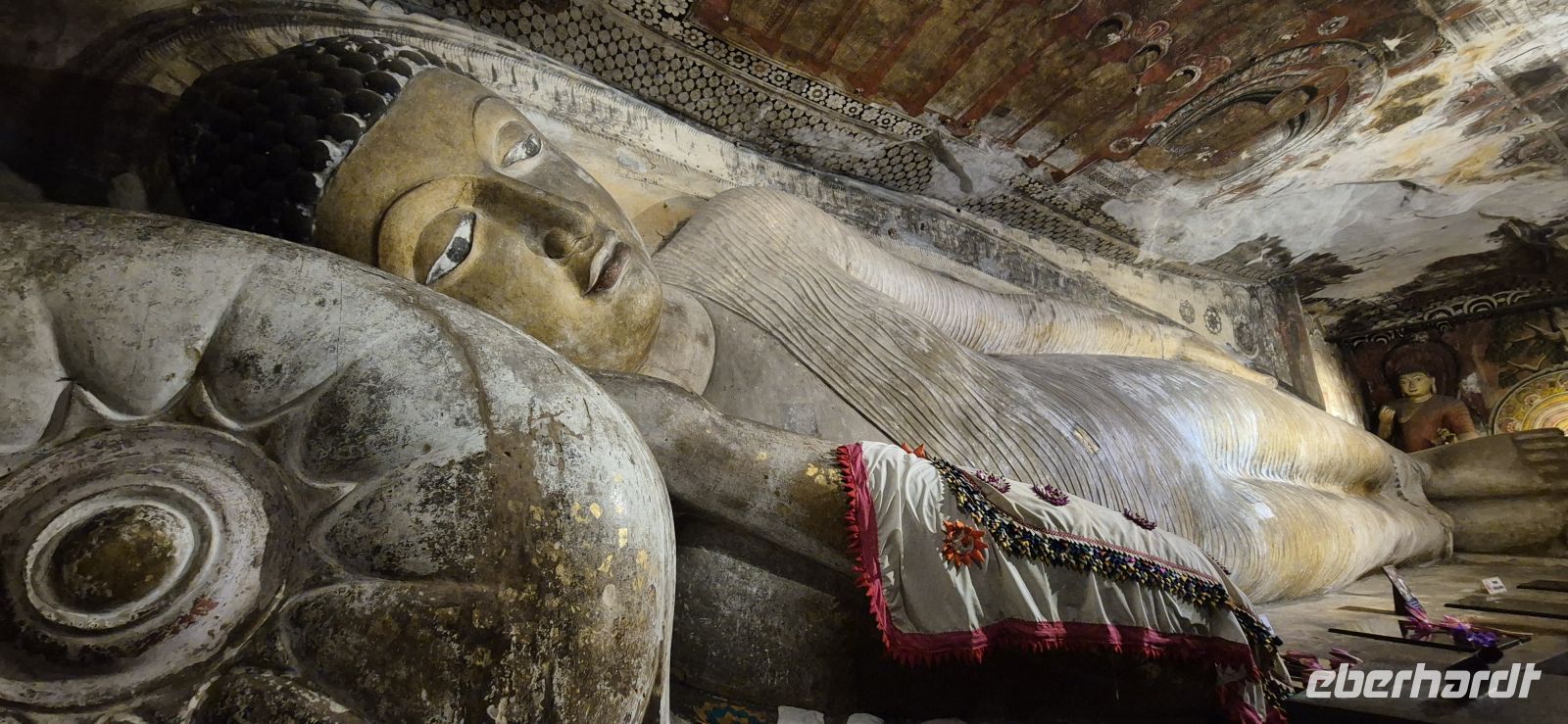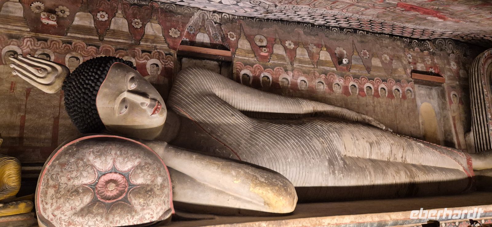 Wir hören, dass Sri Lanka einer der größten Exporteure von Kokosprodukten weltweit ist. Neben Öl, Milch und Mehl werden hier auch Kosmetika und sogar Aktivkohle aus Kokosnussschalen hergestellt. Ein echtes Multitalent der Natur! Sampa, unser Reiseleiter, verspricht uns auf dem Weg nach Kandy noch eine andere Station anzuschauen, wo die Kokosnuss nochmals auf andere Art und Weise verarbeitet wird. Doch zunächst steuern wir ein für Sri Lanka sehr wichtiges kulturelles Highlight an: den berühmten Felsentempel von Dambulla. Dieser thront majestätisch über der Landschaft, und schon von unten wirkt der goldene Buddha wie ein Wächter über das Heiligtum. Der Weg hinauf ist neu gestaltet – sanft ansteigend, angenehm zu gehen und mit Blick auf die grün bewaldeten Hügel ringsum.