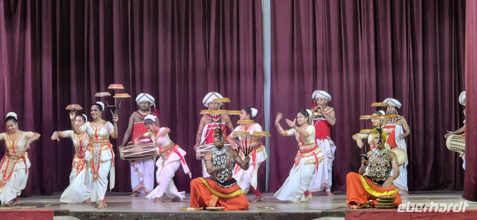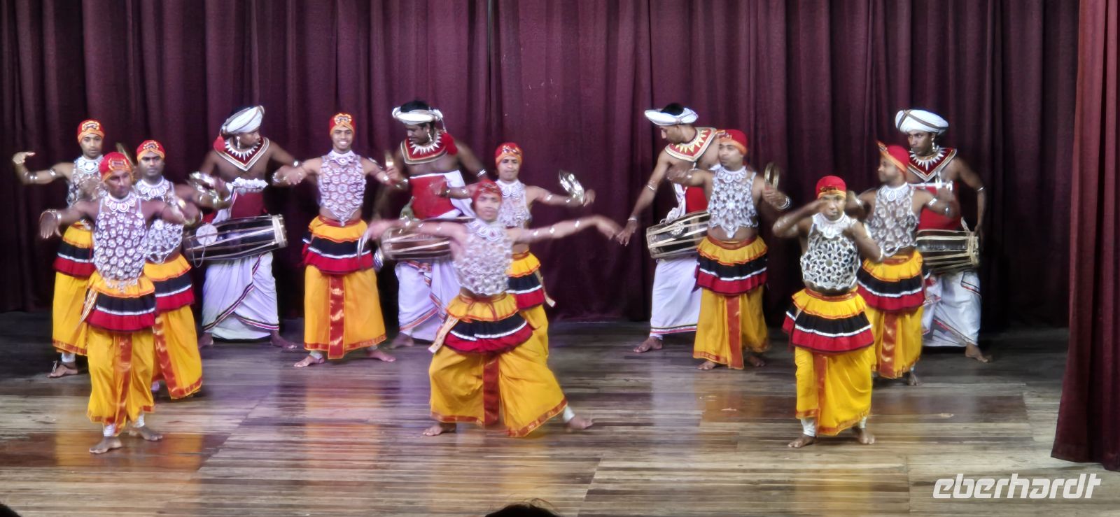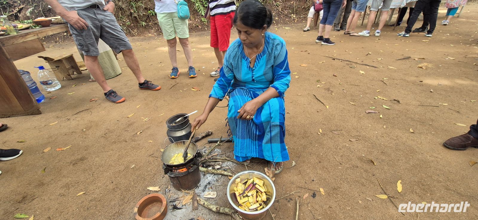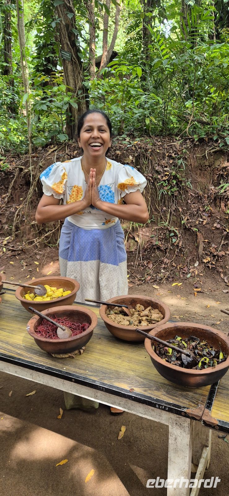 Nach einem reichhaltigen Frühstück im Earls Regency Hotel starten wir zu einem Aussichtspunkt in Kandy, von wo aus wir eine tolle Übersicht und eine noch bessere Aussicht über die Stadt haben. Diese war einst von 1592 bis 1815 die Hauptstadt der Insel, bevor sie durch Colombo ersetzt wurde. Bei sehr angenehmen Wetterverhältnissen steuern wir den nun 200 Jahre alten Botanischen Garten , den sogenannten Royal Botanic Garden Peradeniya, einem der berühmtesten botanischen Gärten Asiens, an und genießen die nächsten Stunden dieses wunderbare Stück Natur, bestaunen die vielen exotischen Pflanzen und Bäume, die hier aus der ganzen Welt zusammengetragen wurden. Neben Flora und Fauna hören und sehen wir auch, dass sich hier viele junge oder potenzielle Paare zum Kennenlernen treffen und je weniger man sich kennt, so näher man am Eingang sitzt und je vermeintlich besser man sich schon für gut befunden hat, umso weiter im Park hineinsitzt man auf den vielzähligen Parkbänken ringsherum. Und tatsächlich, wir sehen so einige junge Menschen ins Gespräch vertieft. Zwischen riesigen Bambussträngen, majestätischen Königspalmen und den weit ausladenden Feigenbäumen spazieren wir entspannt durch die Anlage. Immer wieder bleibt unsere Gruppe stehen, staunt, fotografiert, entdeckt Neues. Der Garten wirkt wie ein lebendiges Museum der Pflanzenwelt Sri Lankas und der restlichen Welt, denn es gibt hier an die viertausend Pflanzen und Bäume. Hier könnte man gut und gerne den ganzen Tag verweilen, jedoch wartet das nächste Naturerlebnis auf uns. Wir fahren weiter zu Mrs. Sanda, die uns schon erwartet. Ihr Küche für das heutige Schaukochen liegt mitten in der Natur, eingebettet in Grün, begleitet vom Lachen ihrer Kinder, die uns herzlich mit Ayubowan begrüßen und dem Duft frischer Gewürze aus der kleinen Außenküche. Alles fühlt sich persönlich, familiär und herzlich an. Sanda und ihre Mutter haben bereits einige Zutaten vorbereitet, doch sie kochen nicht einfach für uns – sie kochen mit uns. Wir dürfen Kokosnuss raspeln, Gewürze mischen, probieren, fragen und ausprobieren. Gemeinsam bereiten wir zwei Gerichte zu: ein aromatisches Linsencurry und einen wunderbar würzigen Auberginensalat. Die beiden Frauen erklären uns, wie wichtig frische Kokosnuss, lokale Kräuter und die richtige Balance der Gewürze sind. Ihre Art, uns einzubeziehen, macht das Erlebnis zu etwas ganz Besonderem. Beim gemeinsamen Essen sitzen wir an einem großen Tisch, genießen die Vielfalt der srilankischen Küche und lassen uns anschließend ein traditionelles Dessert aus Curd & Treacle schmecken. Es ist ein familiärer Nachmittag, mit echter Gastfreundschaft. Nun kehren wir erst mal für einen Abstecher in unser Hotel zurück, machen uns frisch und brechen kurz darauf wieder auf, um uns die berühmten Kandy-Tänze anzusehen. Im Kandyan Cultural Centre erleben wir eine lebendige Vorstellung dieser alten Königstradition. Die Tänze stammen aus den historischen Ritualen des Hochlands, und ihre Energie beeindruckt uns: kunstvolle Kostüme, rhythmische Trommeln, kraftvolle Sprünge, die an akrobatische Tempeltänze erinnern. Besonders faszinierend ist die tänzerische Verbindung aus Spiritualität, Kultur und Geschichte – ein echtes Kulturerbe Sri Lankas. Am Abend kehren wir erfüllt ins Hotel zurück und lassen bei einem schmackhaften Buffet die Erlebnisse des Tages Revue passieren.