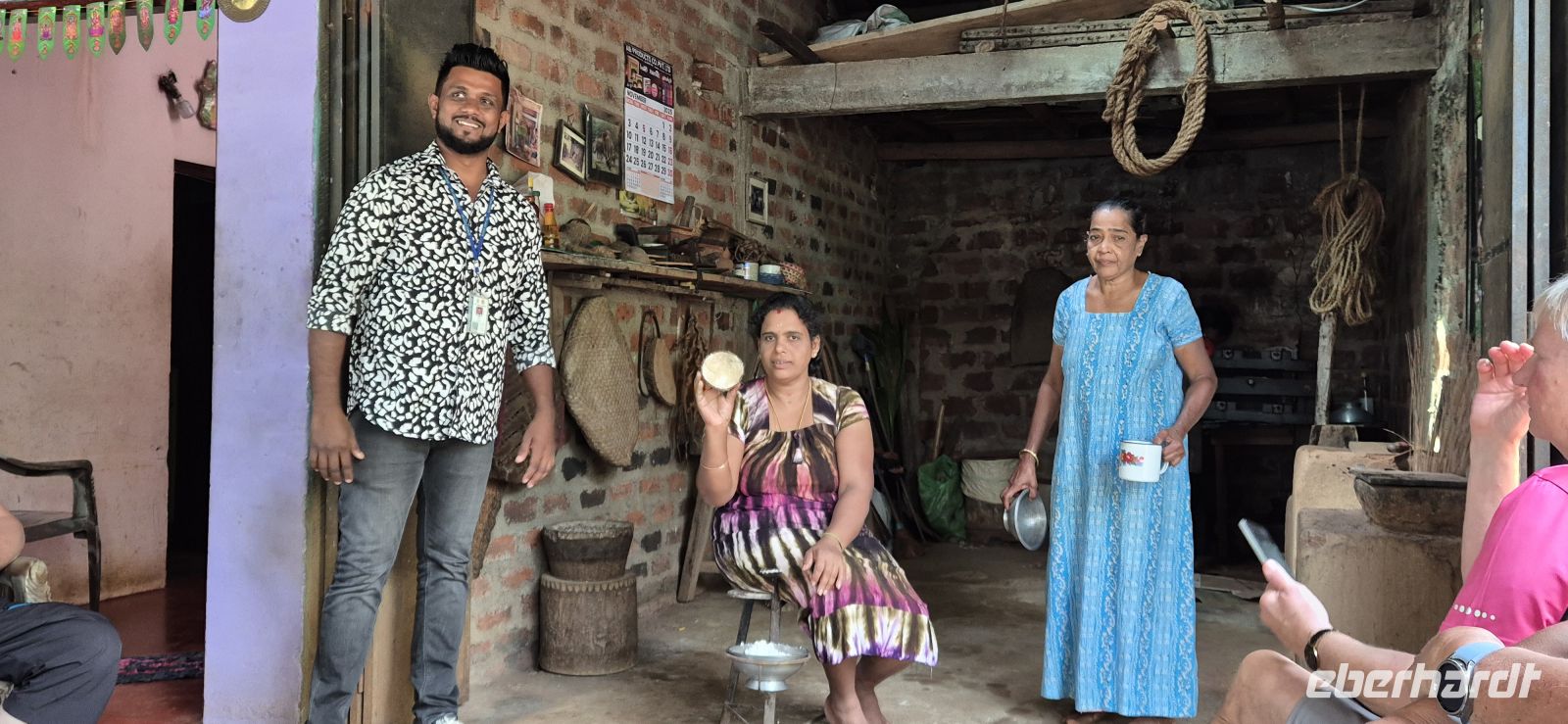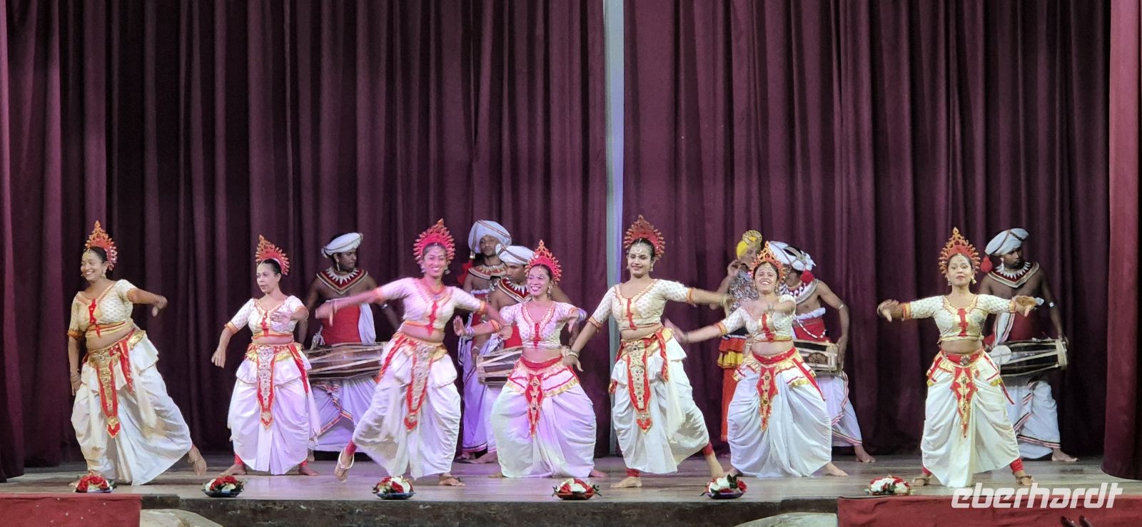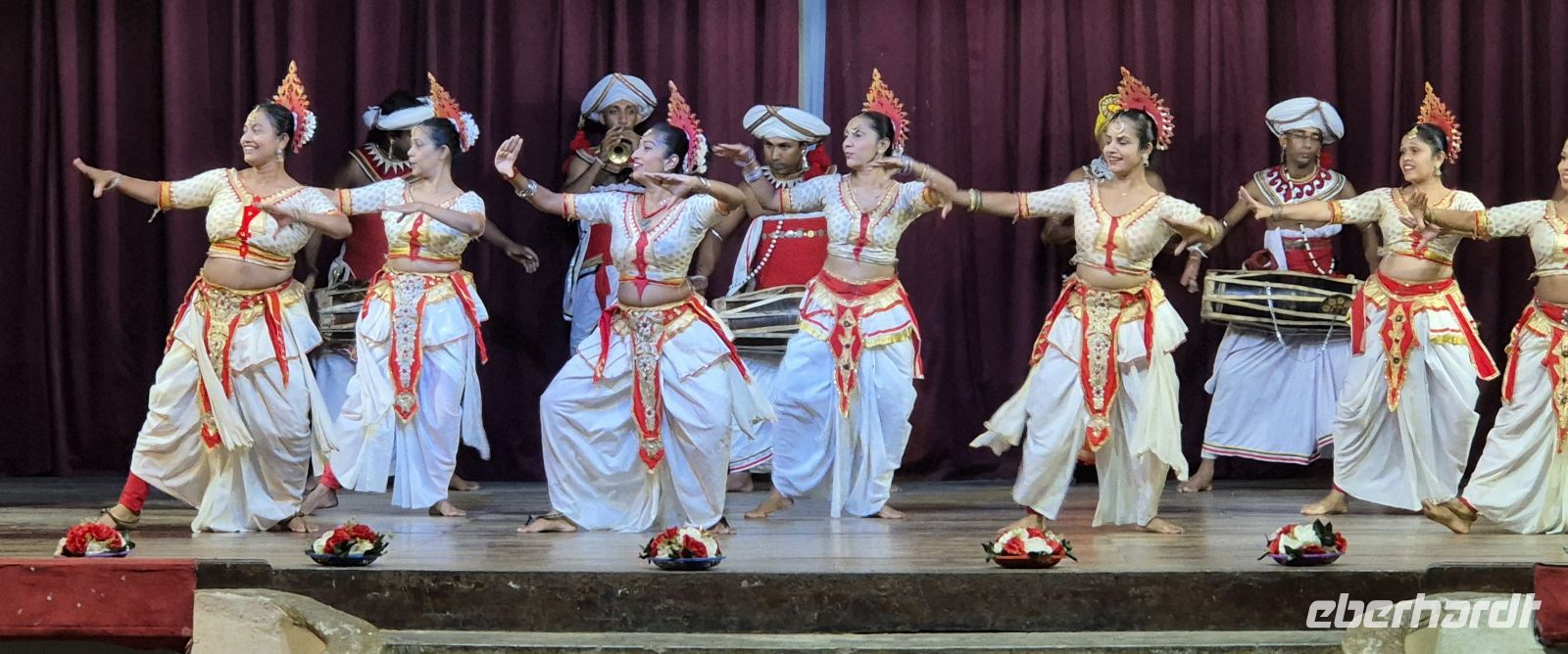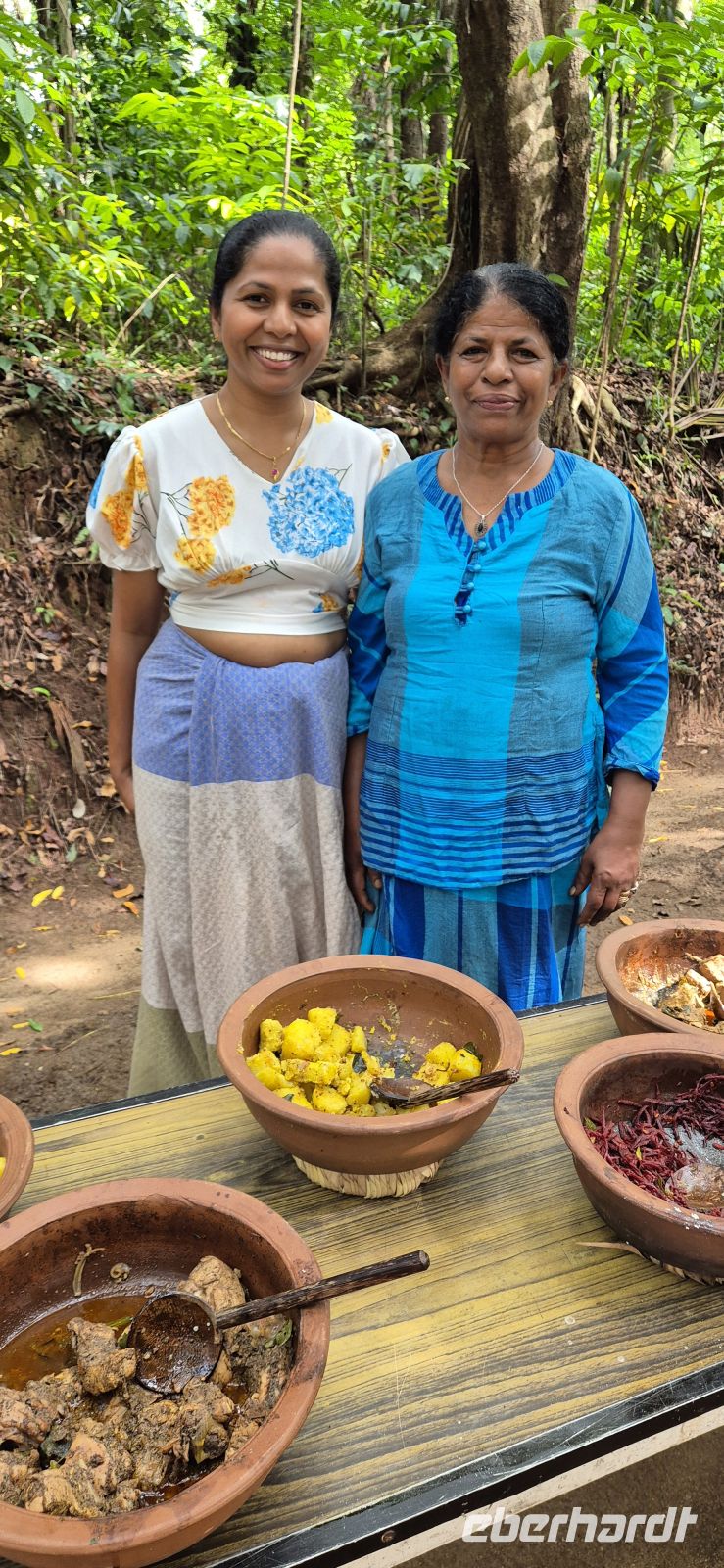 Nach einem reichhaltigen Frühstück im Earls Regency Hotel starten wir zu einem Aussichtspunkt in Kandy, von wo aus wir eine tolle Übersicht und eine noch bessere Aussicht über die Stadt haben. Diese war einst von 1592 bis 1815 die Hauptstadt der Insel, bevor sie durch Colombo ersetzt wurde. Bei sehr angenehmen Wetterverhältnissen steuern wir den nun 200 Jahre alten Botanischen Garten , den sogenannten Royal Botanic Garden Peradeniya, einem der berühmtesten botanischen Gärten Asiens, an und genießen die nächsten Stunden dieses wunderbare Stück Natur, bestaunen die vielen exotischen Pflanzen und Bäume, die hier aus der ganzen Welt zusammengetragen wurden. Neben Flora und Fauna hören und sehen wir auch, dass sich hier viele junge oder potenzielle Paare zum Kennenlernen treffen und je weniger man sich kennt, so näher man am Eingang sitzt und je vermeintlich besser man sich schon für gut befunden hat, umso weiter im Park hineinsitzt man auf den vielzähligen Parkbänken ringsherum. Und tatsächlich, wir sehen so einige junge Menschen ins Gespräch vertieft. Zwischen riesigen Bambussträngen, majestätischen Königspalmen und den weit ausladenden Feigenbäumen spazieren wir entspannt durch die Anlage. Immer wieder bleibt unsere Gruppe stehen, staunt, fotografiert, entdeckt Neues. Der Garten wirkt wie ein lebendiges Museum der Pflanzenwelt Sri Lankas und der restlichen Welt, denn es gibt hier an die viertausend Pflanzen und Bäume. Hier könnte man gut und gerne den ganzen Tag verweilen, jedoch wartet das nächste Naturerlebnis auf uns. Wir fahren weiter zu Mrs. Sanda, die uns schon erwartet. Ihr Küche für das heutige Schaukochen liegt mitten in der Natur, eingebettet in Grün, begleitet vom Lachen ihrer Kinder, die uns herzlich mit Ayubowan begrüßen und dem Duft frischer Gewürze aus der kleinen Außenküche. Alles fühlt sich persönlich, familiär und herzlich an. Sanda und ihre Mutter haben bereits einige Zutaten vorbereitet, doch sie kochen nicht einfach für uns – sie kochen mit uns. Wir dürfen Kokosnuss raspeln, Gewürze mischen, probieren, fragen und ausprobieren. Gemeinsam bereiten wir zwei Gerichte zu: ein aromatisches Linsencurry und einen wunderbar würzigen Auberginensalat. Die beiden Frauen erklären uns, wie wichtig frische Kokosnuss, lokale Kräuter und die richtige Balance der Gewürze sind. Ihre Art, uns einzubeziehen, macht das Erlebnis zu etwas ganz Besonderem. Beim gemeinsamen Essen sitzen wir an einem großen Tisch, genießen die Vielfalt der srilankischen Küche und lassen uns anschließend ein traditionelles Dessert aus Curd & Treacle schmecken. Es ist ein familiärer Nachmittag, mit echter Gastfreundschaft. Nun kehren wir erst mal für einen Abstecher in unser Hotel zurück, machen uns frisch und brechen kurz darauf wieder auf, um uns die berühmten Kandy-Tänze anzusehen. Im Kandyan Cultural Centre erleben wir eine lebendige Vorstellung dieser alten Königstradition. Die Tänze stammen aus den historischen Ritualen des Hochlands, und ihre Energie beeindruckt uns: kunstvolle Kostüme, rhythmische Trommeln, kraftvolle Sprünge, die an akrobatische Tempeltänze erinnern. Besonders faszinierend ist die tänzerische Verbindung aus Spiritualität, Kultur und Geschichte – ein echtes Kulturerbe Sri Lankas. Am Abend kehren wir erfüllt ins Hotel zurück und lassen bei einem schmackhaften Buffet die Erlebnisse des Tages Revue passieren.