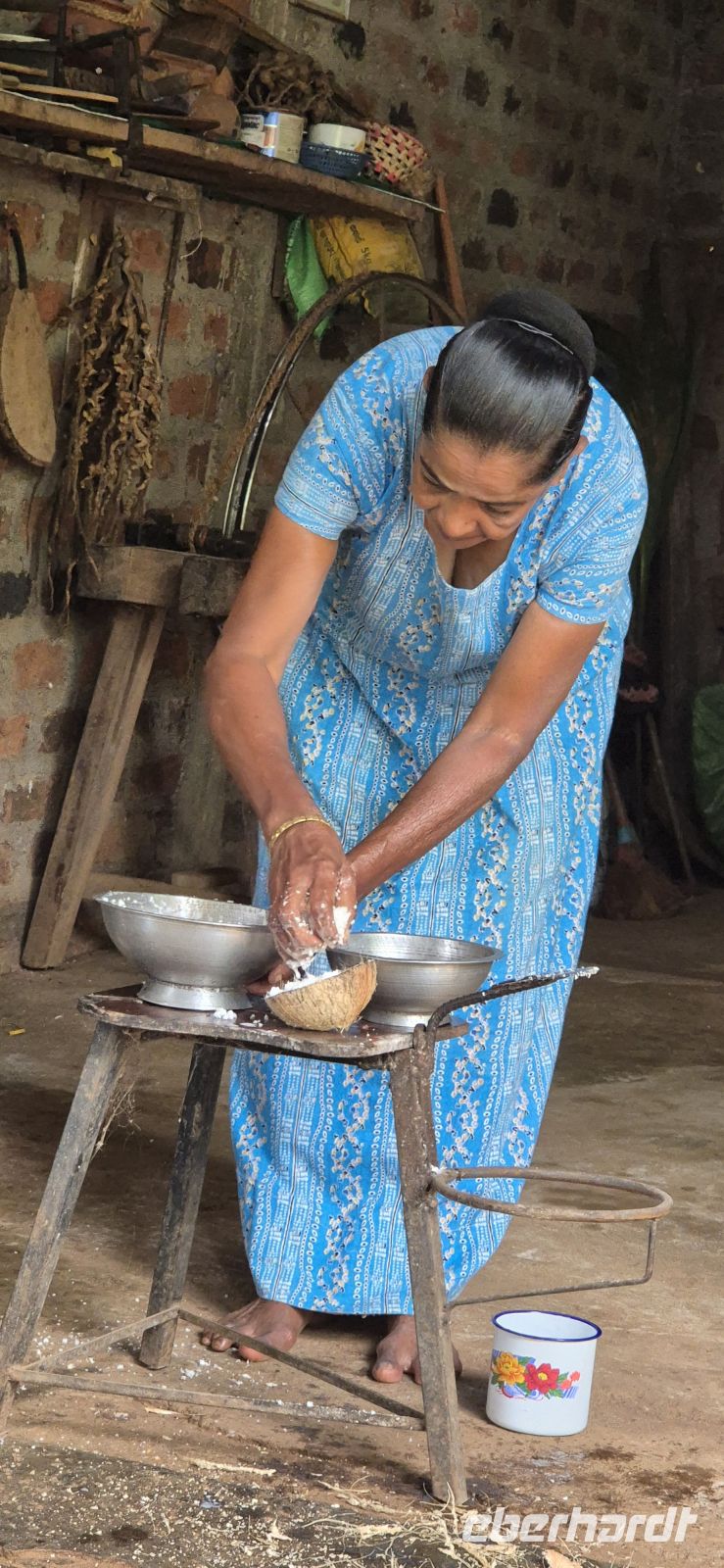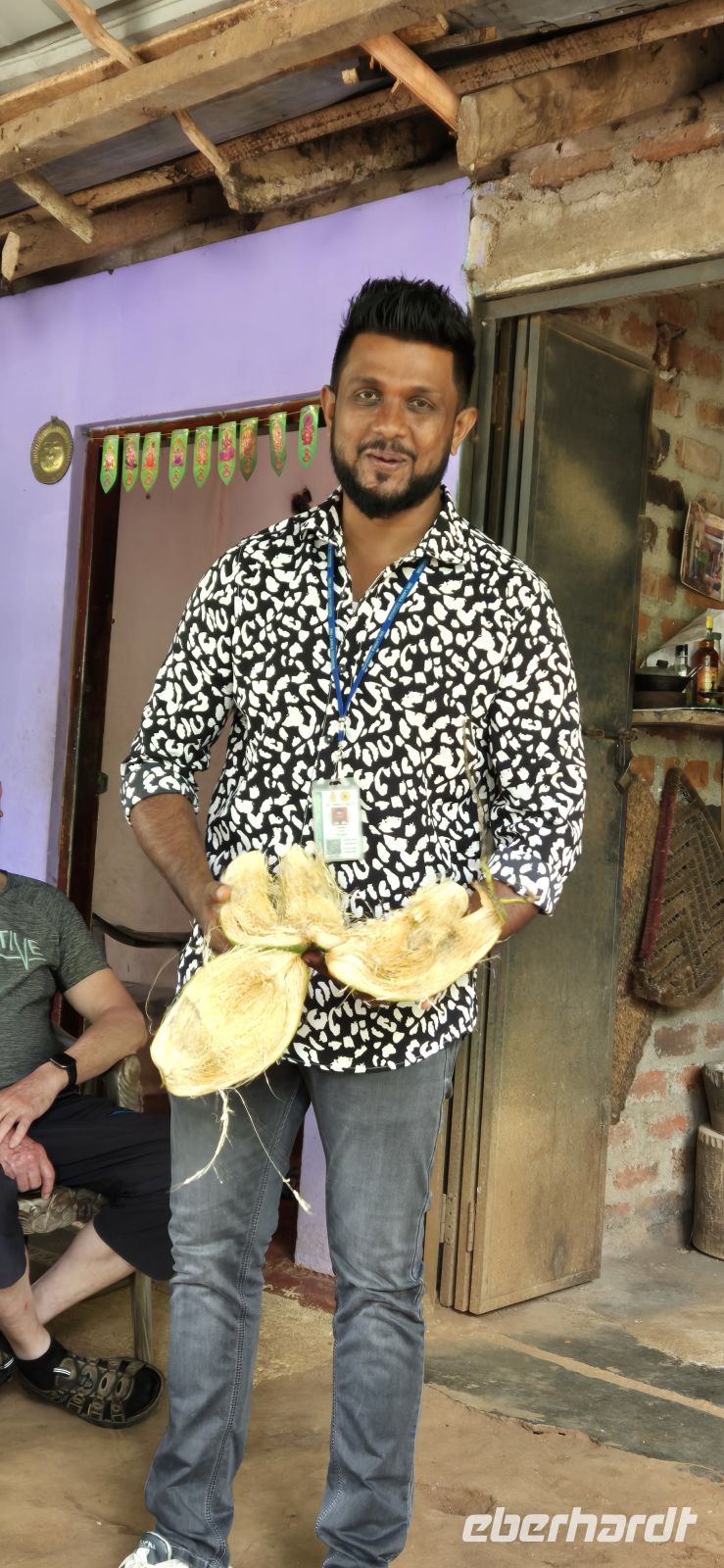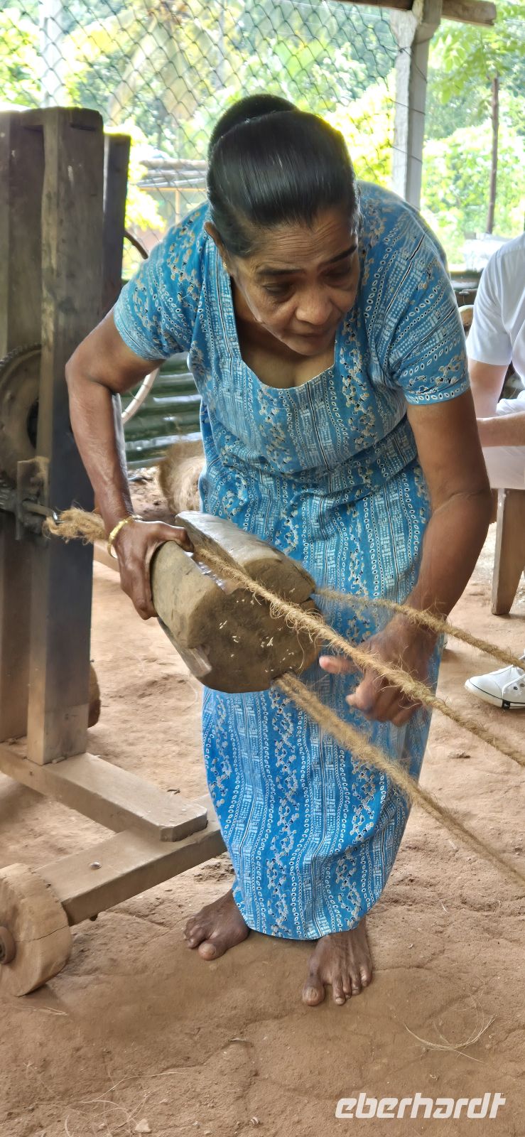 Unser erster Stopp ist die Colo Kokosnussfabrik. Ein süßlich-herbe Geruch der Schalen und Fasern liegt hier in der Luft. Schon auf dem Weg dorthin zeigt sich, wie vielseitig die Kokospalme ist – kein Teil wird verschwendet. Die Schale liefert Fasern für Matten und Seile, das Kokosfleisch wird zu Öl oder feinem Pulver verarbeitet, die Schalenreste dienen als Brennmaterial.