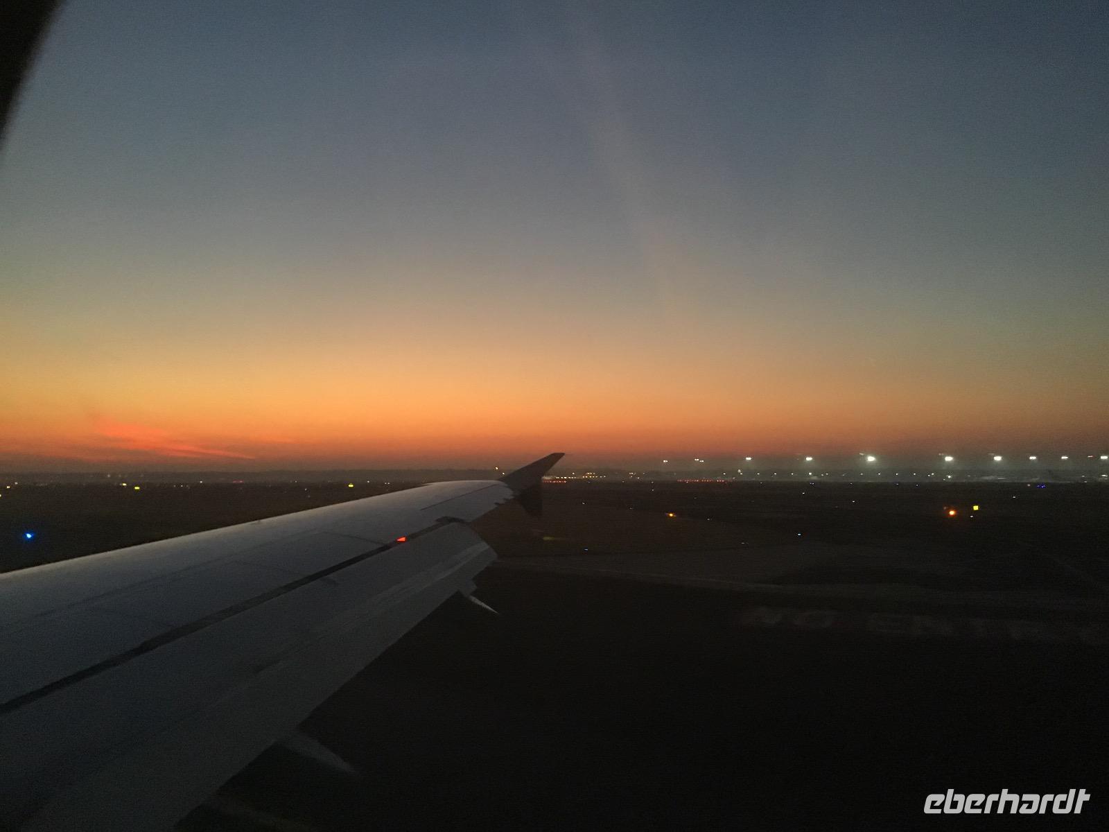 In Dresden fliegt, zeitgleich mit uns, eine große Eberhardt-Gruppe nach Zypern. Eberhardt TRAVEL hat fast ein ganzes Flugzeug gechartert und so kommt es, dass wir heute eine ganz spezielle Verabschiedung genießen. Pünktlich startet die Lufthansa nach Frankfurt, wo wir uns mit unseren Mitreisenden treffen. Hierfür müssen wir allerdings auf abenteuerliche Weise von Terminal 1 nach Terminal 2 wechseln, aber auch das gelingt, wir bekommen unsere Bordkarten und der Langstreckenflug beginnt.