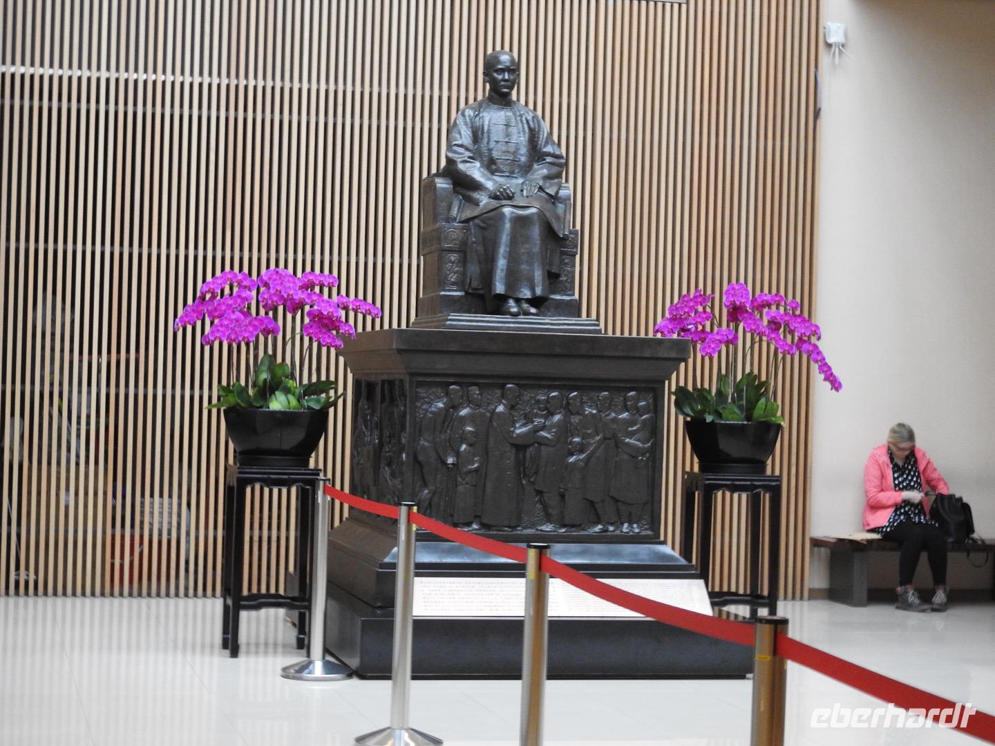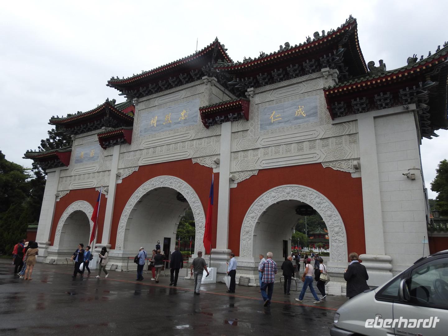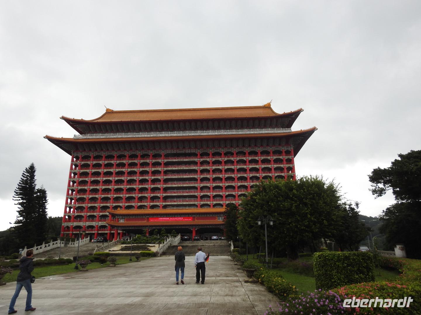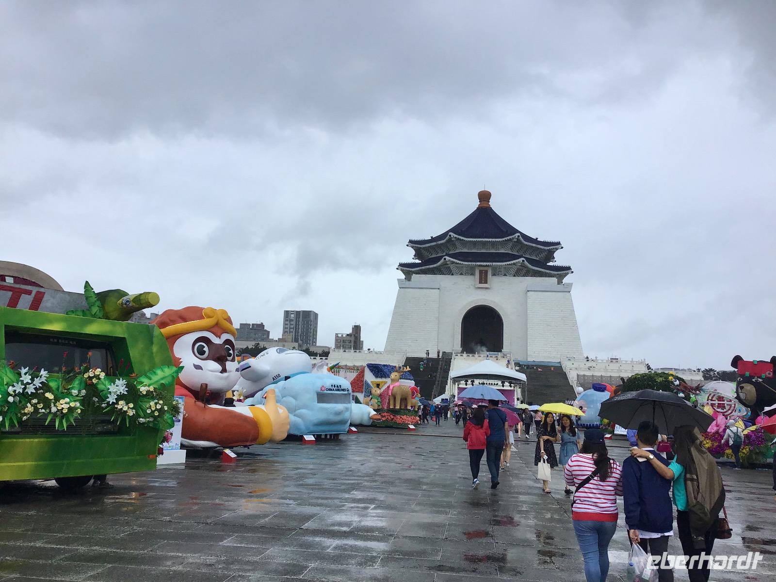 Nach zwölfeinhalb Stunden ist es überstanden. Dafür dauert die Einreiseprozedur nochmal zwei Stunden, erst um Acht treffen wir Li, unseren örtlichen Guide. Wir tauschen etwas Geld um (15 € pro Person und Tag als Tipp), bekommen den an der Wechselstube stehen gelassenen Koffer zurück und fahren nach Taipei. Mit dem schnellsten Fahrstuhl der Welt gelangen wir ins Observatorium des Taipei 101 (sprich one-o-one), von dem wir eine spektakuläre Aussicht auf die Stadt haben. Bis 2007 war der Taipei 101 der höchste Wolkenkratzer der Welt, nunmehr ist er an die zehnte Stelle gerückt. Heute ist es sehr wolkig und die Sicht ist beschränkt. Die Außenplattform ist auf Grund der Wetterlage geschlossen. Wir bewundern trotzdem die Stadt von oben, sobald die Wolkendecke aufreißt und uns ein paar Blicke gönnt. Wieder am Boden zurück, führt uns Li im größten Einkaufszentrum der Stadt, das sich am Fuße des Taipei 101 befindet, in ein Spezialitätenrestaurant für Dumplings. Vorspeisen, die wir uns teilen, stehen bereits auf dem Tisch, dann werden die Dampfnudeln mit verschiedenen Füllungen serviert. Also hungrig steht hier keiner auf. Wieder im Bus überkommt uns jetzt die Müdigkeit. Augen und Ohren fallen zu. Doch noch ist keine Zeit zum Ausruhen. Am Parlamentsgebäude legen wir einen Fotostopp ein. Die frische Luft tut gut. Kurz danach erreichen wir die Chiang-Kai-Shek Gedächtnishalle. Davor sind etliche bunte Wagen aufgestellt, gestern gab es einen Umzug zum Nationalfeiertag. Chiang Kai Shek thront allmächtig in seiner Gedächtnishalle, bewacht von zwei Gardesoldaten. Links und rechts von der Gedächtnishalle befinden sich noch Oper- und Konzerthaus, beide sind aber geschlossen. Jetzt fahren wir endlich ins Hotel und fallen für zwei Stunden müde in die Betten. 18 Uhr treffen wir uns wieder und spazieren zur Yongkang Street. Links, links, rechts, links - das kann ja so schwer nicht sein. Nur eine Querstraße laufen wir zu viel, dann haben wir's. Hier reiht sich Restaurant an Restaurant, Laden an Laden. Am Ende der Straße entdecken wir ein kleines Etablissement, das unseren Vorstellungen entspricht, nicht zu fein, aber auch keine Garküche. Bei scharfen Nudeln verbrennt der Mund, aber lecker ist es allemal. Mittels I-Phone Übersetzungsapp können wir Tischnachbarn mitteilen, dass wir aus Deutschland sind. Ende der Kommunikation. Die jungen Männer, die unsere Bestellungen aufnehmen, sind herzallerliebst, sie geben sich so viel Mühe, damit es uns gut geht. Die Mutter des Hauses wird zu 7/11 geschickt, um für uns Plastikgabeln einzukaufen - DANKE! Auf dem Rückweg zum Hotel kehren wir bei King Mango ein und verputzen eine Riesenportion Mango-Eis.