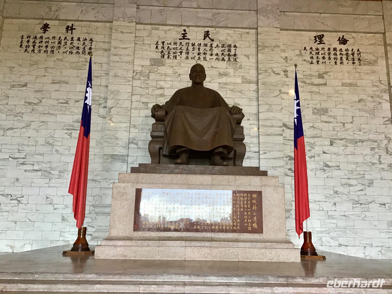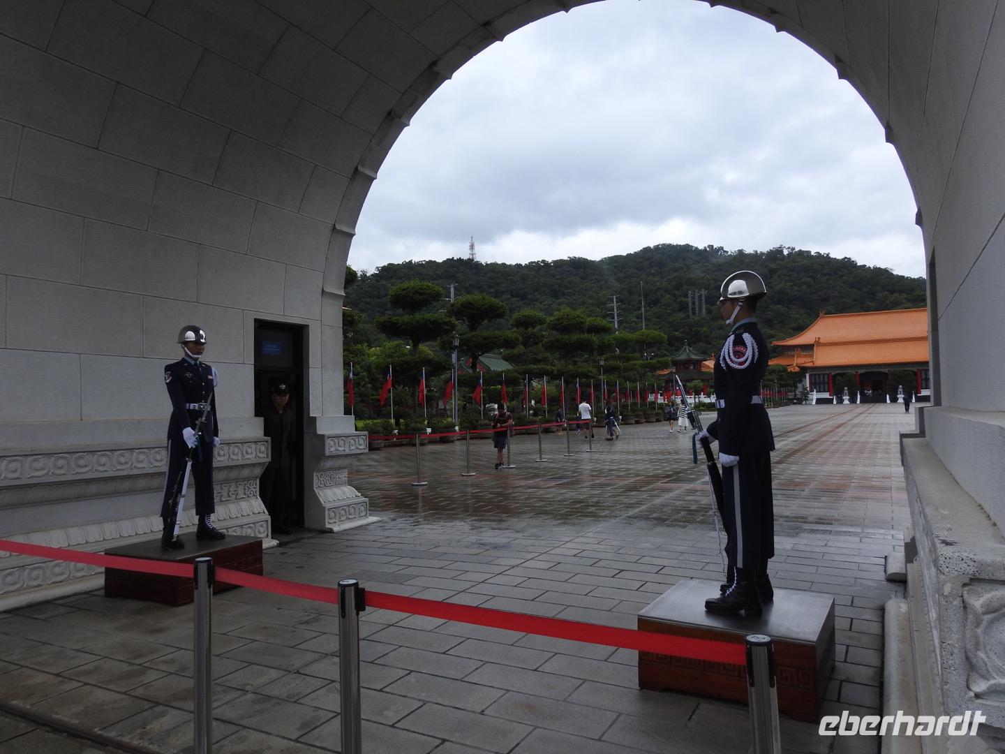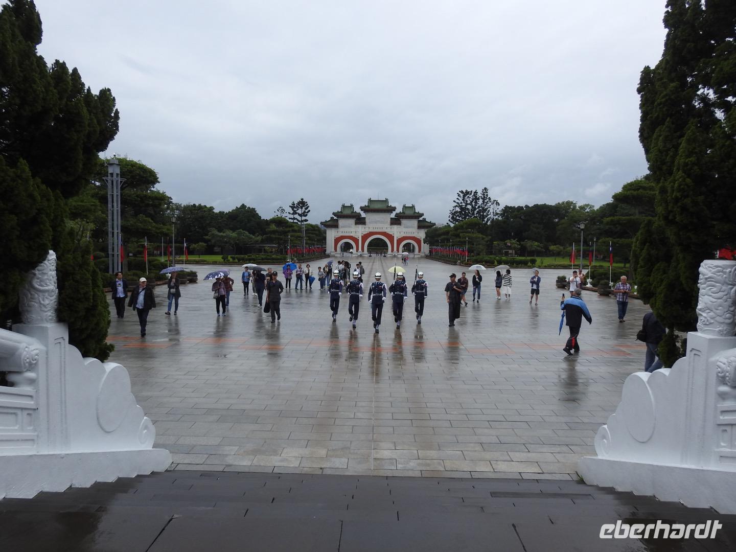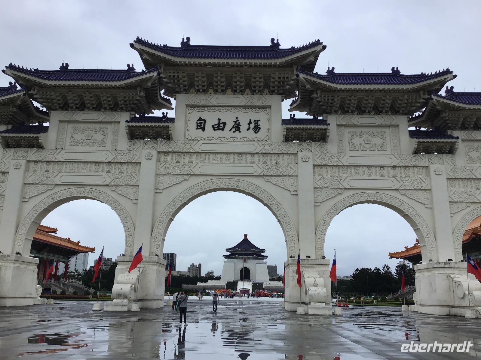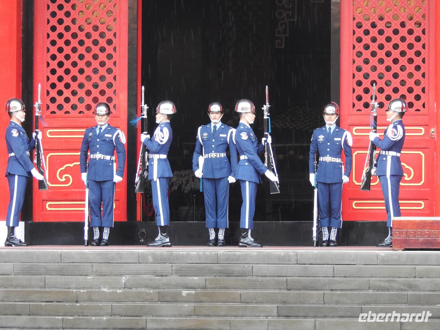 Nach zwölfeinhalb Stunden ist es überstanden. Dafür dauert die Einreiseprozedur nochmal zwei Stunden, erst um Acht treffen wir Li, unseren örtlichen Guide. Wir tauschen etwas Geld um (15 € pro Person und Tag als Tipp), bekommen den an der Wechselstube stehen gelassenen Koffer zurück und fahren nach Taipei. Mit dem schnellsten Fahrstuhl der Welt gelangen wir ins Observatorium des Taipei 101 (sprich one-o-one), von dem wir eine spektakuläre Aussicht auf die Stadt haben. Bis 2007 war der Taipei 101 der höchste Wolkenkratzer der Welt, nunmehr ist er an die zehnte Stelle gerückt. Heute ist es sehr wolkig und die Sicht ist beschränkt. Die Außenplattform ist auf Grund der Wetterlage geschlossen. Wir bewundern trotzdem die Stadt von oben, sobald die Wolkendecke aufreißt und uns ein paar Blicke gönnt. Wieder am Boden zurück, führt uns Li im größten Einkaufszentrum der Stadt, das sich am Fuße des Taipei 101 befindet, in ein Spezialitätenrestaurant für Dumplings. Vorspeisen, die wir uns teilen, stehen bereits auf dem Tisch, dann werden die Dampfnudeln mit verschiedenen Füllungen serviert. Also hungrig steht hier keiner auf. Wieder im Bus überkommt uns jetzt die Müdigkeit. Augen und Ohren fallen zu. Doch noch ist keine Zeit zum Ausruhen. Am Parlamentsgebäude legen wir einen Fotostopp ein. Die frische Luft tut gut. Kurz danach erreichen wir die Chiang-Kai-Shek Gedächtnishalle. Davor sind etliche bunte Wagen aufgestellt, gestern gab es einen Umzug zum Nationalfeiertag. Chiang Kai Shek thront allmächtig in seiner Gedächtnishalle, bewacht von zwei Gardesoldaten. Links und rechts von der Gedächtnishalle befinden sich noch Oper- und Konzerthaus, beide sind aber geschlossen. Jetzt fahren wir endlich ins Hotel und fallen für zwei Stunden müde in die Betten. 18 Uhr treffen wir uns wieder und spazieren zur Yongkang Street. Links, links, rechts, links - das kann ja so schwer nicht sein. Nur eine Querstraße laufen wir zu viel, dann haben wir's. Hier reiht sich Restaurant an Restaurant, Laden an Laden. Am Ende der Straße entdecken wir ein kleines Etablissement, das unseren Vorstellungen entspricht, nicht zu fein, aber auch keine Garküche. Bei scharfen Nudeln verbrennt der Mund, aber lecker ist es allemal. Mittels I-Phone Übersetzungsapp können wir Tischnachbarn mitteilen, dass wir aus Deutschland sind. Ende der Kommunikation. Die jungen Männer, die unsere Bestellungen aufnehmen, sind herzallerliebst, sie geben sich so viel Mühe, damit es uns gut geht. Die Mutter des Hauses wird zu 7/11 geschickt, um für uns Plastikgabeln einzukaufen - DANKE! Auf dem Rückweg zum Hotel kehren wir bei King Mango ein und verputzen eine Riesenportion Mango-Eis.