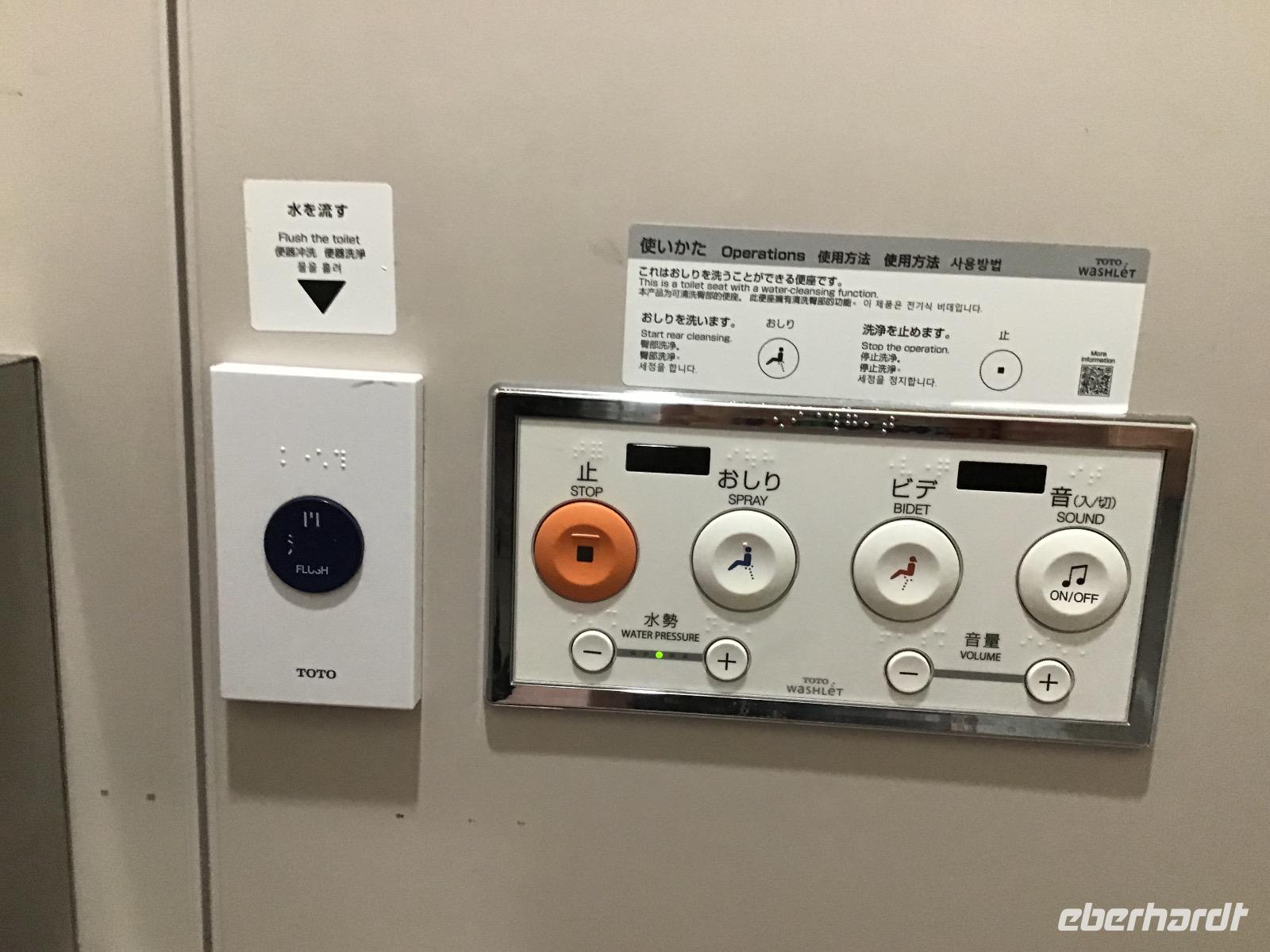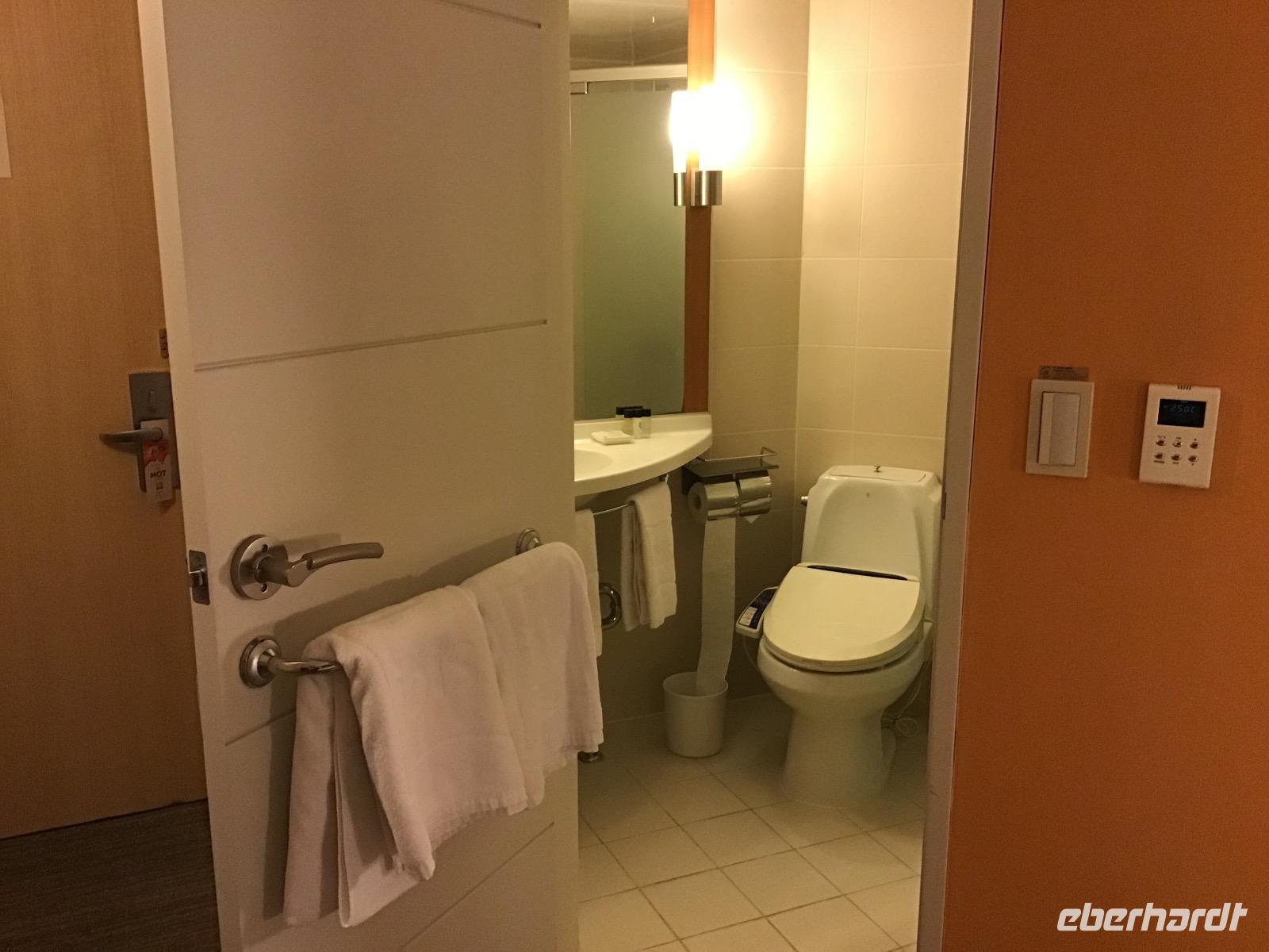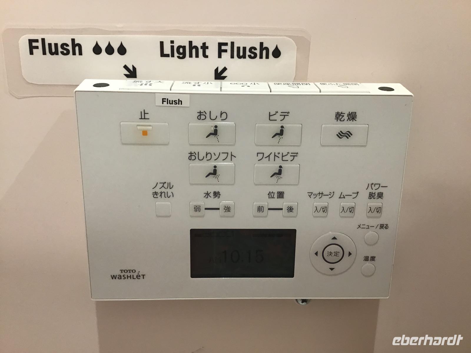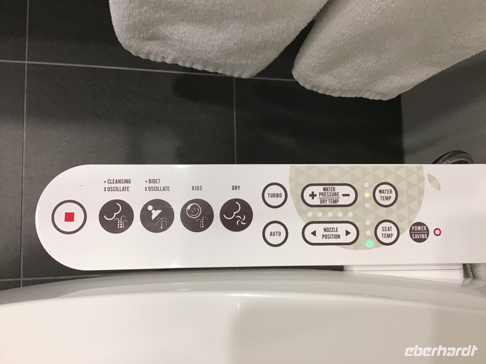 Als krönenden Abschluss probiere ich heute die Funktionen meines WCs aus. Vorsichtig hatte ich schon mit etwas Abstand die verschiedenen Tasten gedrückt, ohne dass sich etwas tat. Kaputt. Denkste. Mit Draufsitzen geht's nämlich. Erster Knopf: Wasser trifft auf Hinterteil - mit erstaunlicher Zielgenauigkeit. Zweiter Knopf für Damen - passt auch. Insgesamt könnte das Wasser etwas wärmer sein, aber sonst... nicht schlecht. Der dritte Knopf dient dann dazu, sich das gesamte Unterteil trocken föhnen zu lassen. Witzig.