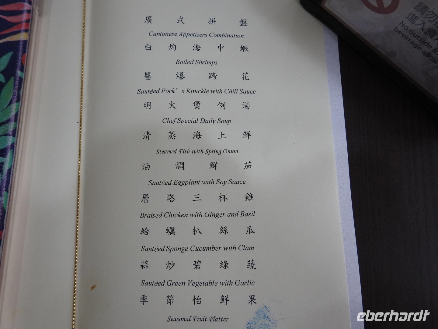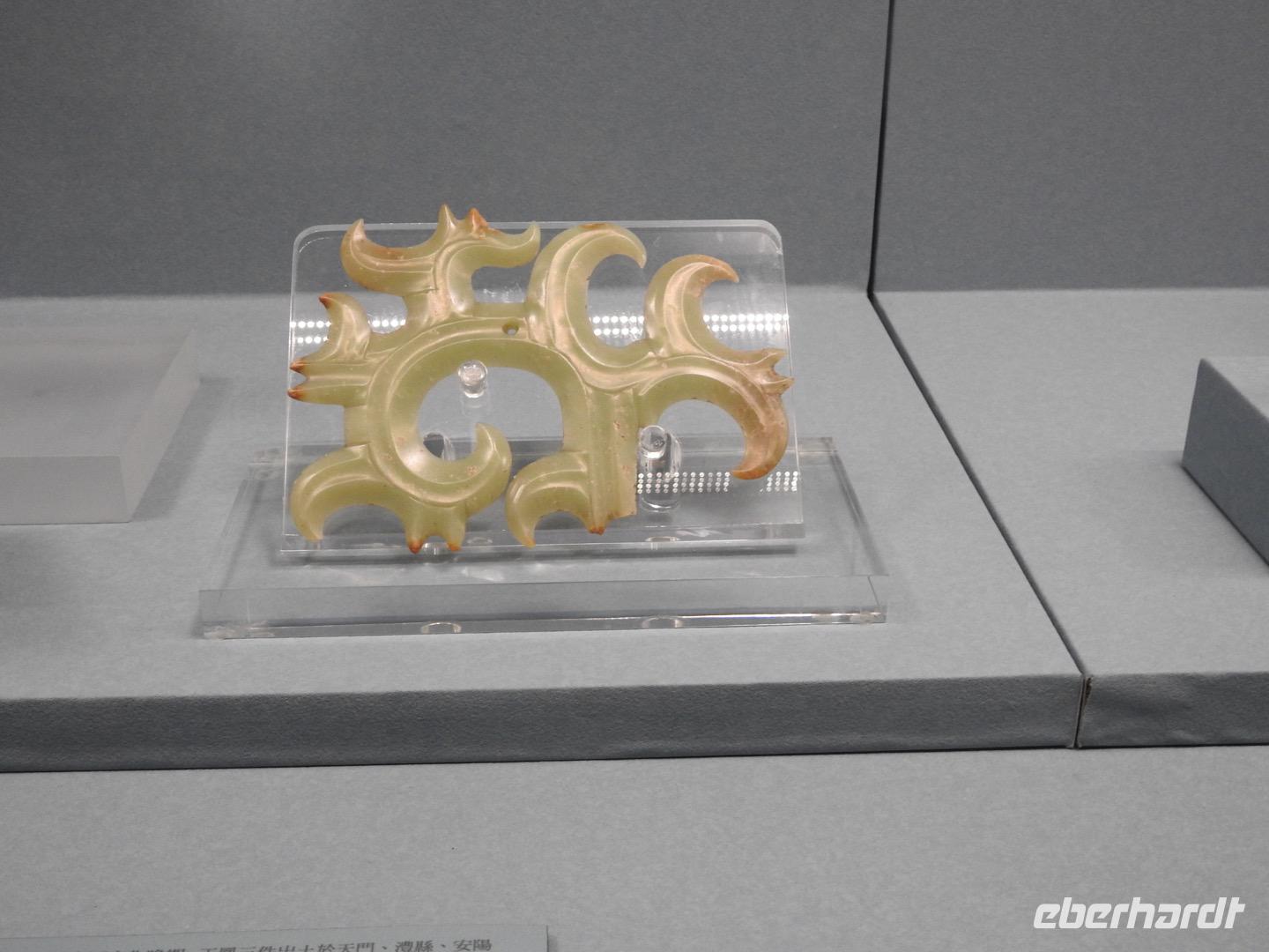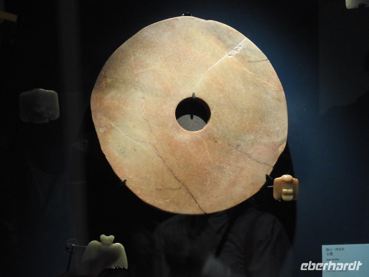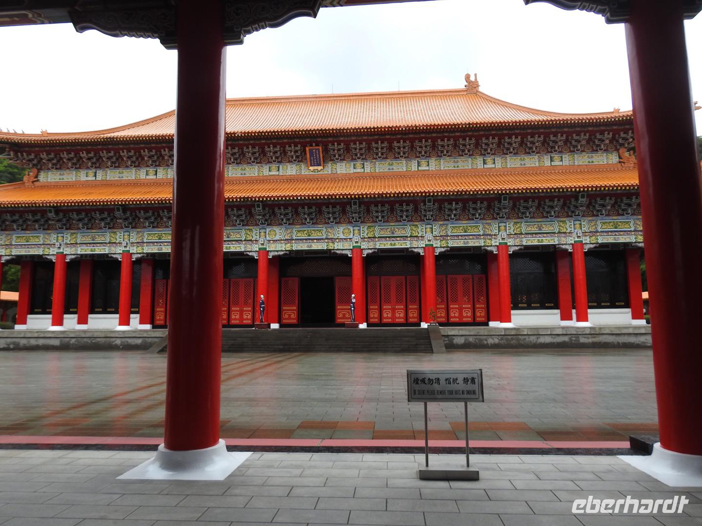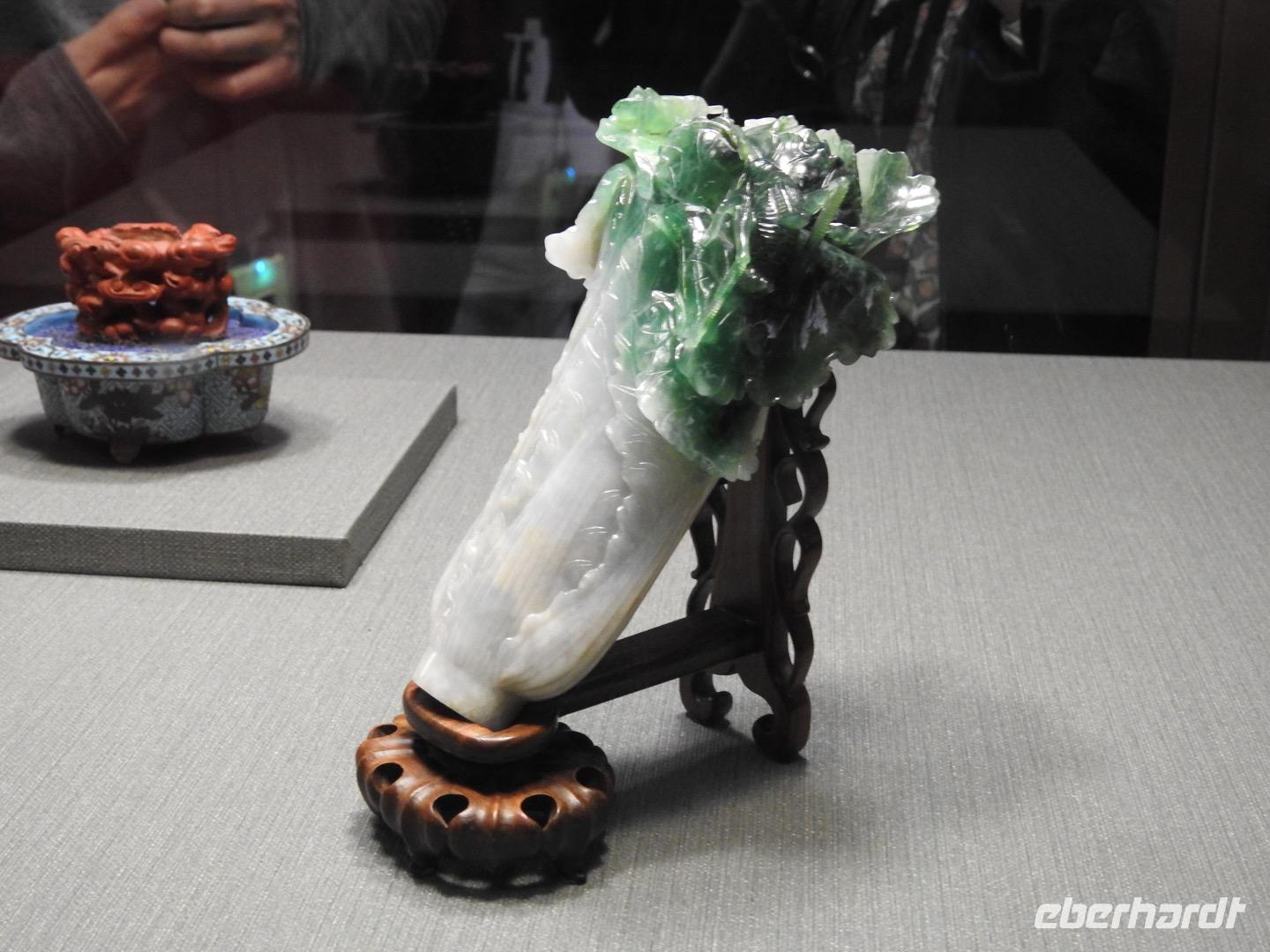 Eine Steinplatte, in die das Relief eines Drachen gemeißelt ist, befindet sich zwischen den beiden Treppen, die in die Haupthalle führen. Das ist der KAISERLICHE WEG, denn nur der Kaiser und natürlich die Götter durften diesen Weg benutzen, um die Halle zu betreten, gewöhnliche Menschen hätten es nie gewagt, die Platte zu berühren. In einem Raum, in der Nähe des Ausgangs sitzt eine ältere Dame, die kunstvoll Sprüche in Kalligraphie Schrift auf rote Blättchen schreibt. Wir dürfen uns eins aussuchen und mitnehmen. Ich wähle den Spruch „alle deine Träume gehen in Erfüllung" - das wär doch mal was, oder? Von Konfuzius ist es nicht weit zum Bao-an Tempel. Er ist der bedeutendste daoistische Tempel Taipeis, gebaut im 18. Jahrhundert. Zum Mittagessen kehren wir heute in ein Restaurant im nationalen Palastmuseum ein. Typisch chinesisch sitzen wir an runden Tischen, in der Mitte ein Drehteller, auf dem die Speisen serviert werden und sich jeder nimmt, was er möchte. Zu Beginn gibt es eine Vorspeisenplatte hauptsächlich mit kaltem Geflügel. Nach und nach werden Suppe, Schweinefleisch, gebratene Auberginen, Shrimps und andere Köstlichkeiten serviert. Cucumber ist übrigens eine Gurke und Clam sind Venusmuscheln. Nun folgt die Besichtigung des Museums. Im nationalen Palastmuseum sind wertvolle Schätze ausgestellt, die zum großen Teil aus der Verbotenen Stadt in Peking stammen und von Chiang Kai Shek hierher gebracht wurden, als er vom chinesischen Festland floh. Die Sammlung umfasst Kunstwerke, die zum Teil achttausend Jahre alt sind. Eines der wertvollsten Stücke ist der Chinakohl aus Jade auf dem eine Heuschrecke sitzt (grün grün weiß weiß). Außerdem ein Stück Schweinefleisch aus Jade. Li zeigt uns mit wachsender Begeisterung die schönsten Exemplare aus Jade, Porzellan und Bronze. Anschließend haben wir eine Stunde Zeit, uns individuell umzusehen oder einen Kaffee zu trinken oder an die frische Luft zu gehen, jeder wie er will.