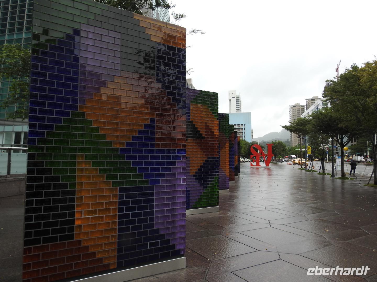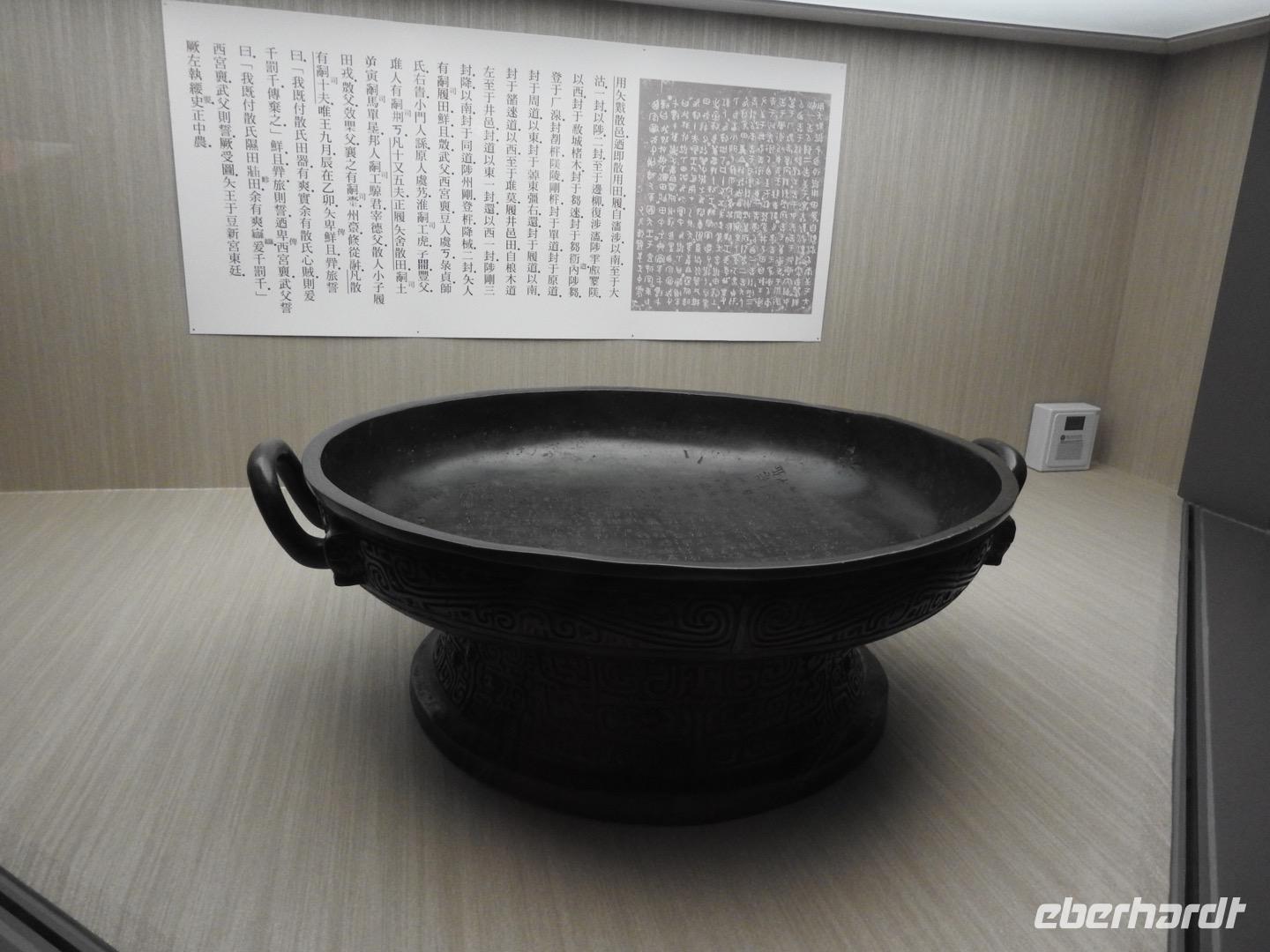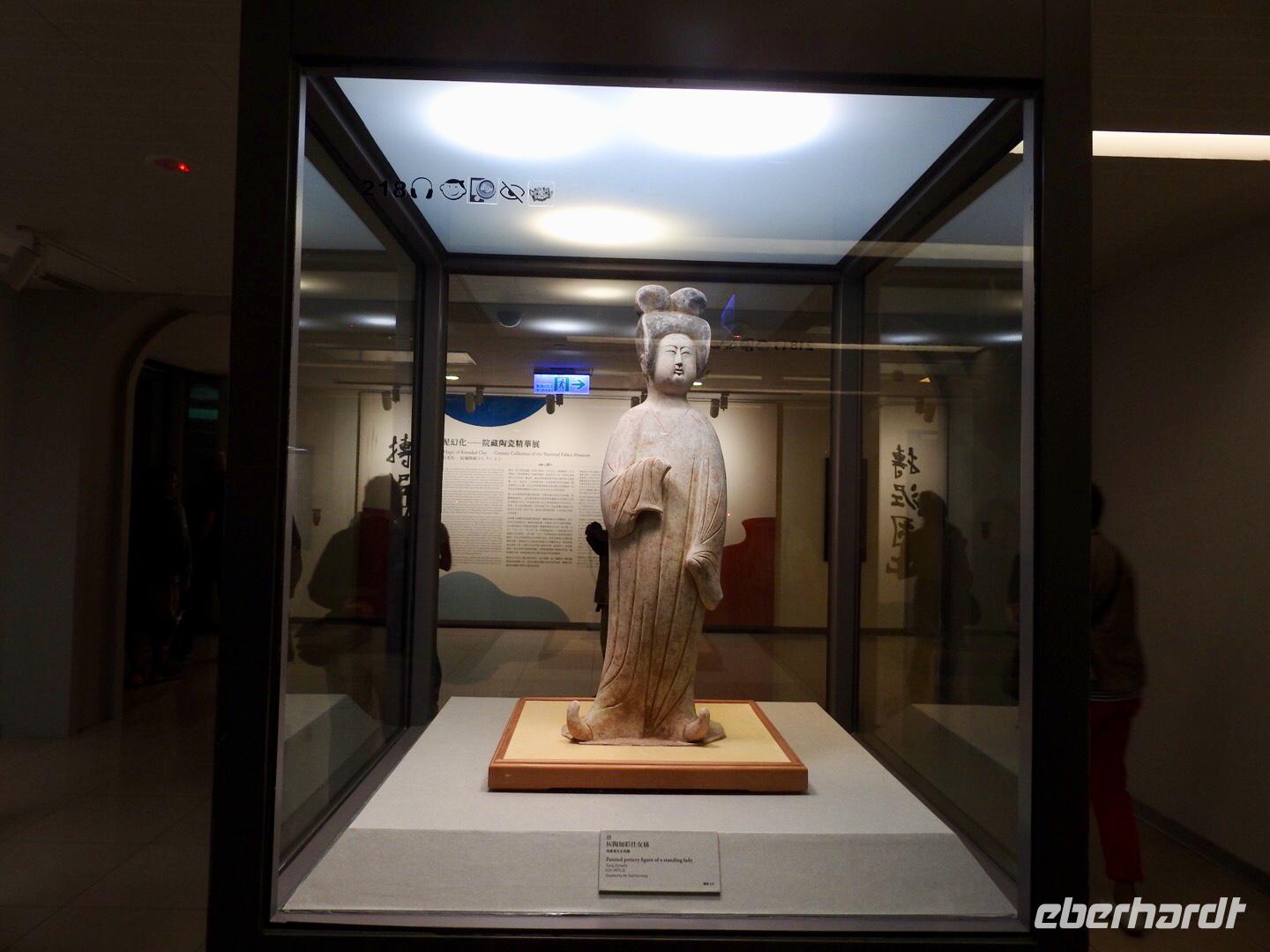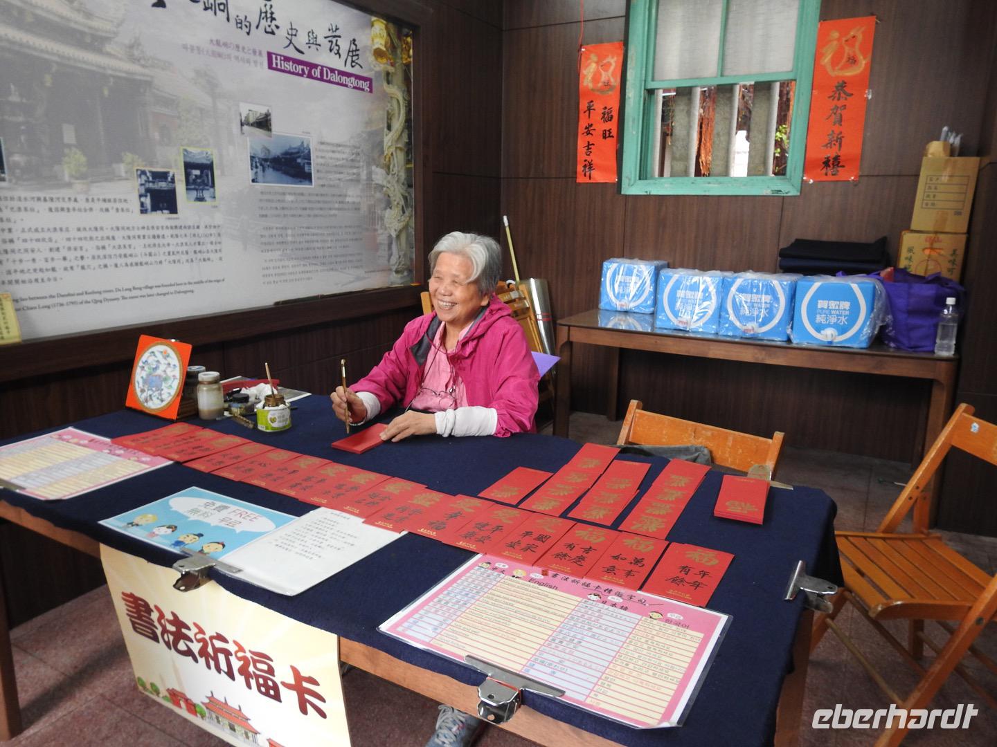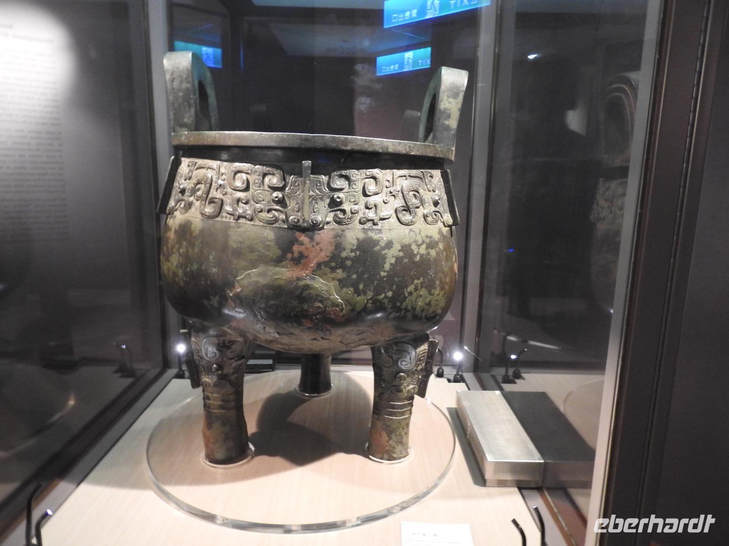Eine Steinplatte, in die das Relief eines Drachen gemeißelt ist, befindet sich zwischen den beiden Treppen, die in die Haupthalle führen. Das ist der KAISERLICHE WEG, denn nur der Kaiser und natürlich die Götter durften diesen Weg benutzen, um die Halle zu betreten, gewöhnliche Menschen hätten es nie gewagt, die Platte zu berühren. In einem Raum, in der Nähe des Ausgangs sitzt eine ältere Dame, die kunstvoll Sprüche in Kalligraphie Schrift auf rote Blättchen schreibt. Wir dürfen uns eins aussuchen und mitnehmen. Ich wähle den Spruch „alle deine Träume gehen in Erfüllung" - das wär doch mal was, oder? Von Konfuzius ist es nicht weit zum Bao-an Tempel. Er ist der bedeutendste daoistische Tempel Taipeis, gebaut im 18. Jahrhundert. Zum Mittagessen kehren wir heute in ein Restaurant im nationalen Palastmuseum ein. Typisch chinesisch sitzen wir an runden Tischen, in der Mitte ein Drehteller, auf dem die Speisen serviert werden und sich jeder nimmt, was er möchte. Zu Beginn gibt es eine Vorspeisenplatte hauptsächlich mit kaltem Geflügel. Nach und nach werden Suppe, Schweinefleisch, gebratene Auberginen, Shrimps und andere Köstlichkeiten serviert. Cucumber ist übrigens eine Gurke und Clam sind Venusmuscheln. Nun folgt die Besichtigung des Museums. Im nationalen Palastmuseum sind wertvolle Schätze ausgestellt, die zum großen Teil aus der Verbotenen Stadt in Peking stammen und von Chiang Kai Shek hierher gebracht wurden, als er vom chinesischen Festland floh. Die Sammlung umfasst Kunstwerke, die zum Teil achttausend Jahre alt sind. Eines der wertvollsten Stücke ist der Chinakohl aus Jade auf dem eine Heuschrecke sitzt (grün grün weiß weiß). Außerdem ein Stück Schweinefleisch aus Jade. Li zeigt uns mit wachsender Begeisterung die schönsten Exemplare aus Jade, Porzellan und Bronze. Anschließend haben wir eine Stunde Zeit, uns individuell umzusehen oder einen Kaffee zu trinken oder an die frische Luft zu gehen, jeder wie er will.