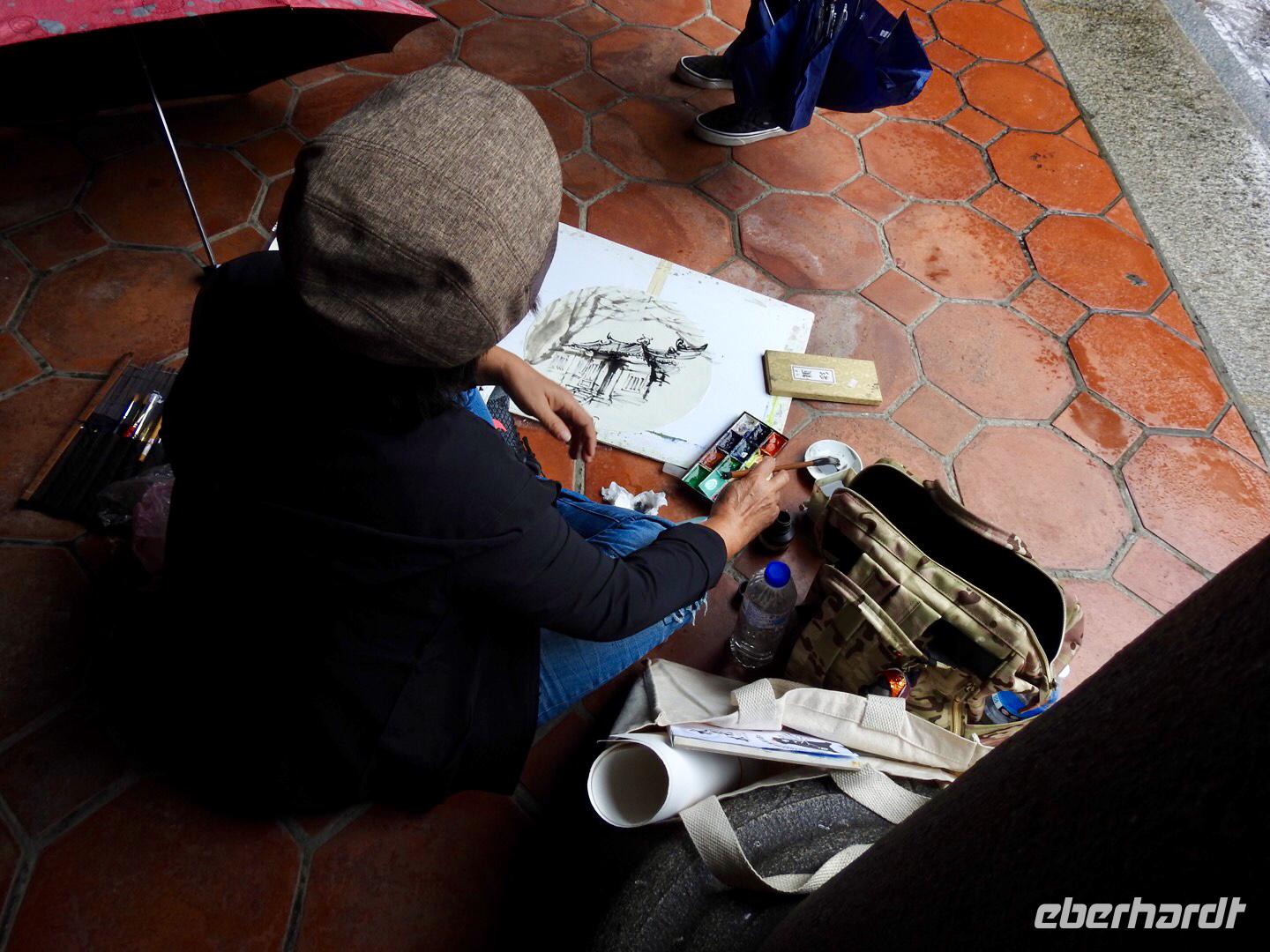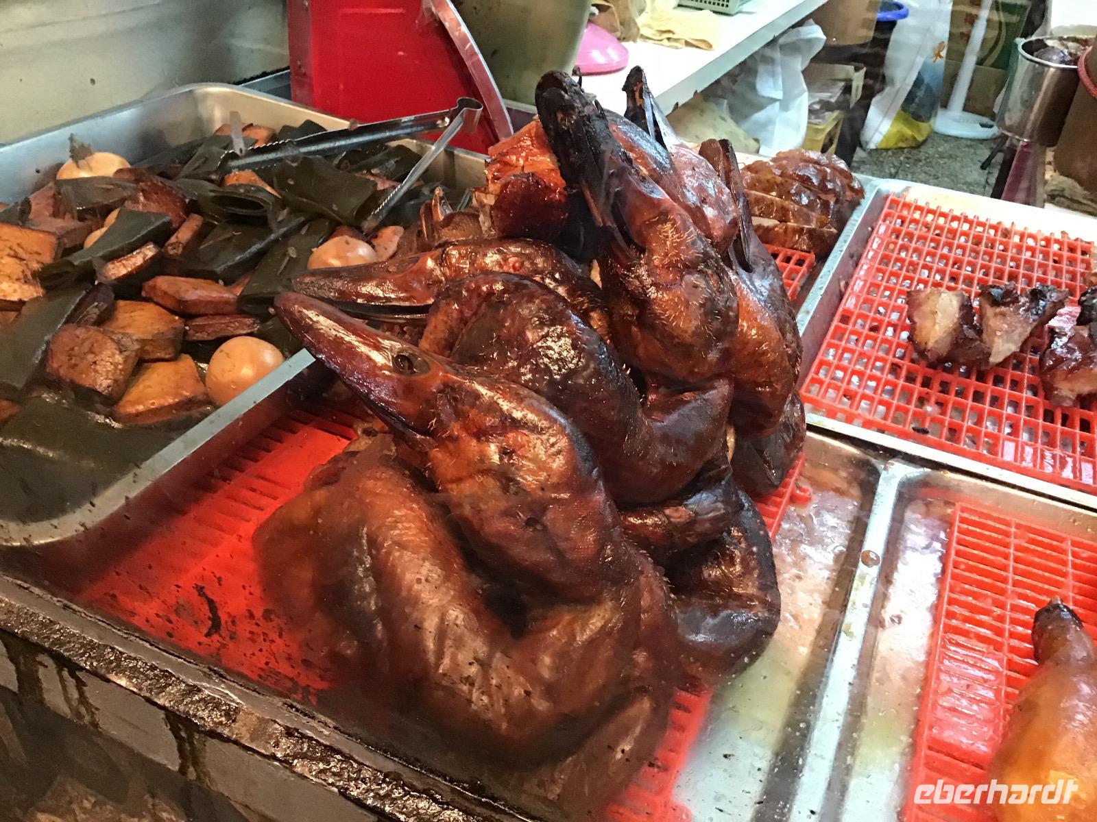 Redlich geschafft fahren wir zurück ins Hotel. Nach eineinhalb Stunden Pause ziehen wir nochmal los. Wir wollen den Nachtmarkt besuchen. Es regnet in Strömen. Wir fahren vier Station mit der U-Bahn und müssen dann noch ein Stück zu Fuß gehen. Der Markt an sich ist überdacht. Es gibt etliche Läden, auch Sexshops bieten ungeniert ihre Waren an. Der zweite Teil des Marktes, besteht ausschließlich aus Imbiss-Stuben, wo wir taiwanische Hamburger kosten. Das sind Teigtaschen gefüllt mit einem Stück Fleisch, einem Stück Speckschwarte, einem Esslöffel Zucker und grünem Gemüse. Kostet circa 1,20 €. Andere essen Suppe mit Pilzen und Fleisch. Auch gut. Als wir nach eineinhalb Stunden mit der U-Bahn zurück fahren, regnet es immer noch.