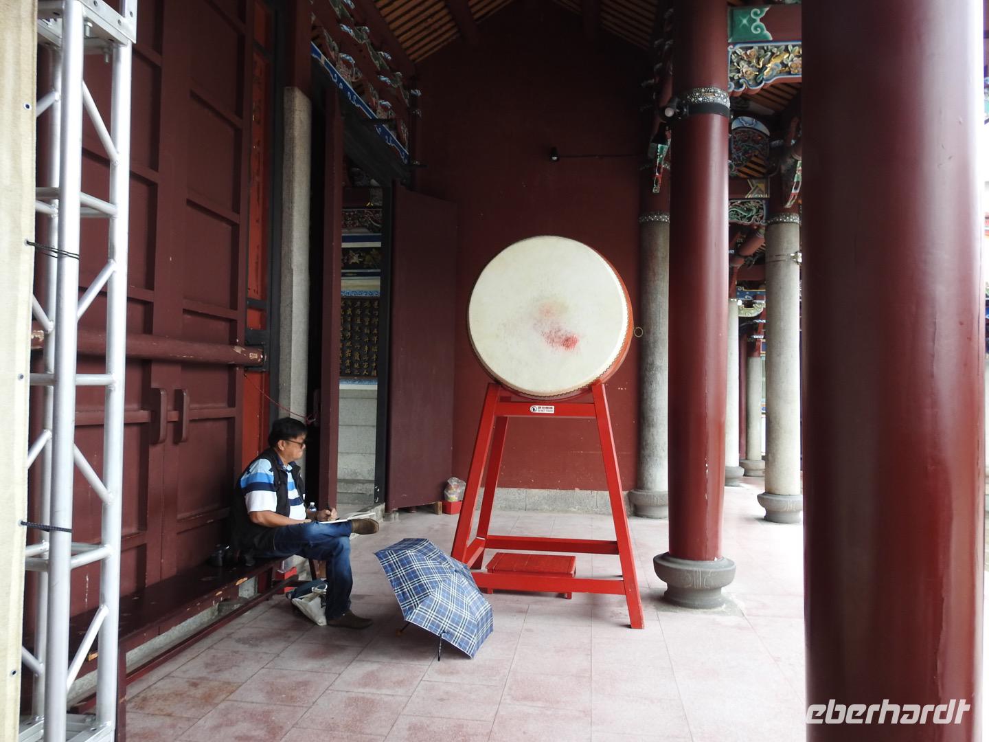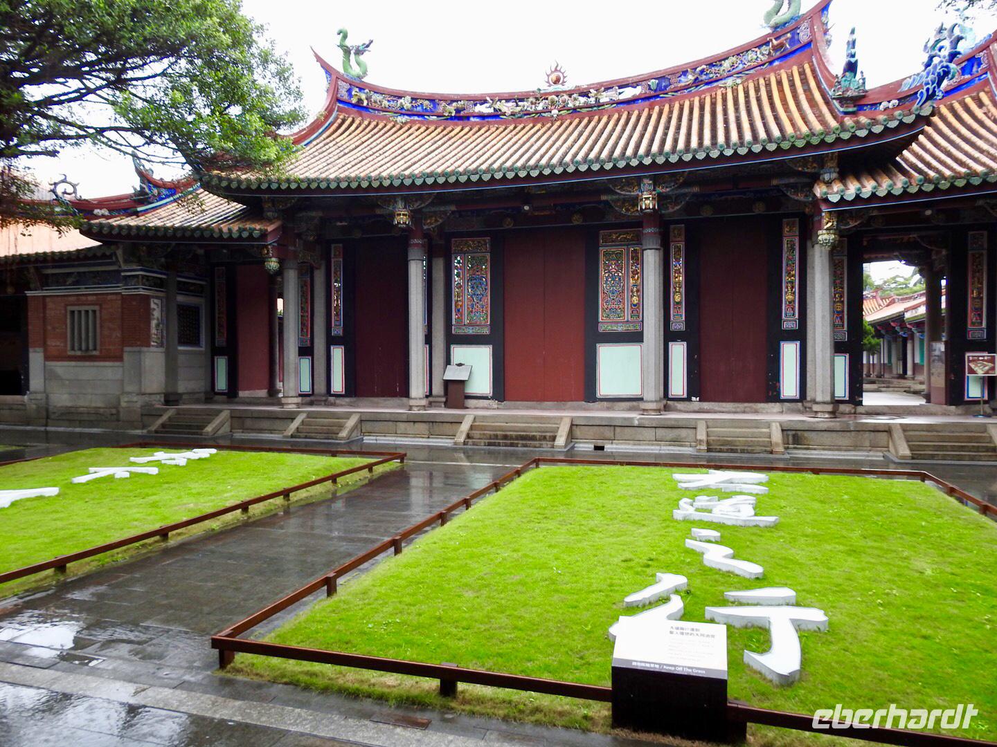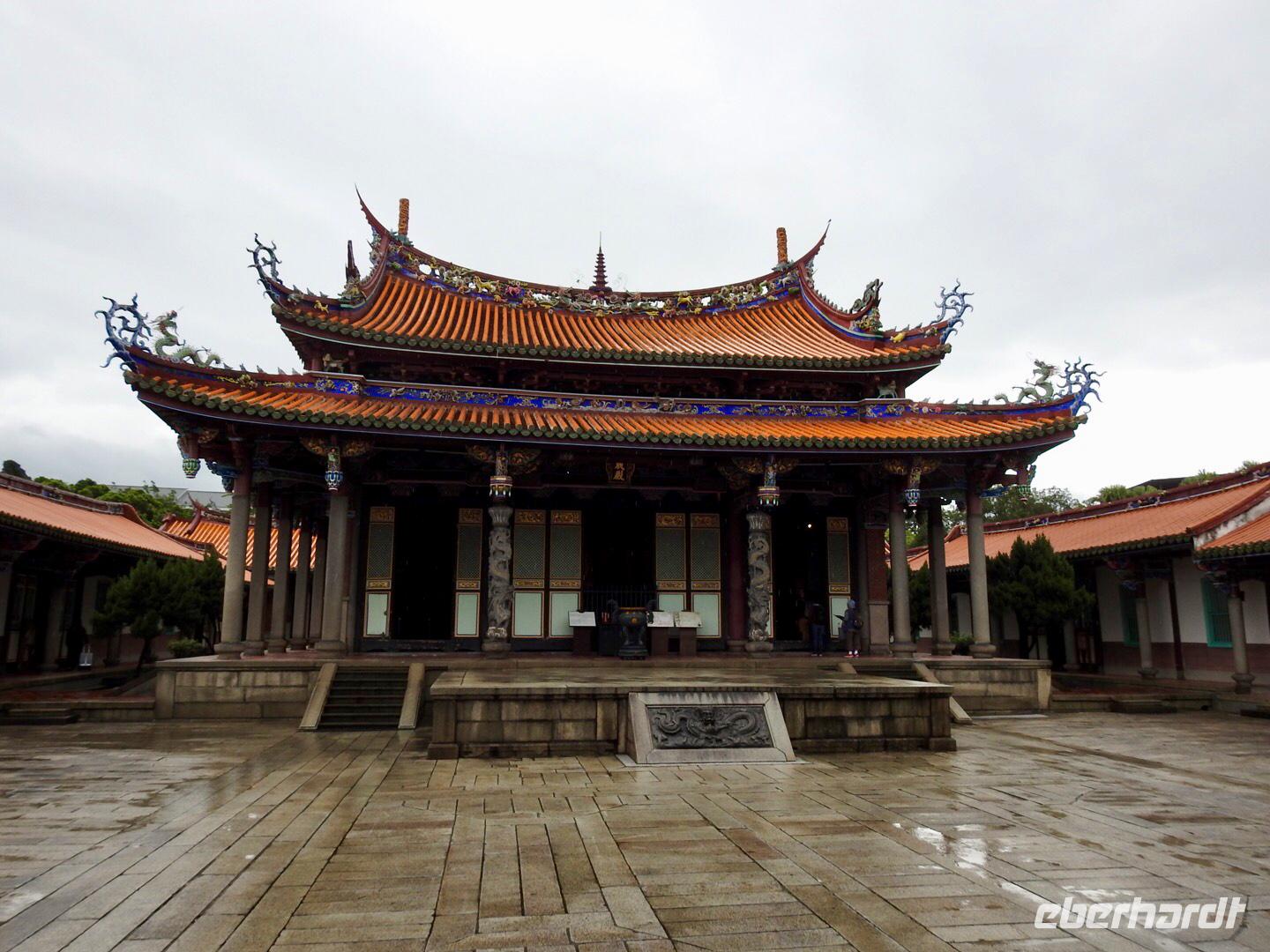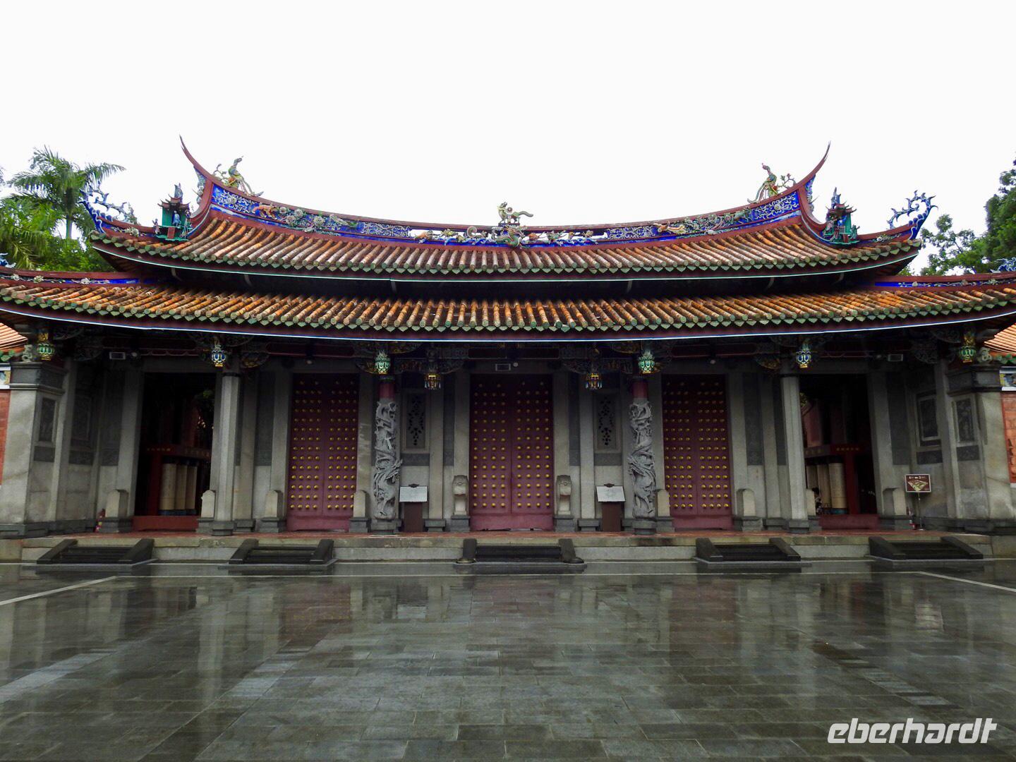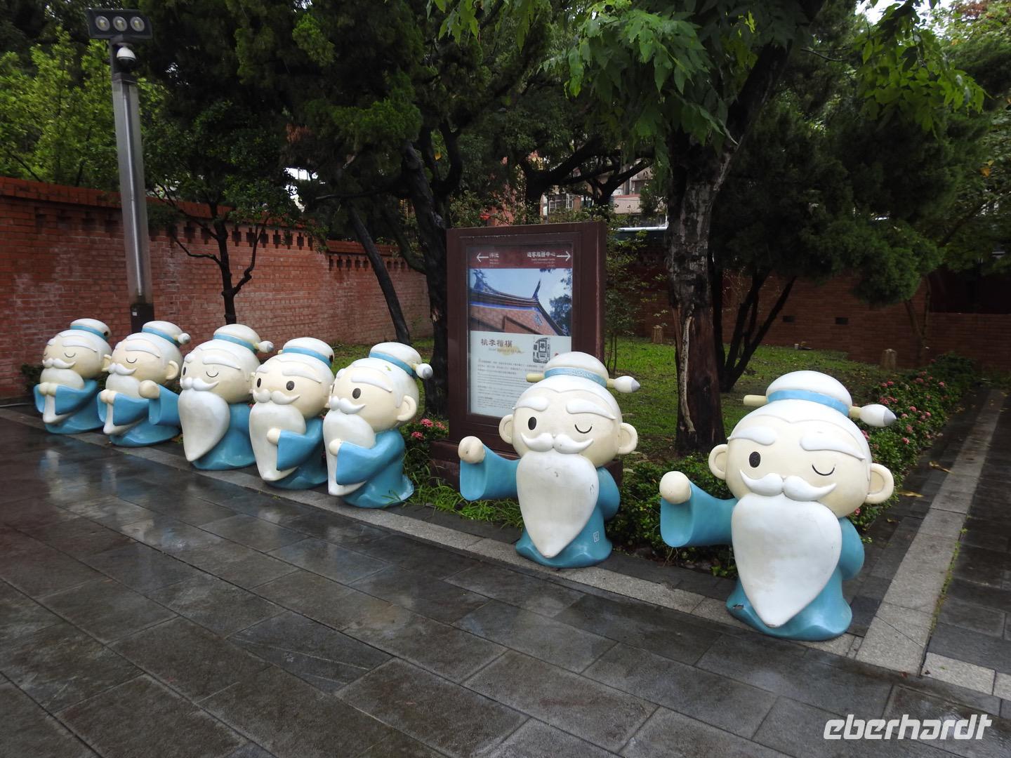 Ab sieben Uhr gibt es Frühstück, kann man machen, muss man aber nicht, der Bus fährt erst um neun ab. Laut Programm besuchen wir den Bao-an Tempel, in der Nähe befindet sich jedoch auch der Konfuzius Tempel und Li schlägt vor, dass wir diesen zuerst besuchen. Gesagt getan. Wie der Name es sagt, ehrt der Tempel Konfuzius und seine Lehre. Wichtig ist, dass wir den Tempel durch die rechte Tür betreten und durch die linke Tür verlassen, so wie es in Taiwan üblich ist. Die mittelere Tür wird nicht genutzt, auch wenn sie offen ist. Sie ist den Tempelgöttern vorbehalten. Den Tempel schmückt ein wunderschönes Dach mit geschnitzten Drachen. In der Mitte des Daches befinden sich eine Art Zylinder. Hinter diesen, in einem Geheimfach, haben lerneifrige Studenten ihre Bücher versteckt, als der erste Chin-Kaiser Gelehrte töten und Bücher verbrennen ließ, vor lauter Angst vor seinem gebildeten Volk. Im Tempel sind Räumlichkeiten angelegt, die wie in einem Museum, über Konfuzius berichten.
