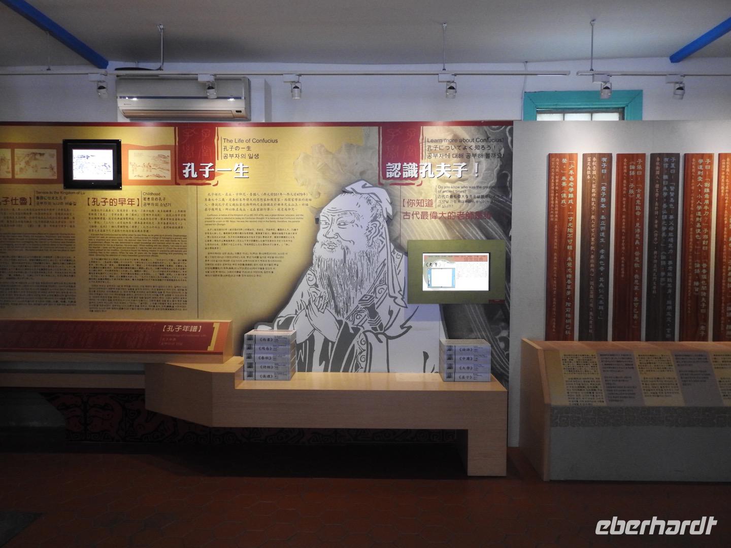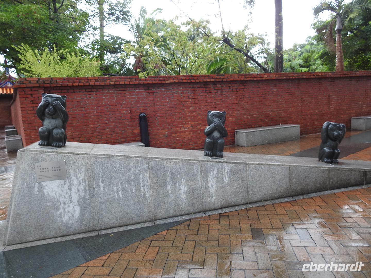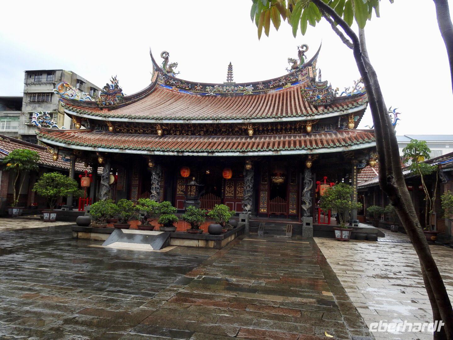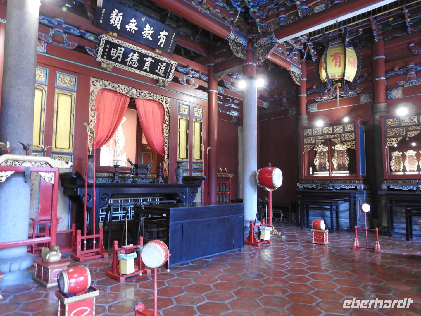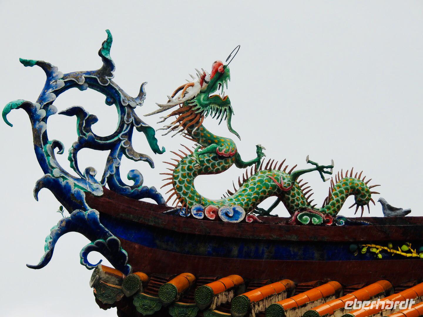 Ab sieben Uhr gibt es Frühstück, kann man machen, muss man aber nicht, der Bus fährt erst um neun ab. Laut Programm besuchen wir den Bao-an Tempel, in der Nähe befindet sich jedoch auch der Konfuzius Tempel und Li schlägt vor, dass wir diesen zuerst besuchen. Gesagt getan. Wie der Name es sagt, ehrt der Tempel Konfuzius und seine Lehre. Wichtig ist, dass wir den Tempel durch die rechte Tür betreten und durch die linke Tür verlassen, so wie es in Taiwan üblich ist. Die mittelere Tür wird nicht genutzt, auch wenn sie offen ist. Sie ist den Tempelgöttern vorbehalten. Den Tempel schmückt ein wunderschönes Dach mit geschnitzten Drachen. In der Mitte des Daches befinden sich eine Art Zylinder. Hinter diesen, in einem Geheimfach, haben lerneifrige Studenten ihre Bücher versteckt, als der erste Chin-Kaiser Gelehrte töten und Bücher verbrennen ließ, vor lauter Angst vor seinem gebildeten Volk. Im Tempel sind Räumlichkeiten angelegt, die wie in einem Museum, über Konfuzius berichten.