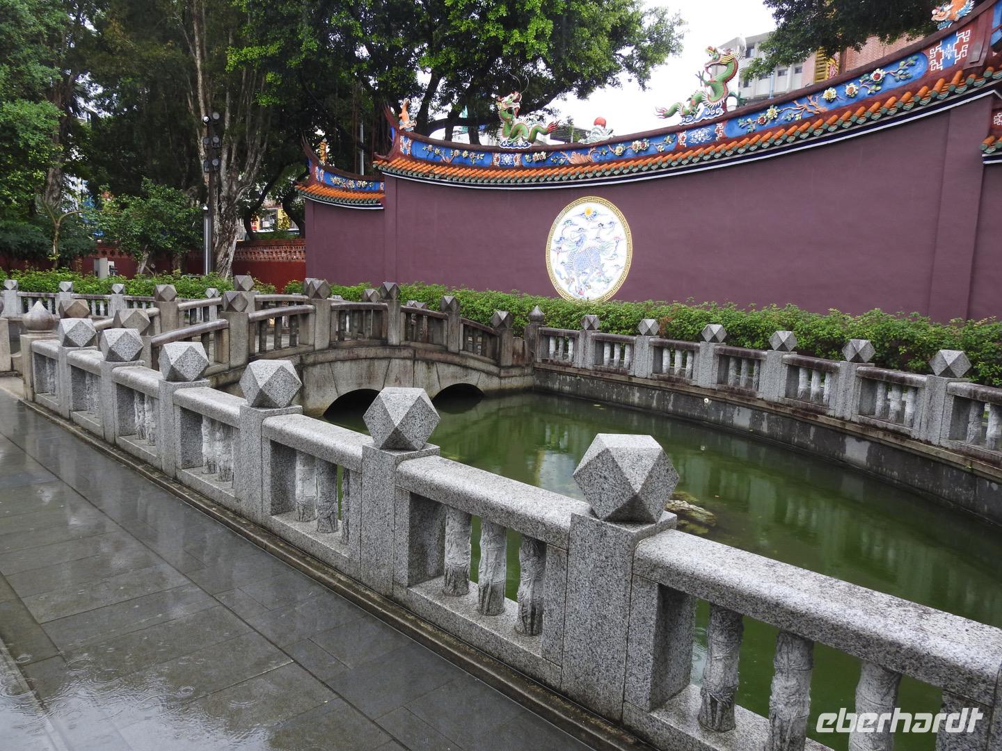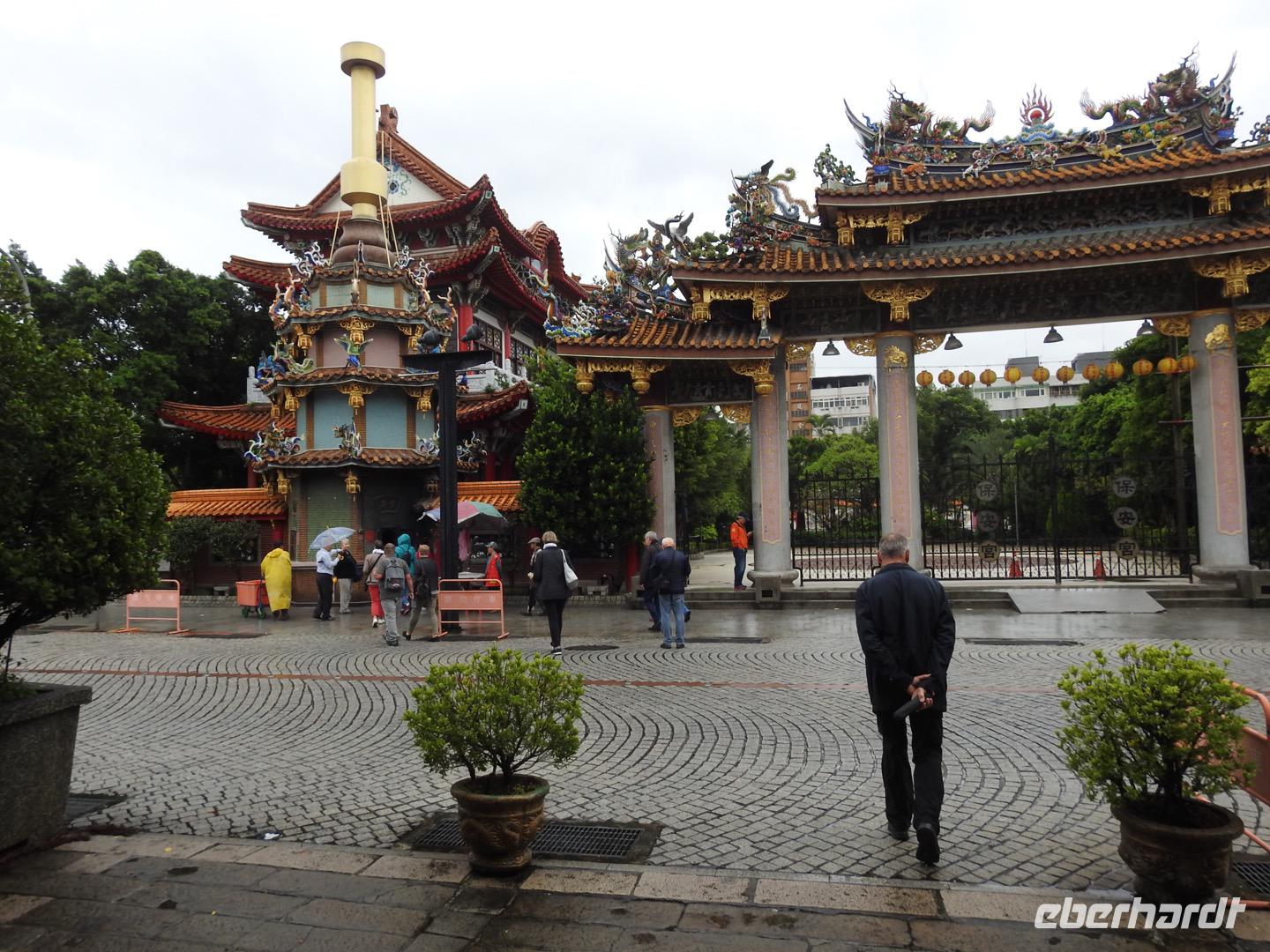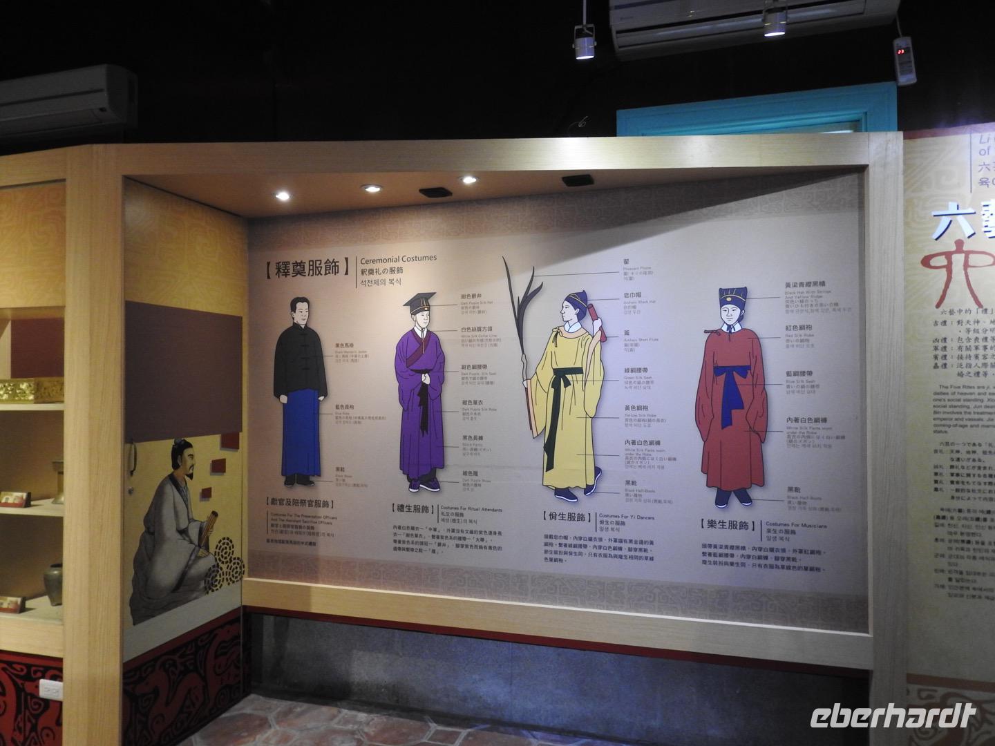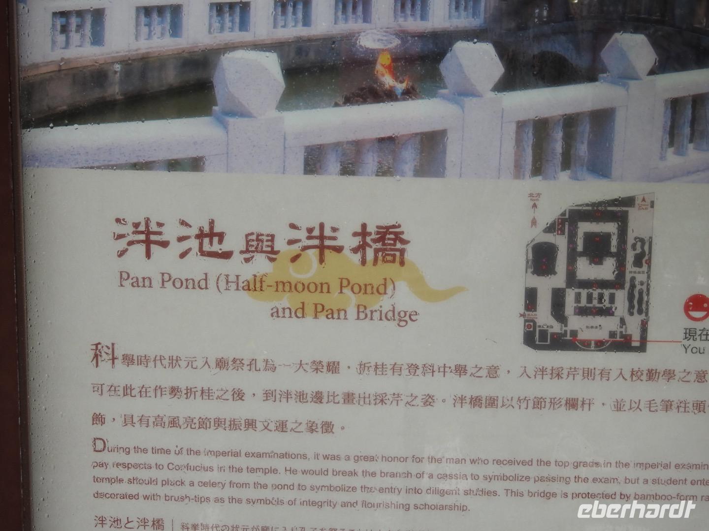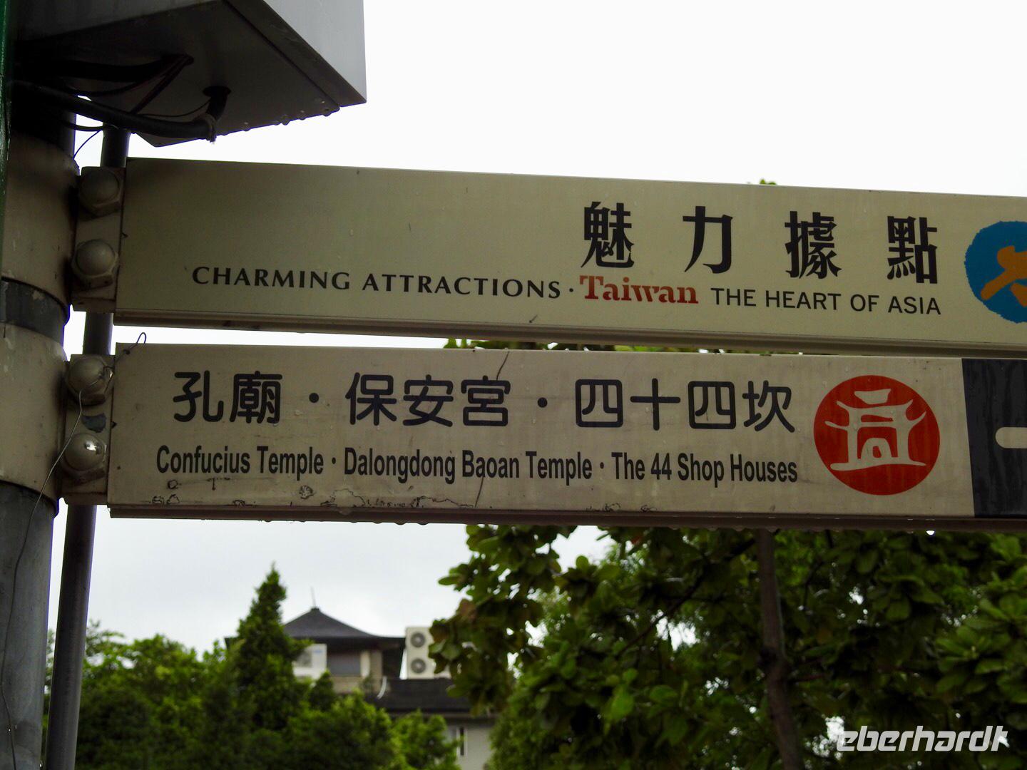 Ab sieben Uhr gibt es Frühstück, kann man machen, muss man aber nicht, der Bus fährt erst um neun ab. Laut Programm besuchen wir den Bao-an Tempel, in der Nähe befindet sich jedoch auch der Konfuzius Tempel und Li schlägt vor, dass wir diesen zuerst besuchen. Gesagt getan. Wie der Name es sagt, ehrt der Tempel Konfuzius und seine Lehre. Wichtig ist, dass wir den Tempel durch die rechte Tür betreten und durch die linke Tür verlassen, so wie es in Taiwan üblich ist. Die mittelere Tür wird nicht genutzt, auch wenn sie offen ist. Sie ist den Tempelgöttern vorbehalten. Den Tempel schmückt ein wunderschönes Dach mit geschnitzten Drachen. In der Mitte des Daches befinden sich eine Art Zylinder. Hinter diesen, in einem Geheimfach, haben lerneifrige Studenten ihre Bücher versteckt, als der erste Chin-Kaiser Gelehrte töten und Bücher verbrennen ließ, vor lauter Angst vor seinem gebildeten Volk. Im Tempel sind Räumlichkeiten angelegt, die wie in einem Museum, über Konfuzius berichten.
