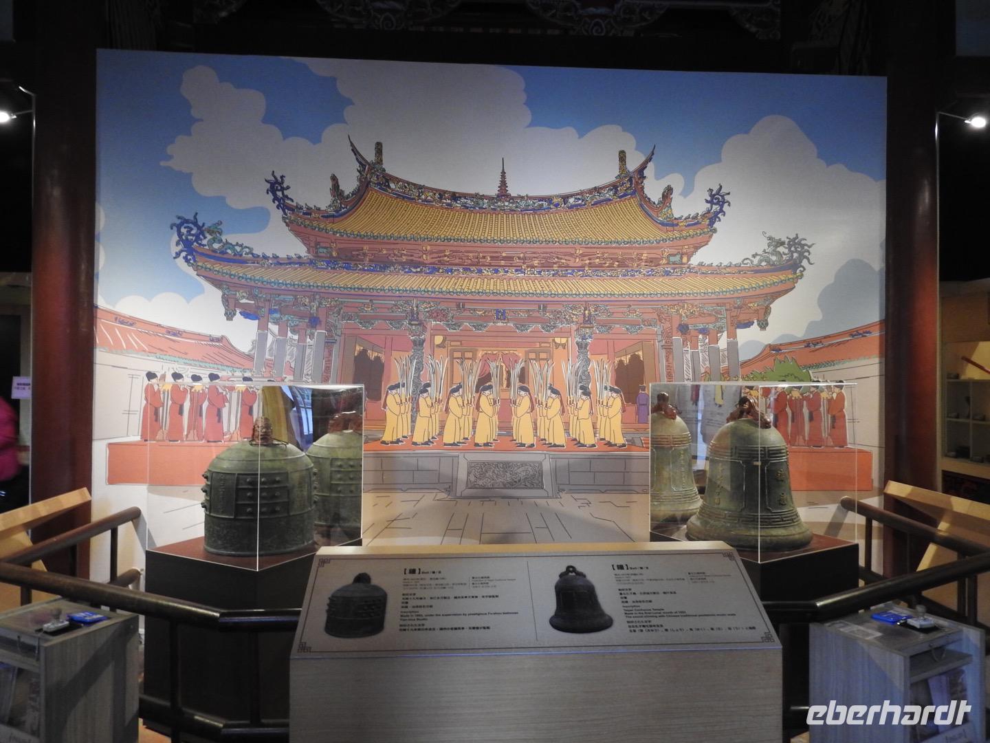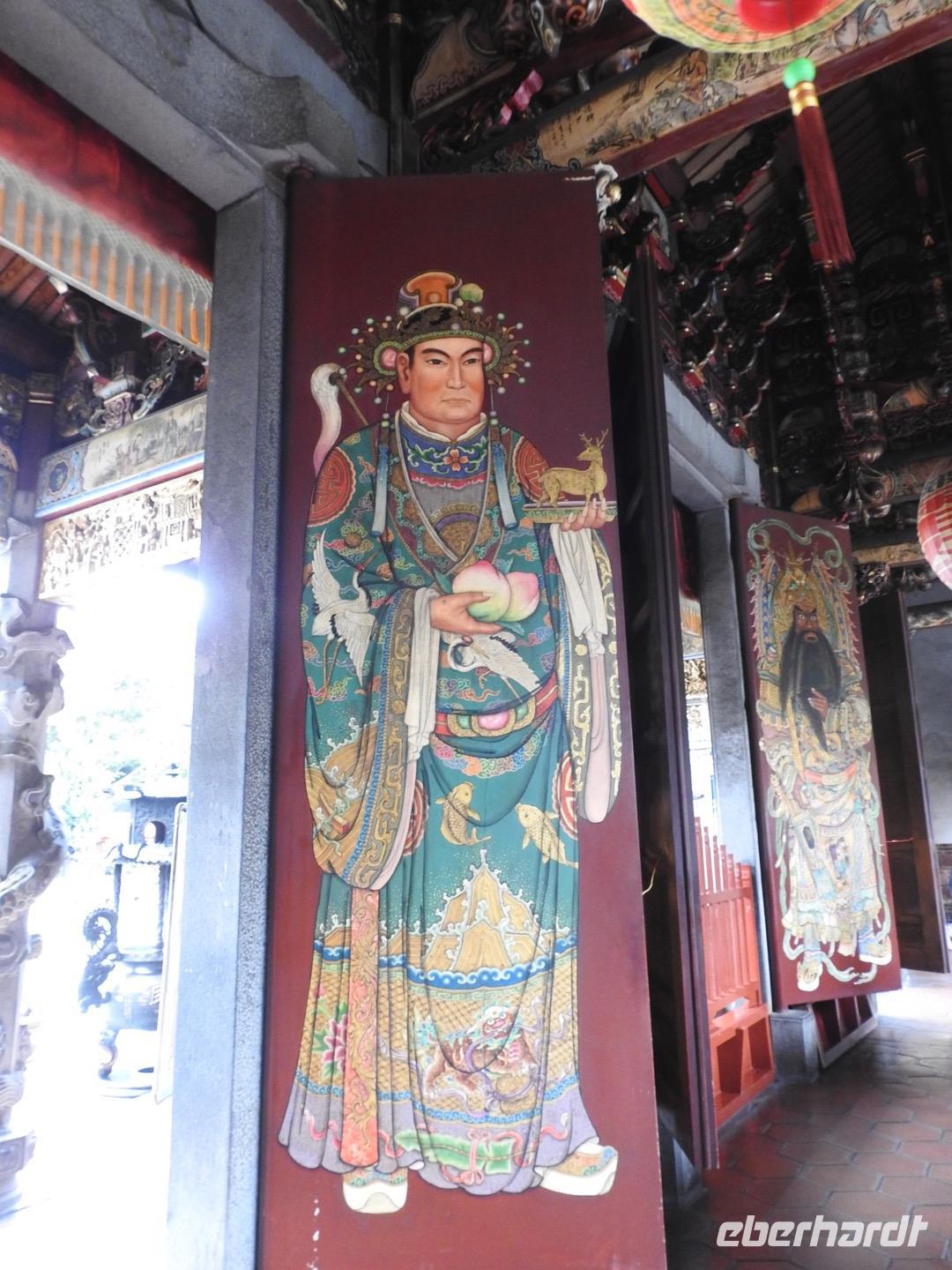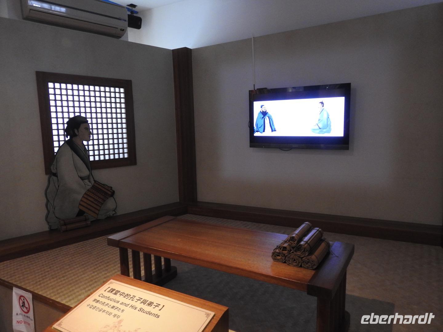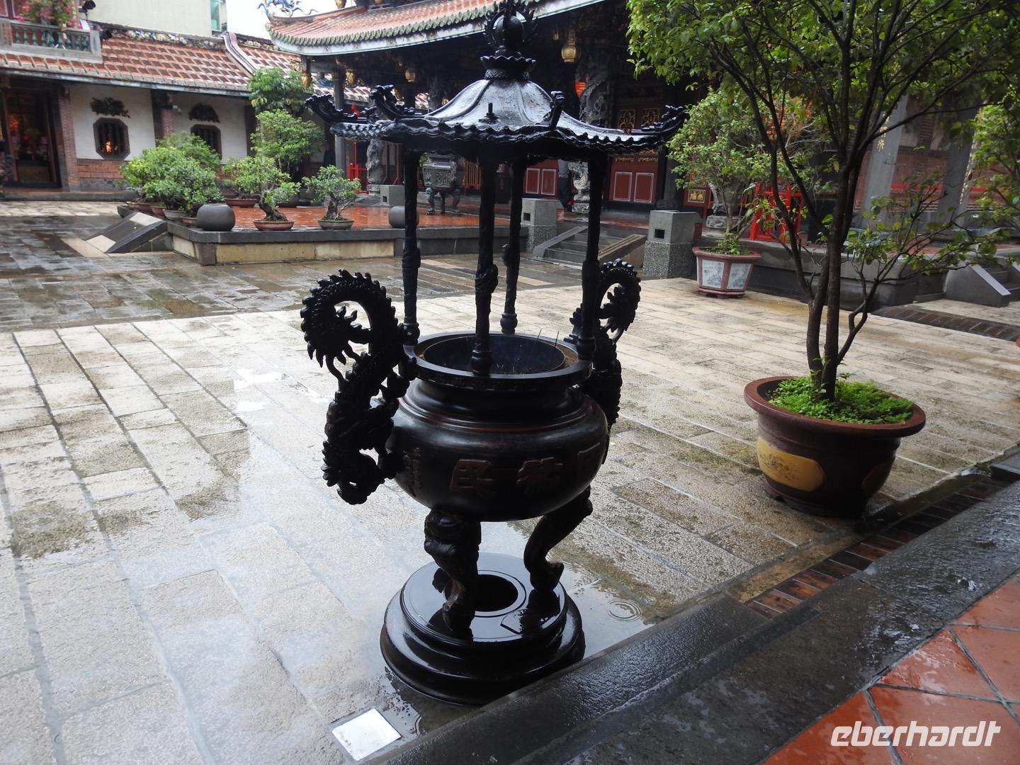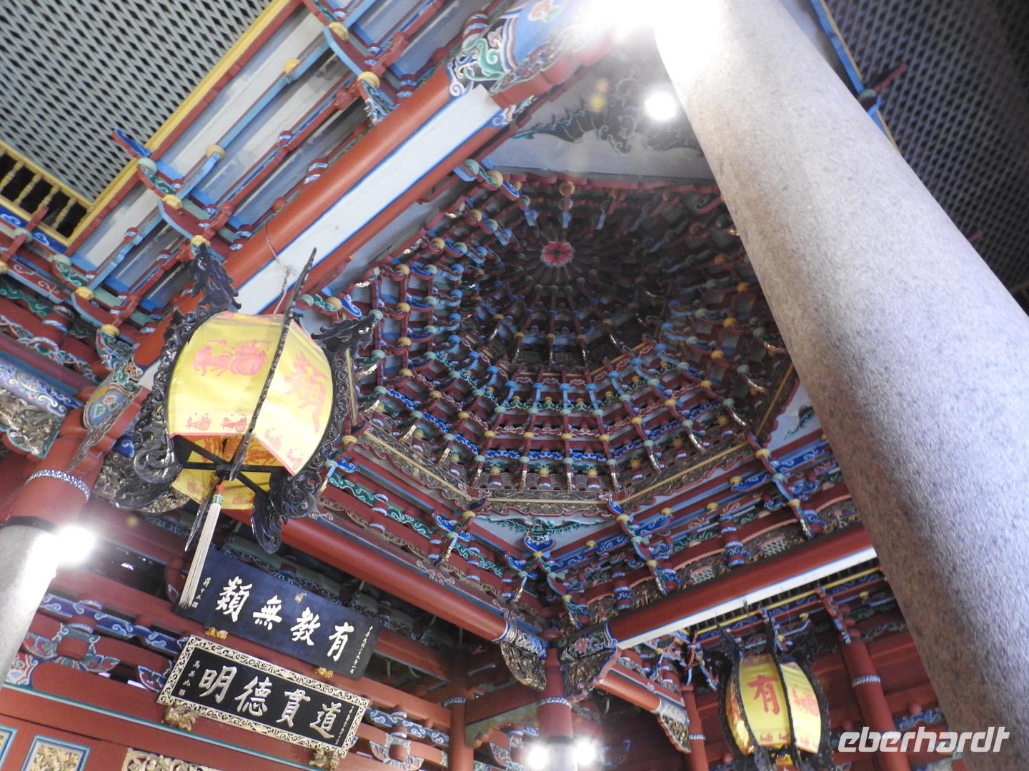Ab sieben Uhr gibt es Frühstück, kann man machen, muss man aber nicht, der Bus fährt erst um neun ab. Laut Programm besuchen wir den Bao-an Tempel, in der Nähe befindet sich jedoch auch der Konfuzius Tempel und Li schlägt vor, dass wir diesen zuerst besuchen. Gesagt getan. Wie der Name es sagt, ehrt der Tempel Konfuzius und seine Lehre. Wichtig ist, dass wir den Tempel durch die rechte Tür betreten und durch die linke Tür verlassen, so wie es in Taiwan üblich ist. Die mittelere Tür wird nicht genutzt, auch wenn sie offen ist. Sie ist den Tempelgöttern vorbehalten. Den Tempel schmückt ein wunderschönes Dach mit geschnitzten Drachen. In der Mitte des Daches befinden sich eine Art Zylinder. Hinter diesen, in einem Geheimfach, haben lerneifrige Studenten ihre Bücher versteckt, als der erste Chin-Kaiser Gelehrte töten und Bücher verbrennen ließ, vor lauter Angst vor seinem gebildeten Volk. Im Tempel sind Räumlichkeiten angelegt, die wie in einem Museum, über Konfuzius berichten.