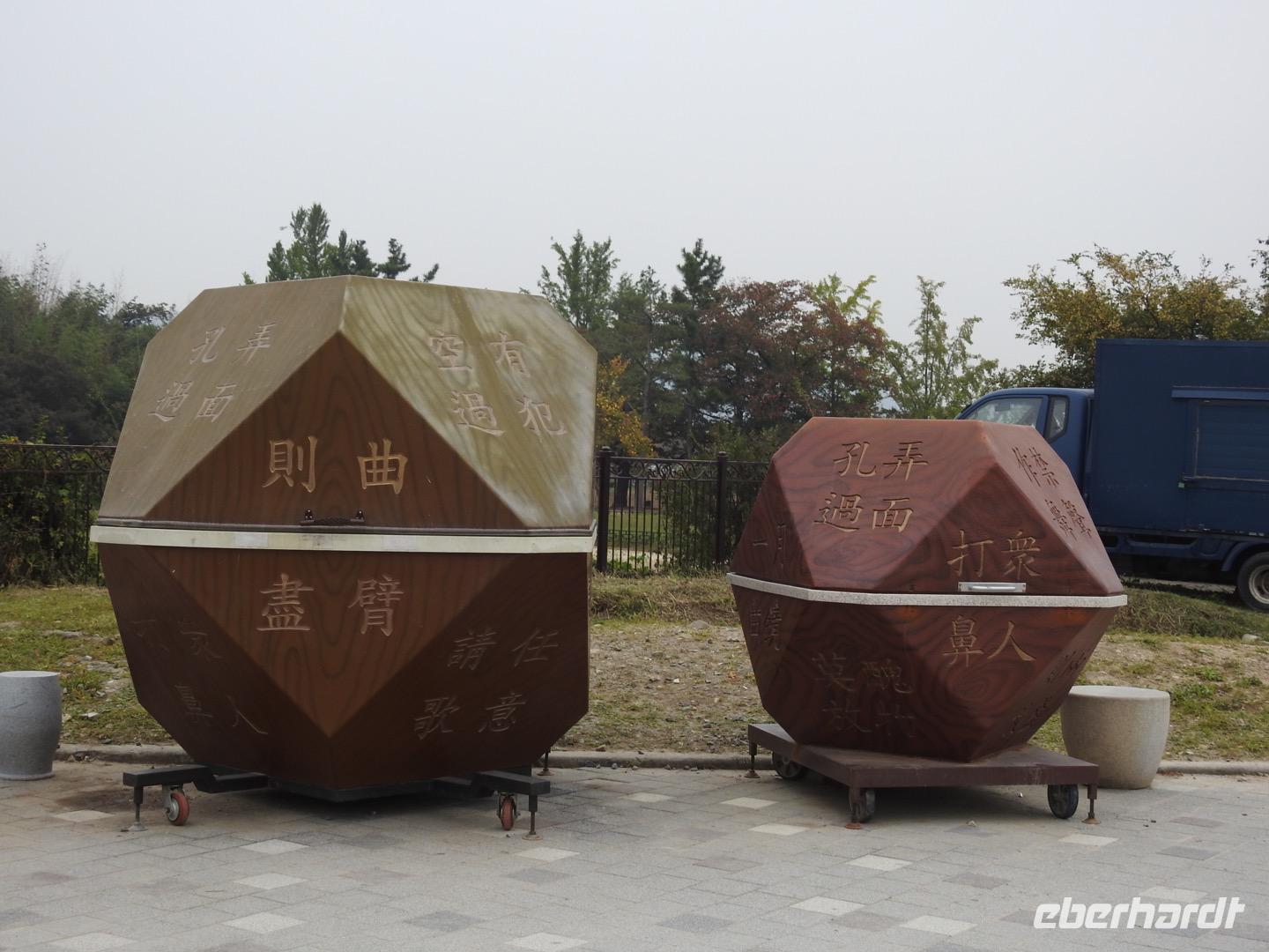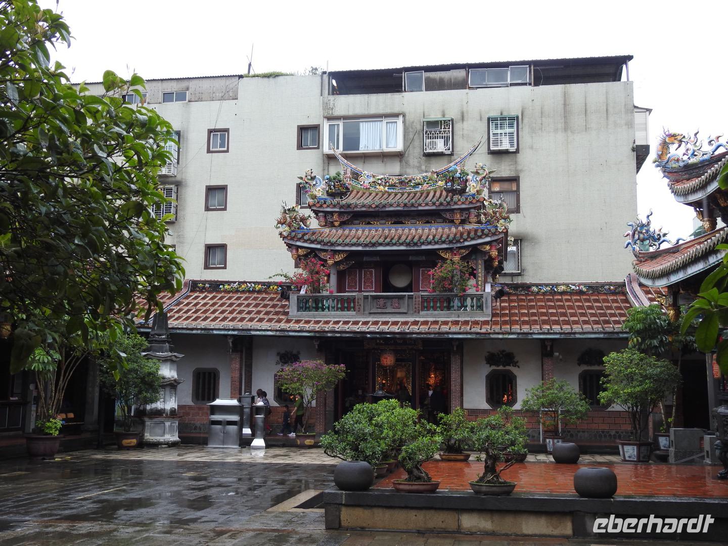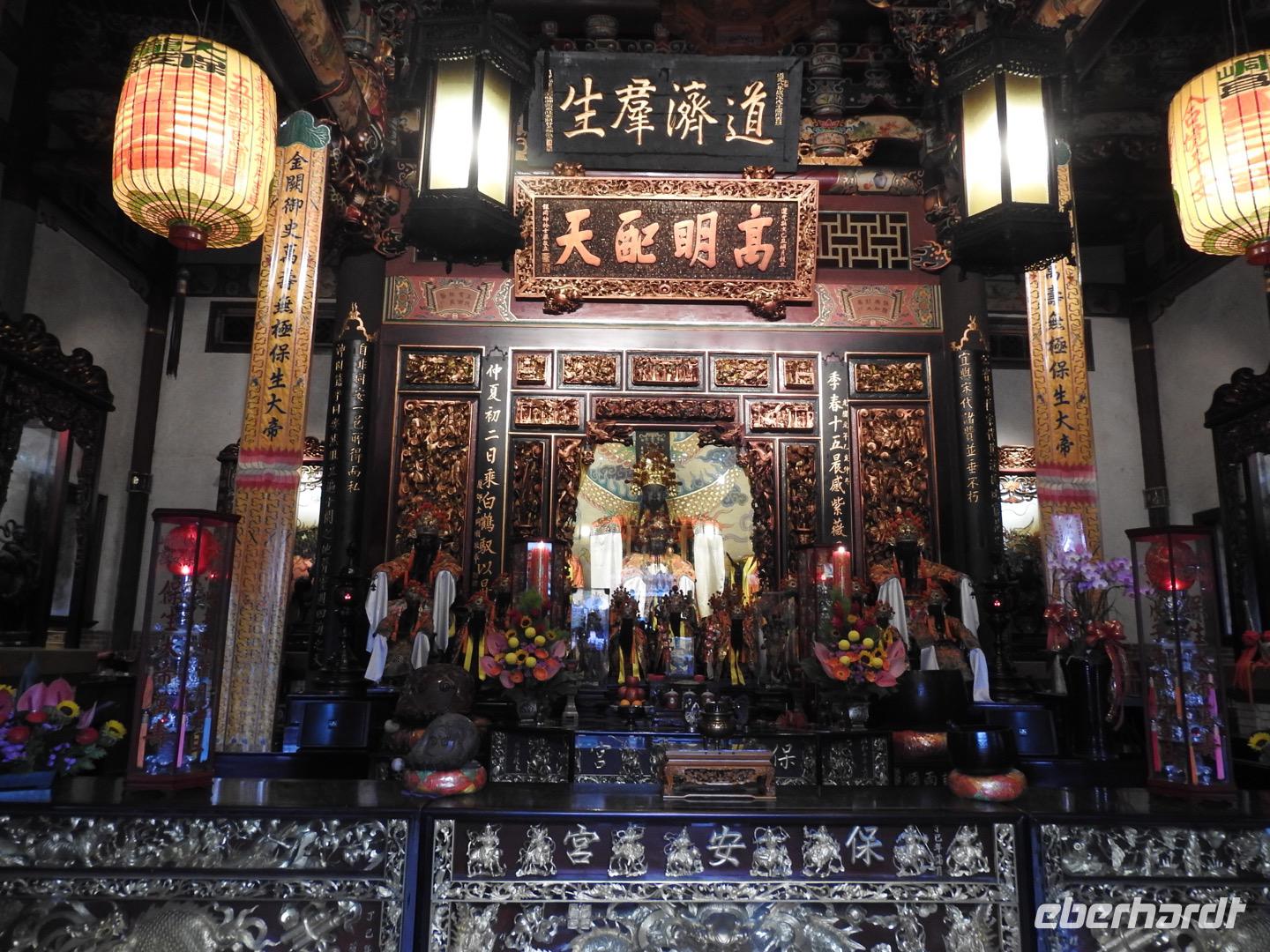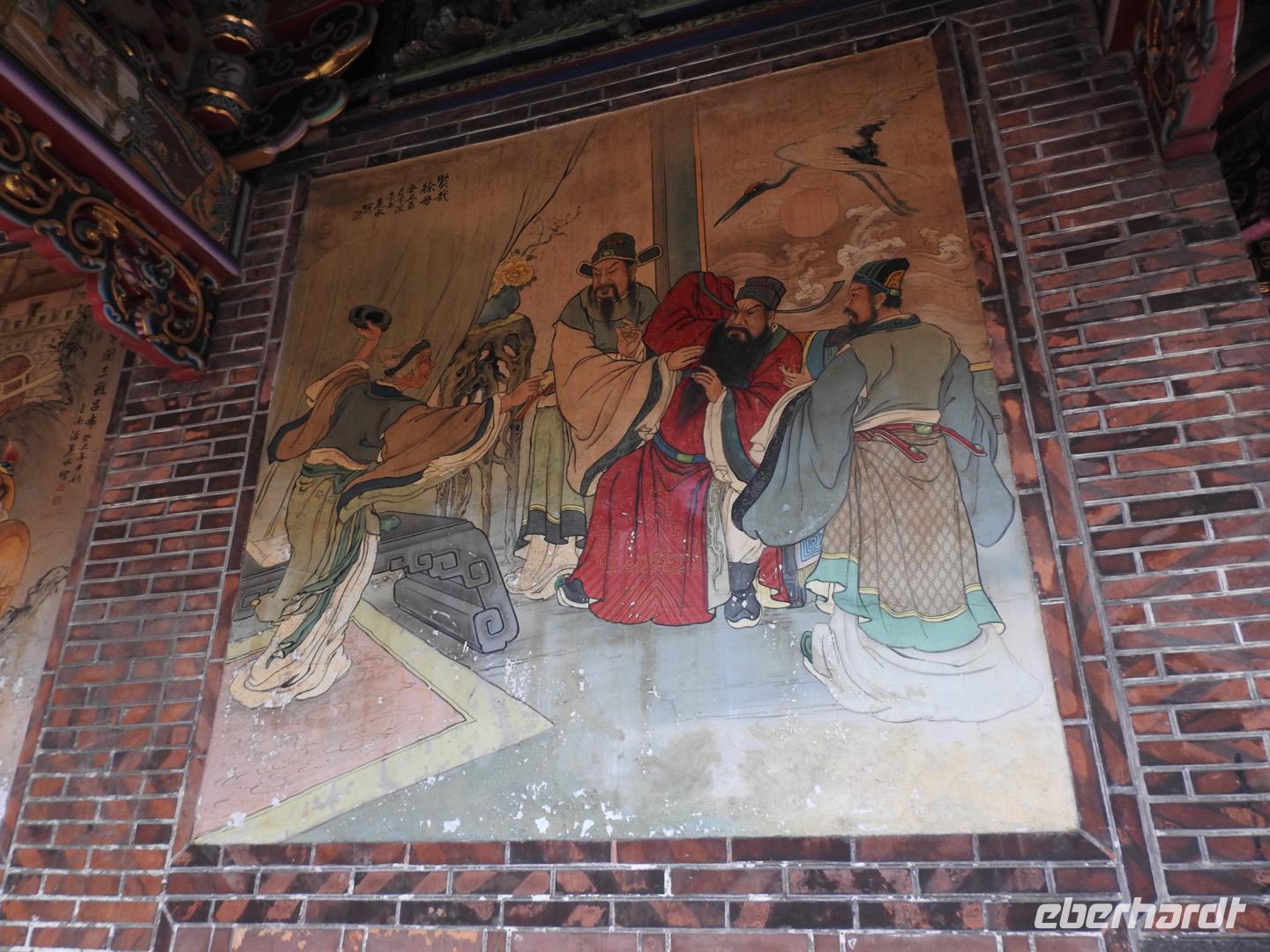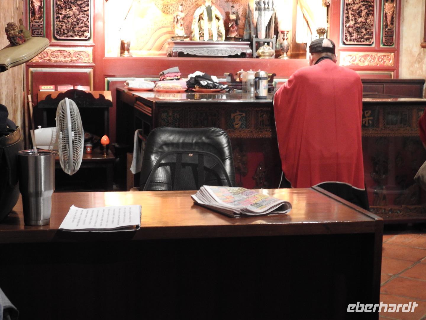 Ab sieben Uhr gibt es Frühstück, kann man machen, muss man aber nicht, der Bus fährt erst um neun ab. Laut Programm besuchen wir den Bao-an Tempel, in der Nähe befindet sich jedoch auch der Konfuzius Tempel und Li schlägt vor, dass wir diesen zuerst besuchen. Gesagt getan. Wie der Name es sagt, ehrt der Tempel Konfuzius und seine Lehre. Wichtig ist, dass wir den Tempel durch die rechte Tür betreten und durch die linke Tür verlassen, so wie es in Taiwan üblich ist. Die mittelere Tür wird nicht genutzt, auch wenn sie offen ist. Sie ist den Tempelgöttern vorbehalten. Den Tempel schmückt ein wunderschönes Dach mit geschnitzten Drachen. In der Mitte des Daches befinden sich eine Art Zylinder. Hinter diesen, in einem Geheimfach, haben lerneifrige Studenten ihre Bücher versteckt, als der erste Chin-Kaiser Gelehrte töten und Bücher verbrennen ließ, vor lauter Angst vor seinem gebildeten Volk. Im Tempel sind Räumlichkeiten angelegt, die wie in einem Museum, über Konfuzius berichten.