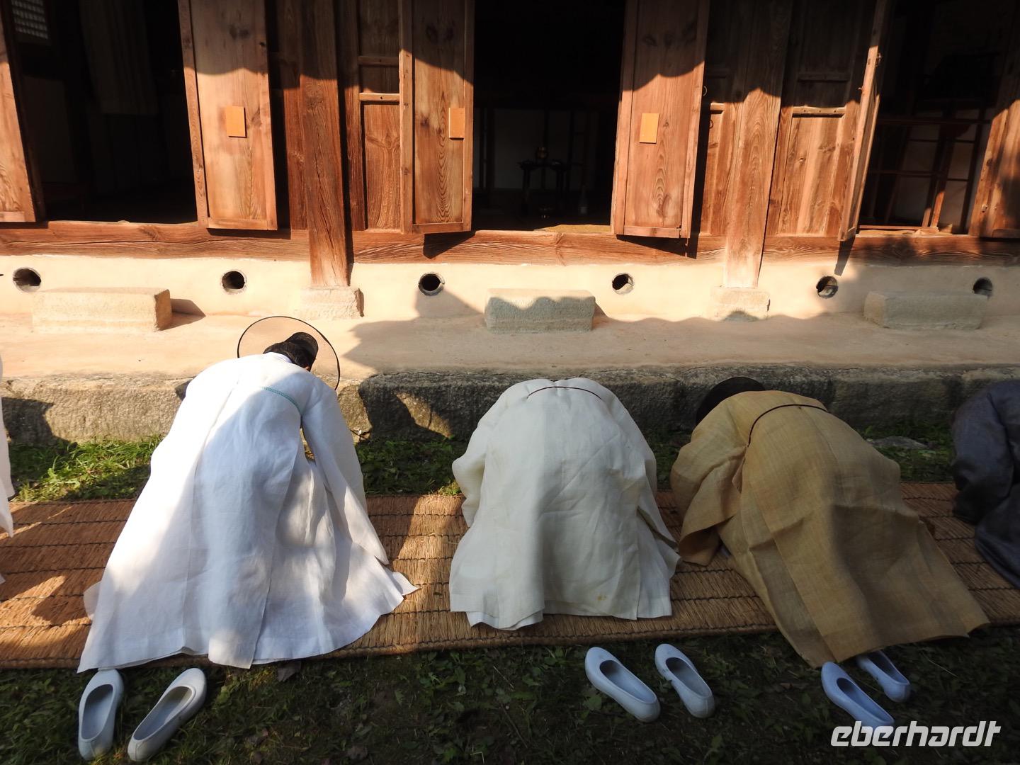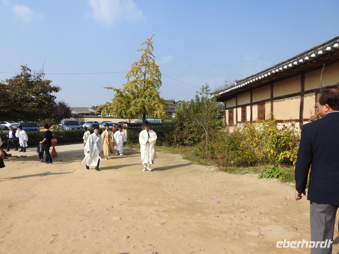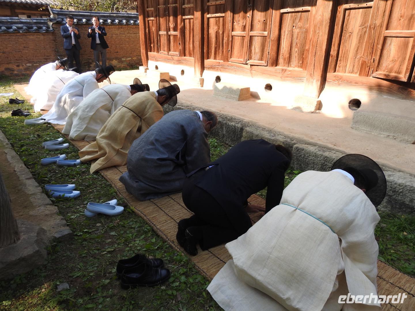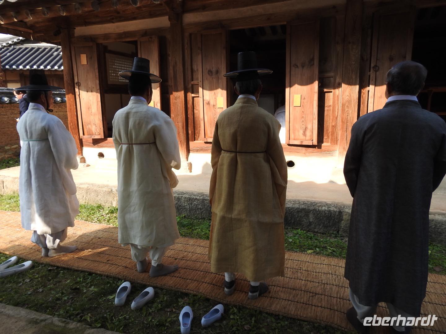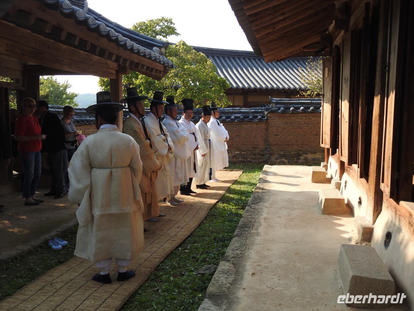 Wir besuchen das Hahoe-Dorf in Andong. Es scheint als wären wir die einzigen Gäste heute. Die Suche nach einem schnellen und preiswerten Mittagessen gestaltet sich komplizierter als gedacht, dennoch können wir uns bald an einer leckeren und liebevoll zubereiteten Nudelsuppe laben. Nun beginnt unser Rundgang durch das Hahoe-Dorf, dass seit 600 Jahren von einer einzigen Familie bewohnt wird. Heute muss man, wenn man das Dorf besichtigen will, Eintritt bezahlen. Viele Häuser stehen leer, einige sind noch bewohnt. Uns erwartet ein besonderes Erlebnis. Zwei Männer, die aus diesem Dorf stammen, sind kürzlich zu Bürgermeistern gewählt worden. Heute sind sie nach Hause gekommen, um ihren Ahnen für ihren Erfolg zu danken. Dies erfolgt in einer Zeremonie im Geisthaus. Als sie mitbekommen, dass wir ihnen mit unseren Fotoapparaten auf den Fersen sind, laden sie uns freundlich ein, an der Zeremonie teilzunehmen. Die Männer sind in traditionelle Kittel gekleidet und außer den Bürgermeistern sind noch einige andere, ähnlich gekleidete, Männer anwesend. Sie nehmen barfuß auf einer Strohmatte vor dem Geisthaus Aufstellung. Drinnen werden Räucherstäbchen angezündet, eine Obstschale ist aufgestellt und per Gesang und vielen Verbeugungen werden die Ahnen informiert. Nach der Zeremonie verlassen die Männer ganz unspektakulär das Gelände und es wird aufgeräumt. Als die Obstschale weggetragen wird, dürfen wir von den Opfergaben naschen.
