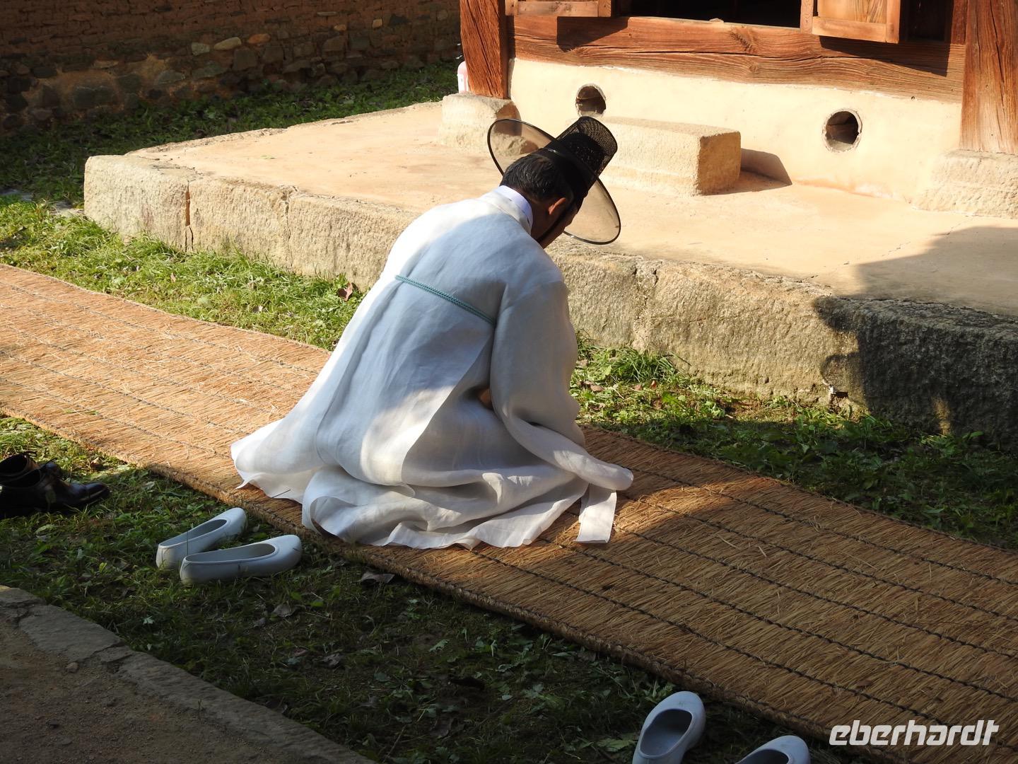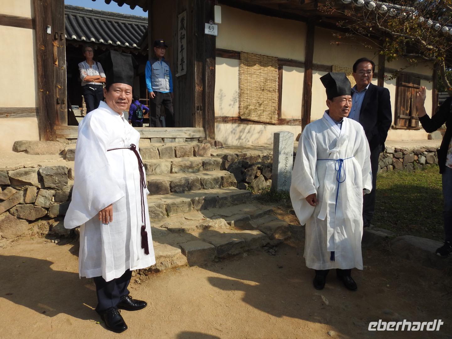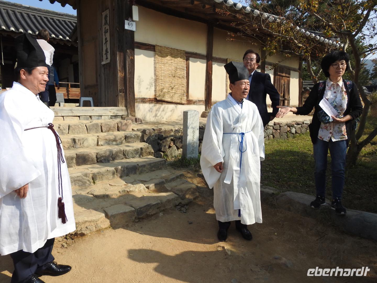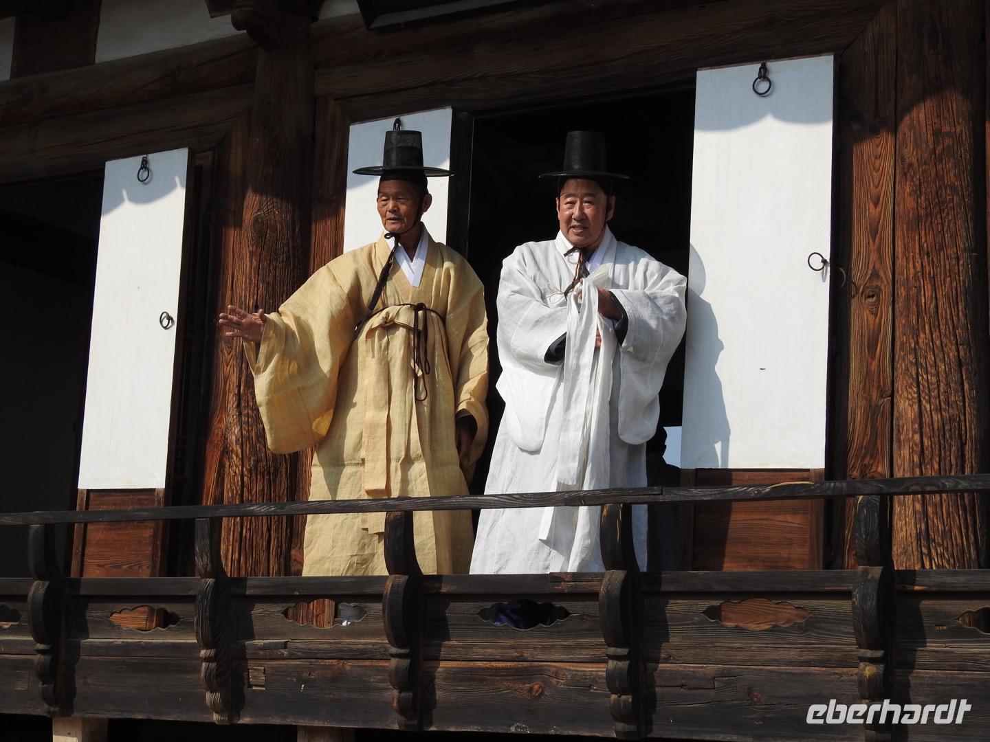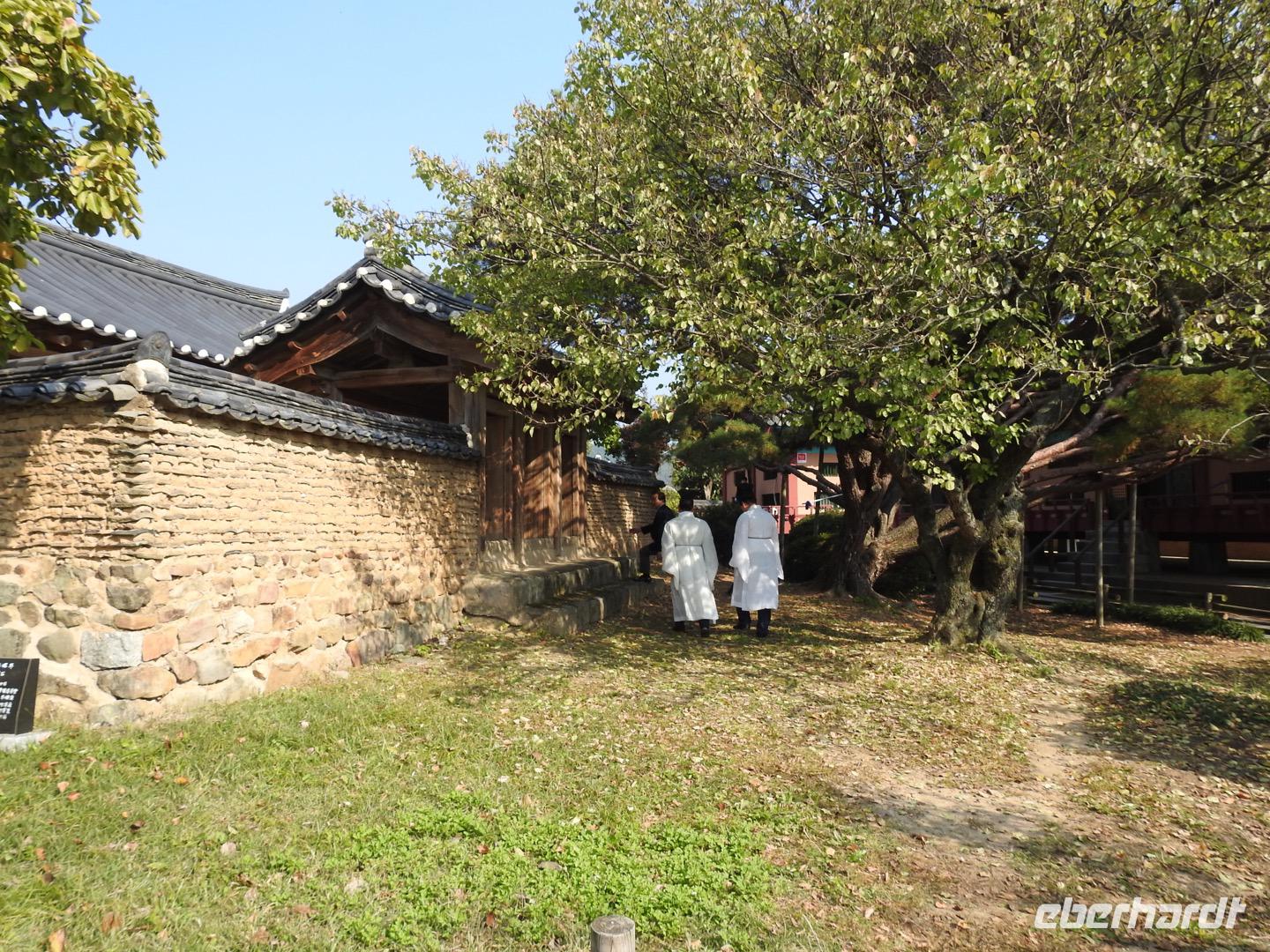 Wir besuchen das Hahoe-Dorf in Andong. Es scheint als wären wir die einzigen Gäste heute. Die Suche nach einem schnellen und preiswerten Mittagessen gestaltet sich komplizierter als gedacht, dennoch können wir uns bald an einer leckeren und liebevoll zubereiteten Nudelsuppe laben. Nun beginnt unser Rundgang durch das Hahoe-Dorf, dass seit 600 Jahren von einer einzigen Familie bewohnt wird. Heute muss man, wenn man das Dorf besichtigen will, Eintritt bezahlen. Viele Häuser stehen leer, einige sind noch bewohnt. Uns erwartet ein besonderes Erlebnis. Zwei Männer, die aus diesem Dorf stammen, sind kürzlich zu Bürgermeistern gewählt worden. Heute sind sie nach Hause gekommen, um ihren Ahnen für ihren Erfolg zu danken. Dies erfolgt in einer Zeremonie im Geisthaus. Als sie mitbekommen, dass wir ihnen mit unseren Fotoapparaten auf den Fersen sind, laden sie uns freundlich ein, an der Zeremonie teilzunehmen. Die Männer sind in traditionelle Kittel gekleidet und außer den Bürgermeistern sind noch einige andere, ähnlich gekleidete, Männer anwesend. Sie nehmen barfuß auf einer Strohmatte vor dem Geisthaus Aufstellung. Drinnen werden Räucherstäbchen angezündet, eine Obstschale ist aufgestellt und per Gesang und vielen Verbeugungen werden die Ahnen informiert. Nach der Zeremonie verlassen die Männer ganz unspektakulär das Gelände und es wird aufgeräumt. Als die Obstschale weggetragen wird, dürfen wir von den Opfergaben naschen.